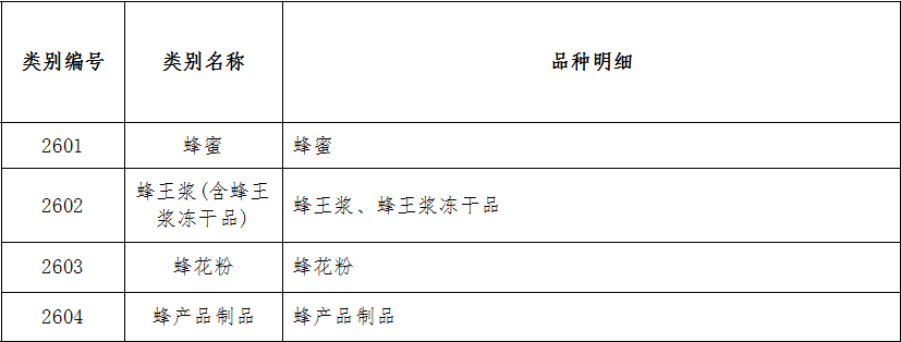 蜂產(chǎn)品類別編號(hào)及類別名稱:2601蜂蜜;2602蜂王漿(含蜂王漿凍干品);2603蜂花粉;2604蜂產(chǎn)品制品