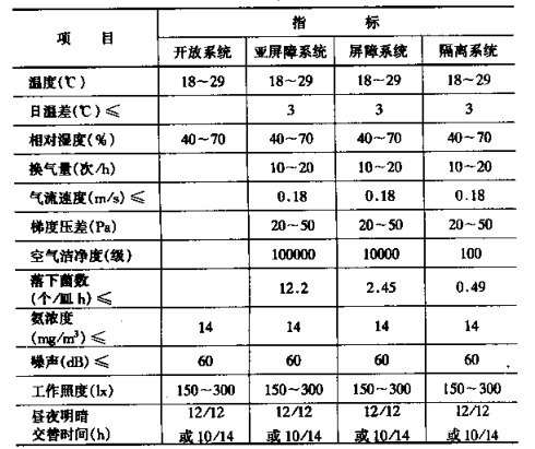 噪聲可使動物受到刺激而引起緊張,導致不安和騷動。即使短暫的噪聲也能在動物的行為和生理上引起反應(yīng)。豚鼠特別怕噪聲。噪聲可引起孕鼠流產(chǎn)和母鼠放棄育仔。動物能聽到的音域頻率較寬。動物實驗環(huán)境的噪聲宜小于60dB。在進行藥廠設(shè)計時,可參照我國《實驗動物環(huán)境及設(shè)施》(GB/T1492594)對實驗動物環(huán)境的各項指標要求,見圖1。
