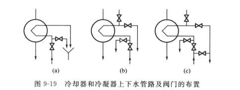 冷卻器和冷凝器的上下水管路及閥門的常見布置方式如圖9-19所示。圖9-19(a)用于開放式回水系統,其排水漏斗應布置在操作閥門時可觀察到的位置。圖9-19(b)和圖9-19(c)均用于密閉式回水系統,后者的上、下水管間設有連通管,當冬天設備停止運行時,水能繼續循環而不致凍結。