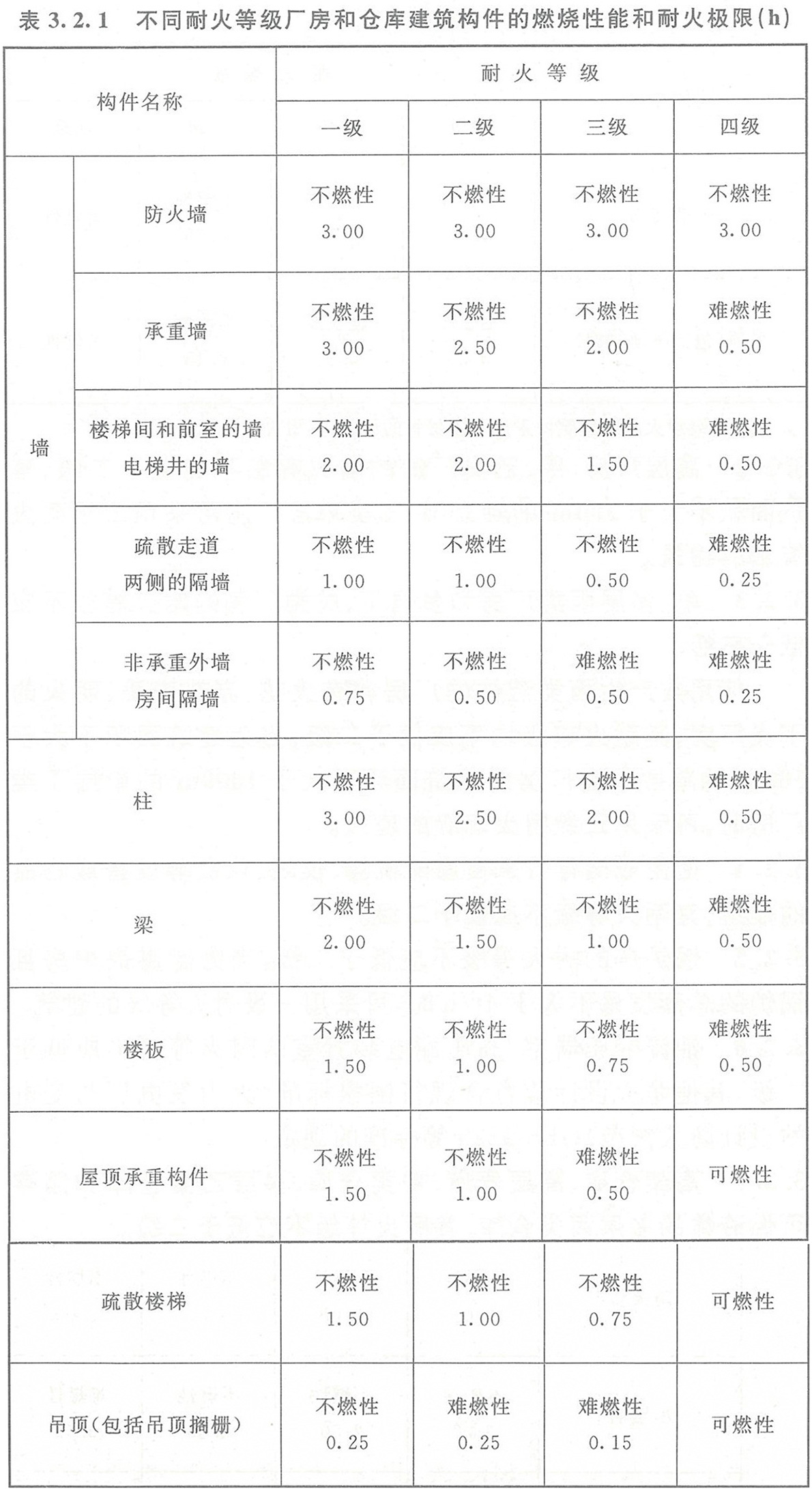 3.2.1廠房和倉(cāng)庫(kù)的耐火等級(jí)可分為一、二、三、四級(jí),相應(yīng)建筑構(gòu)件的燃燒性能和耐火極限,除本規(guī)范另有規(guī)定外,不應(yīng)低于表3.2.1的規(guī)定。