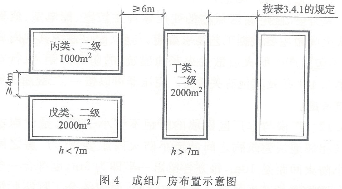 3.4.8 除高層廠房和甲類廠房外,其他類別的數座廠房占地面積之和小于本規范第3.3.1條規定的防火分區最大允許建筑面積(按其中較小者確定,但防火分區的最大允許建筑面積不限者,不應大于10000m2)時,可成組布置。當廠房建筑高度不大于7m時,組內廠房之間的防火間距不應小于4m;當廠房建筑高度大于7m時,組內廠房之間的防火間距不應小于6m。