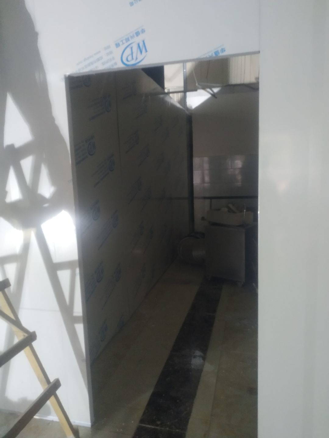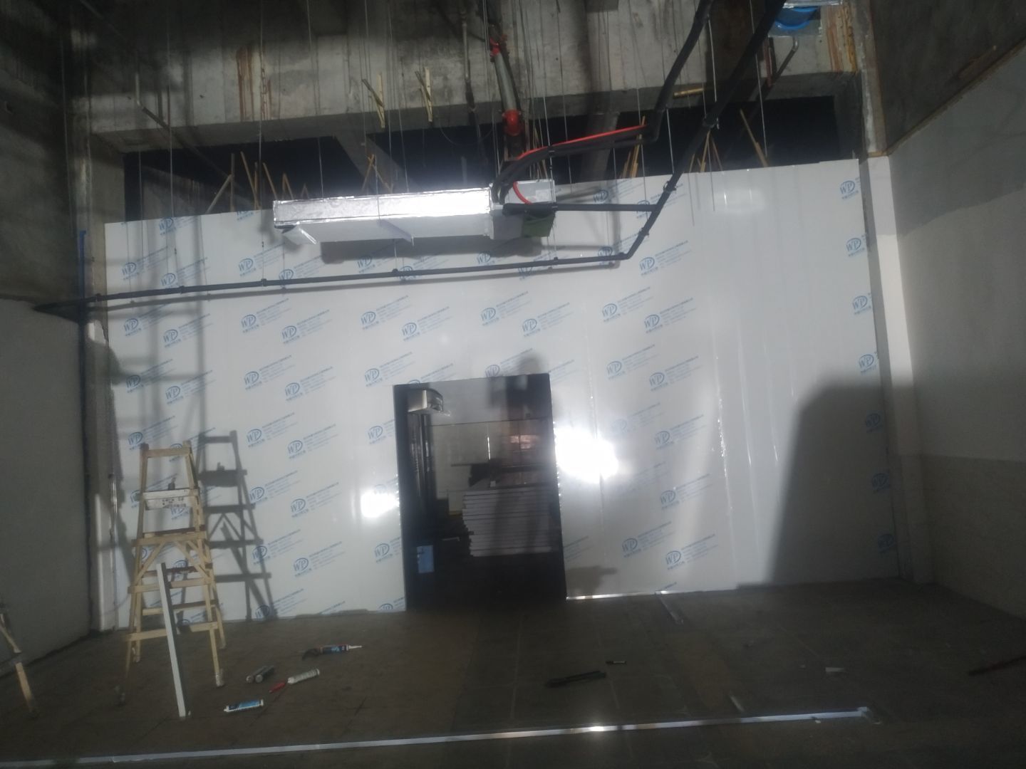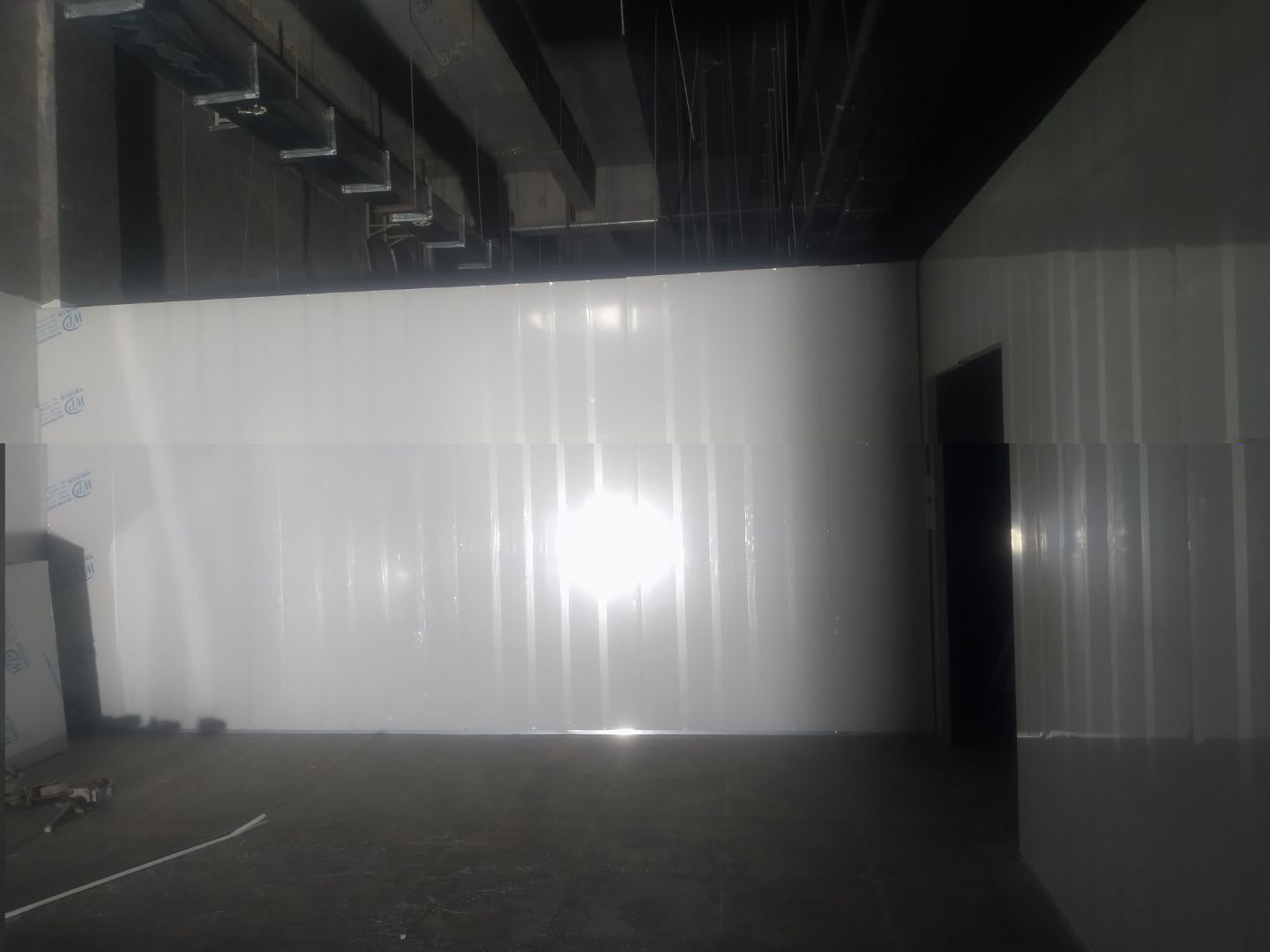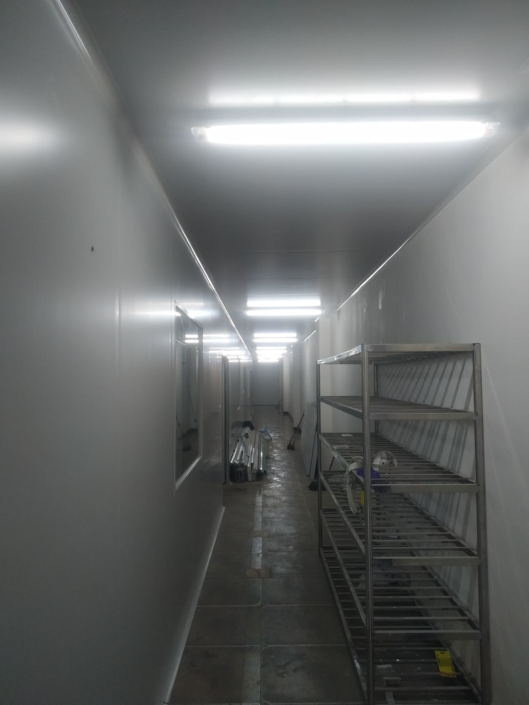 撕膜打膠完成95%,圓弧安裝完成90%,門安裝完成85%,觀察窗安裝完成,燈具安裝完成80%,配管穿線完成60%。