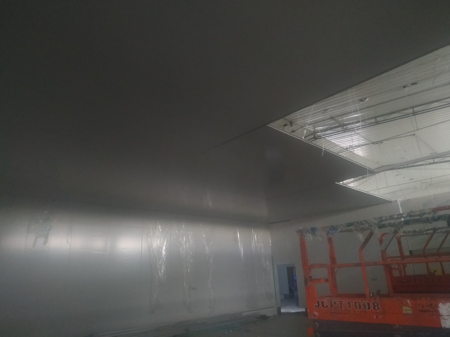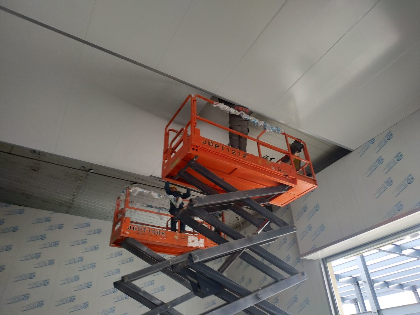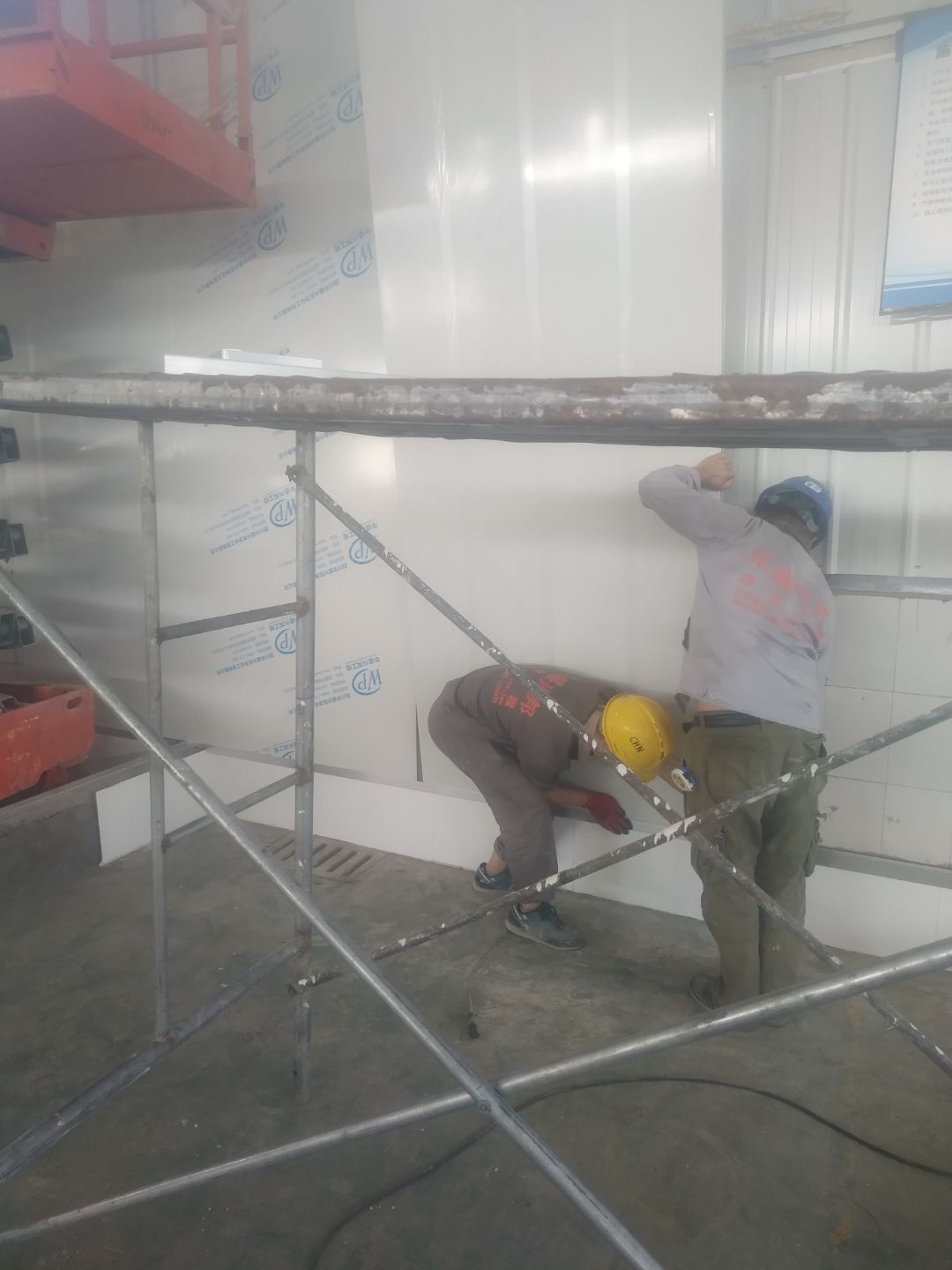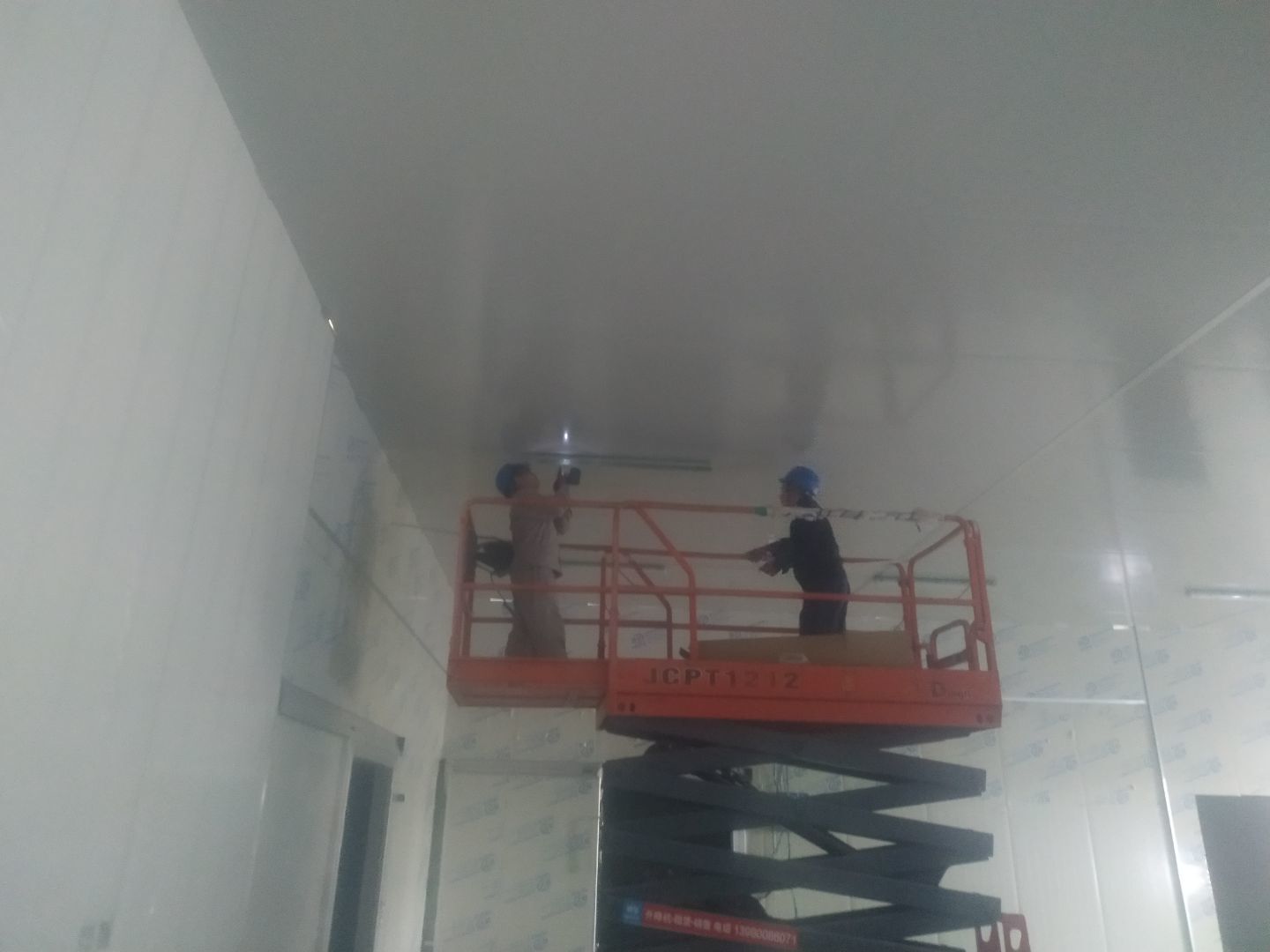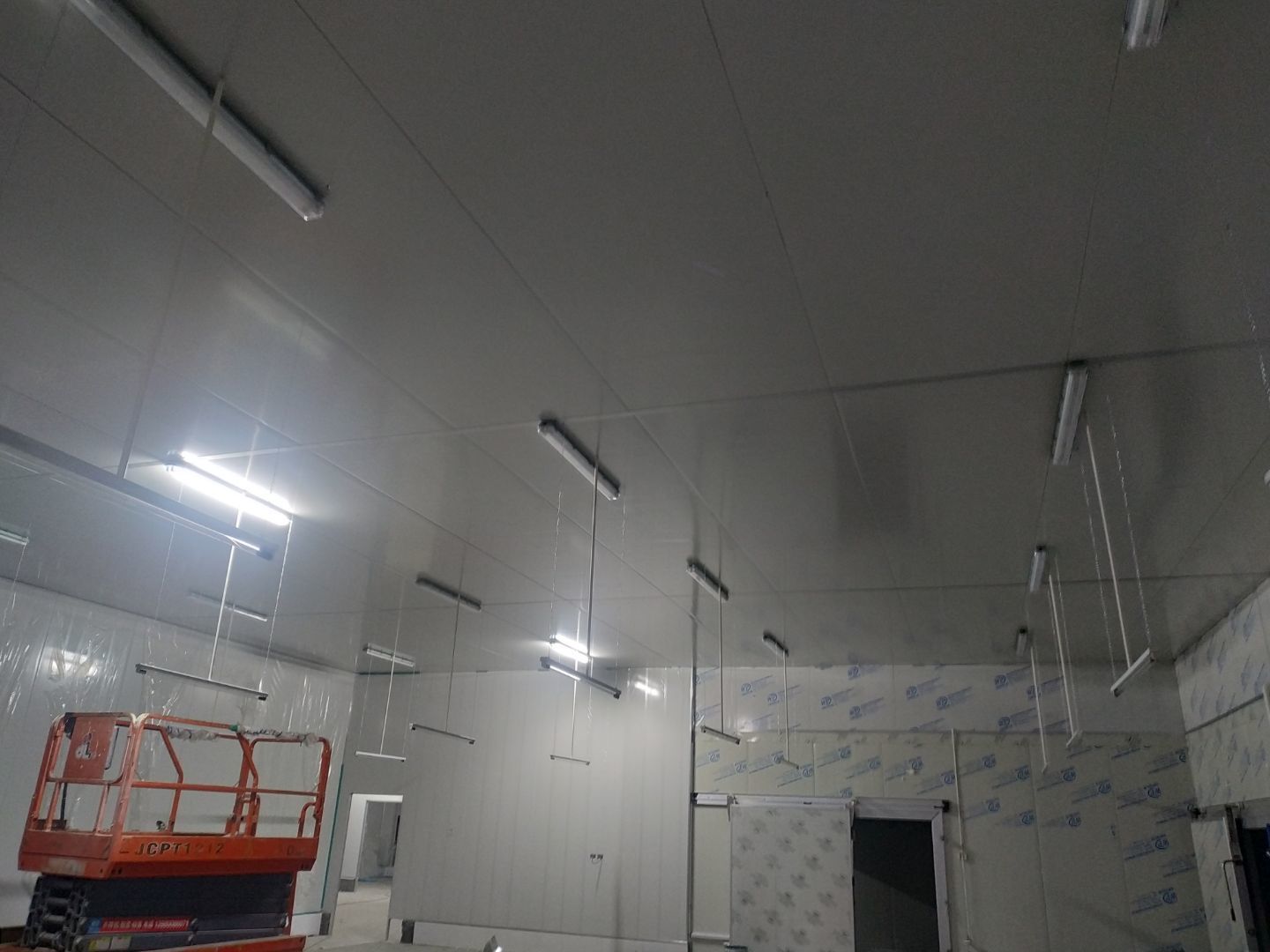 第三車彩板進場卸貨,墻板安裝完成90%,頂板安裝完成50%,燈具安裝完成25%,凍庫外機就位完成,銅管焊接完成。