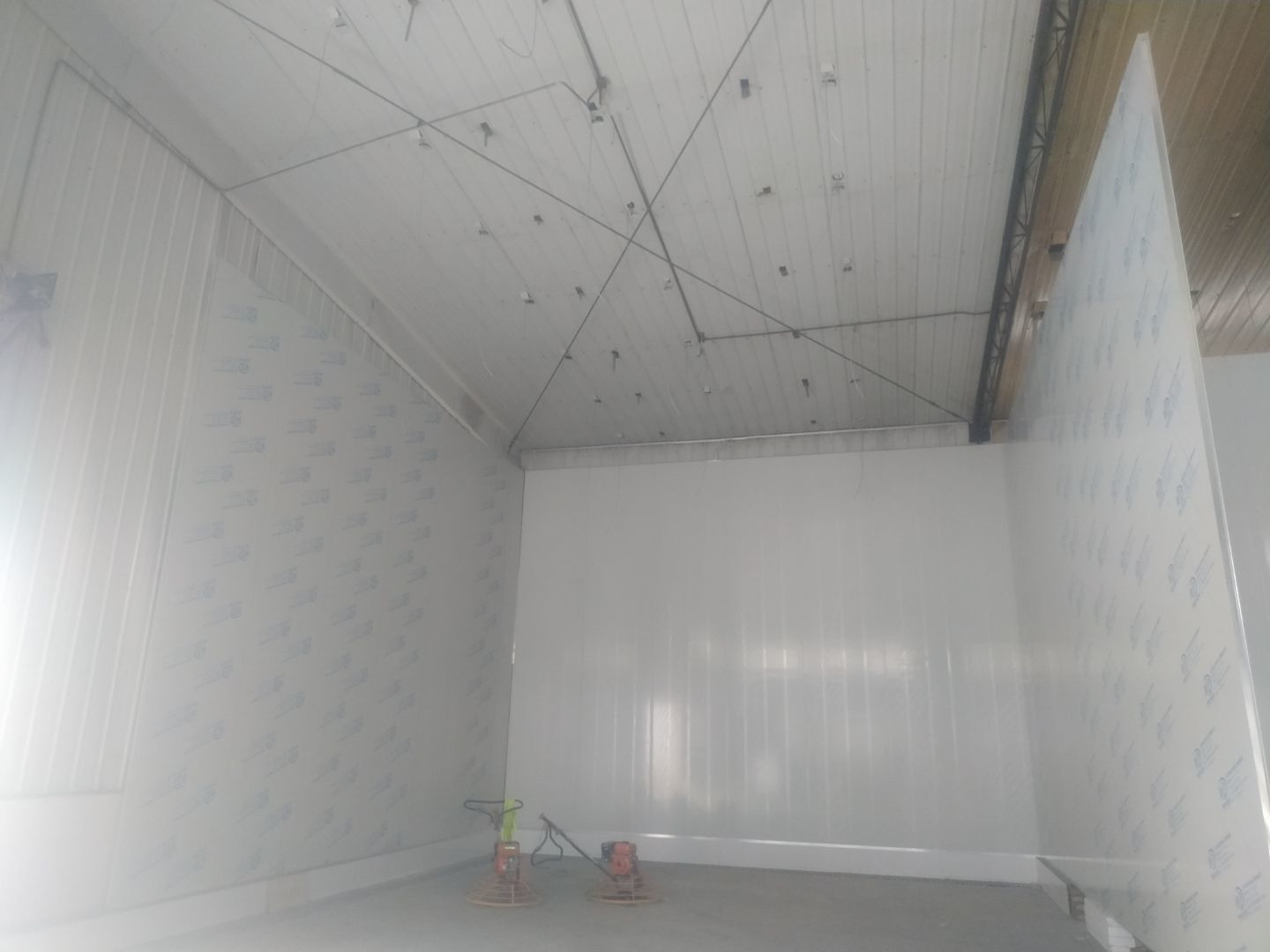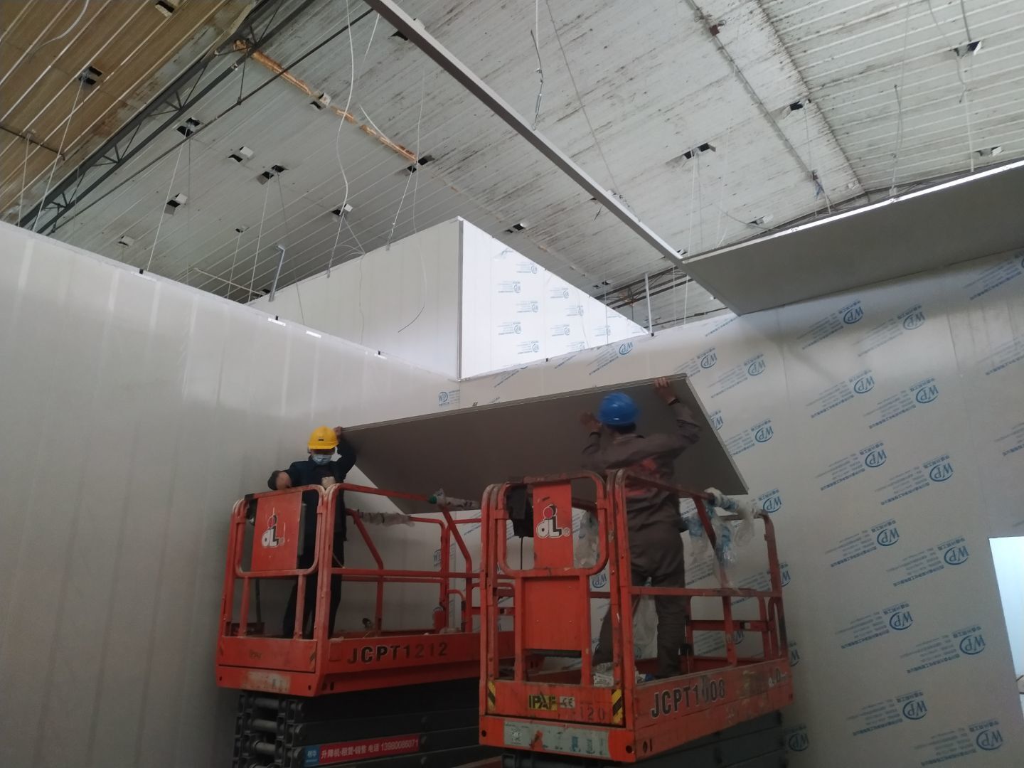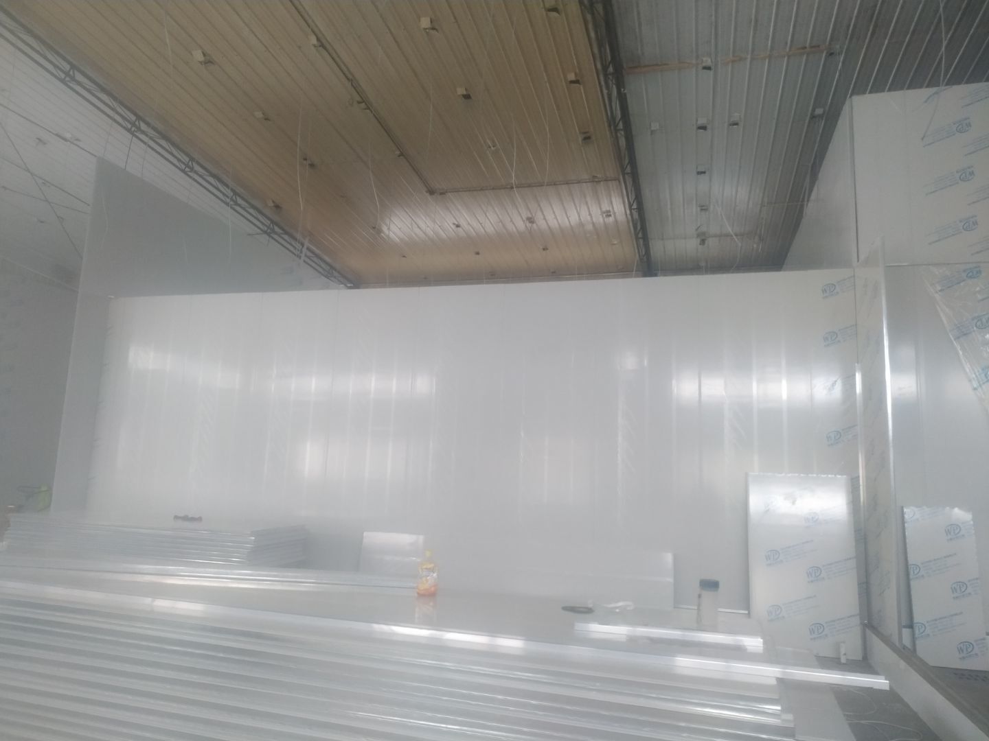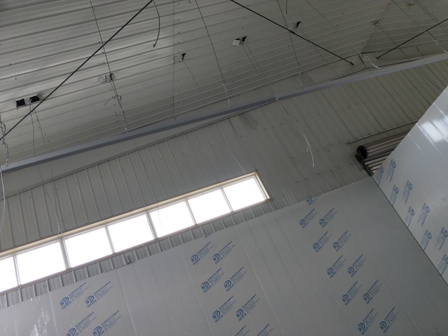 第三車彩板進場卸貨,墻板安裝完成90%,頂板安裝完成50%,燈具安裝完成25%,凍庫外機就位完成,銅管焊接完成。