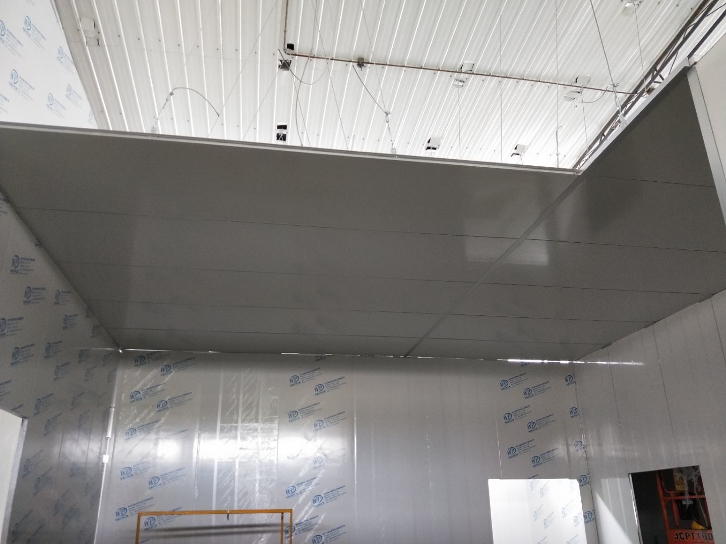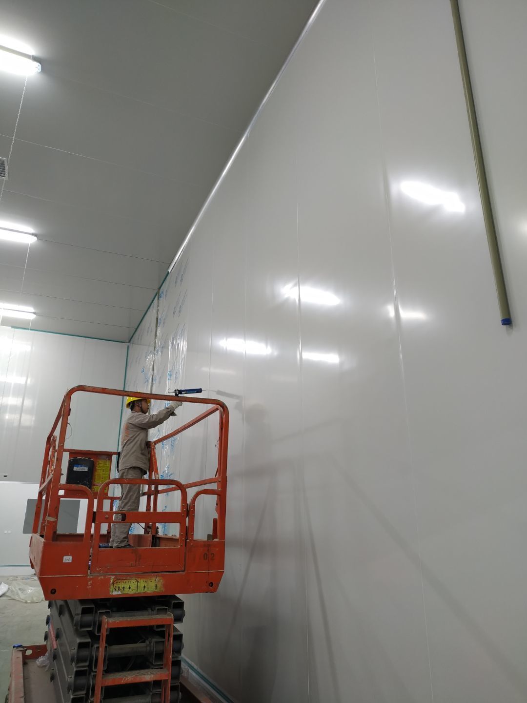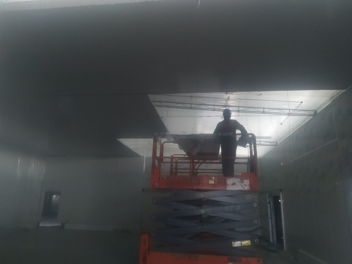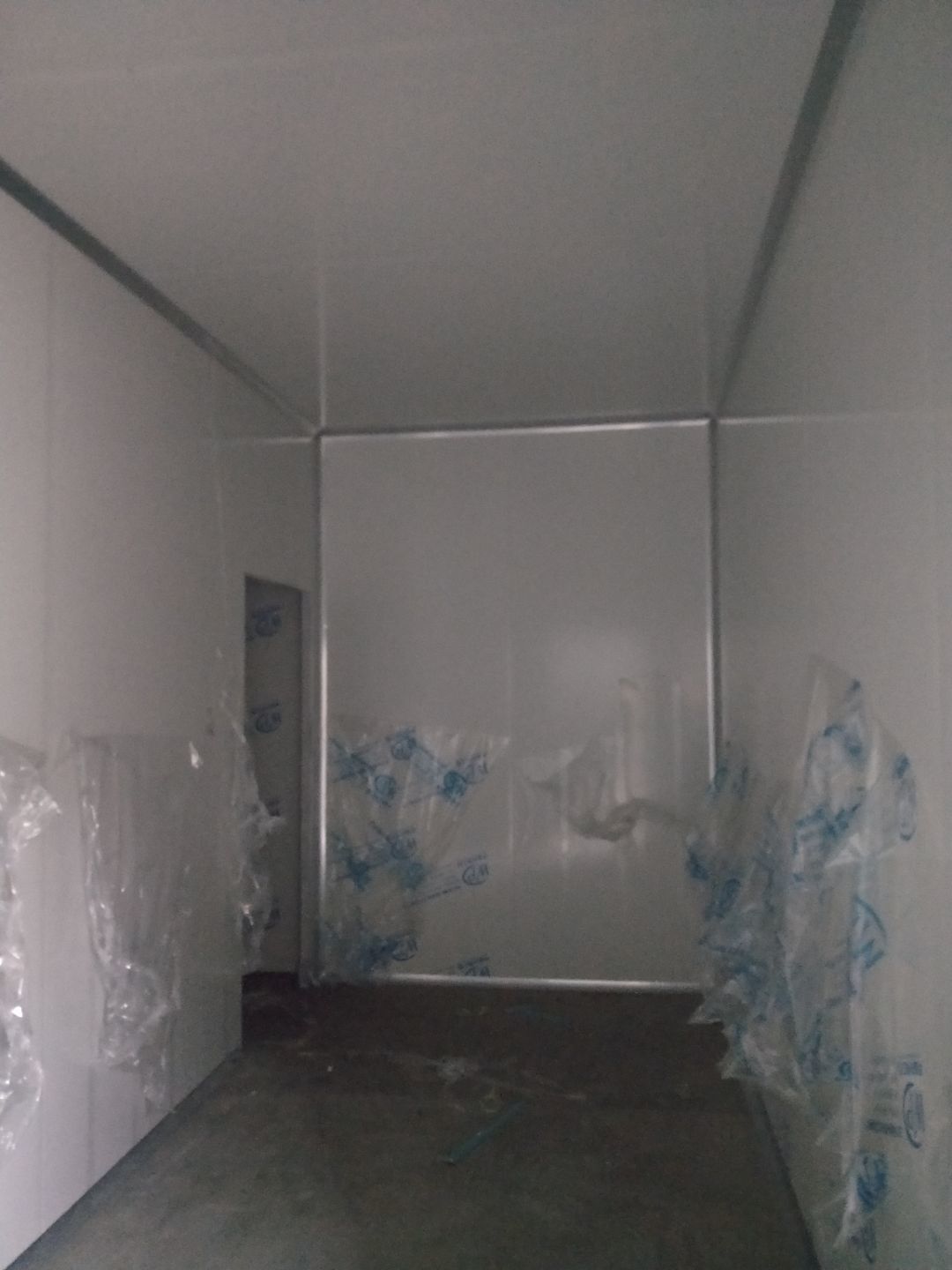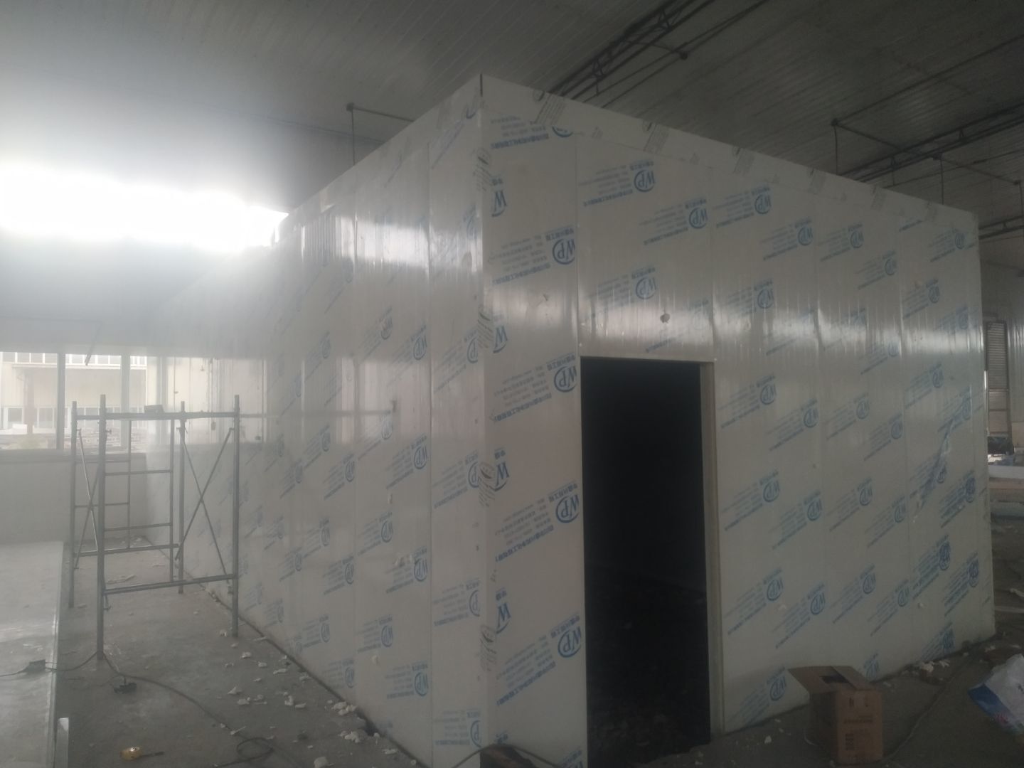 第三車彩板進場卸貨,墻板安裝完成90%,頂板安裝完成50%,燈具安裝完成25%,凍庫外機就位完成,銅管焊接完成。