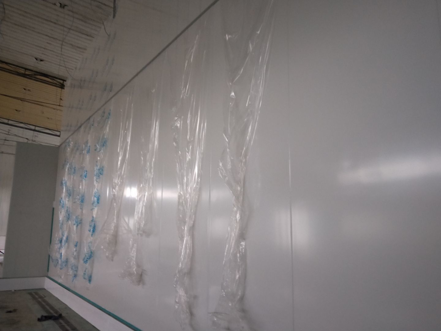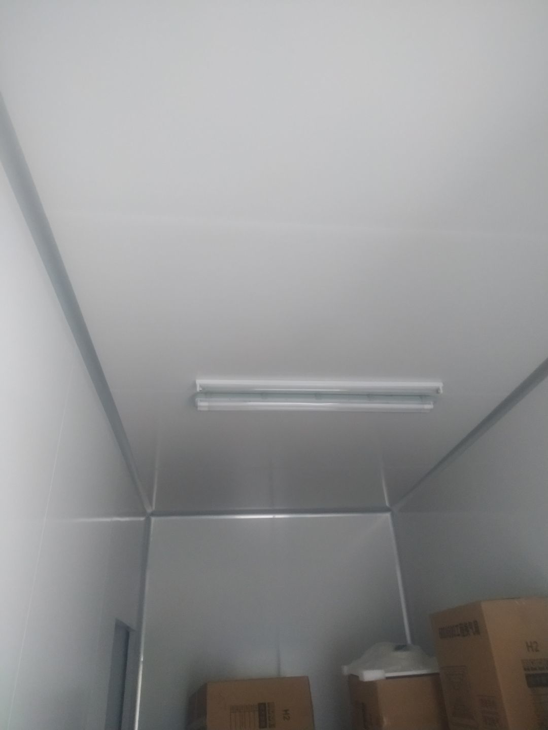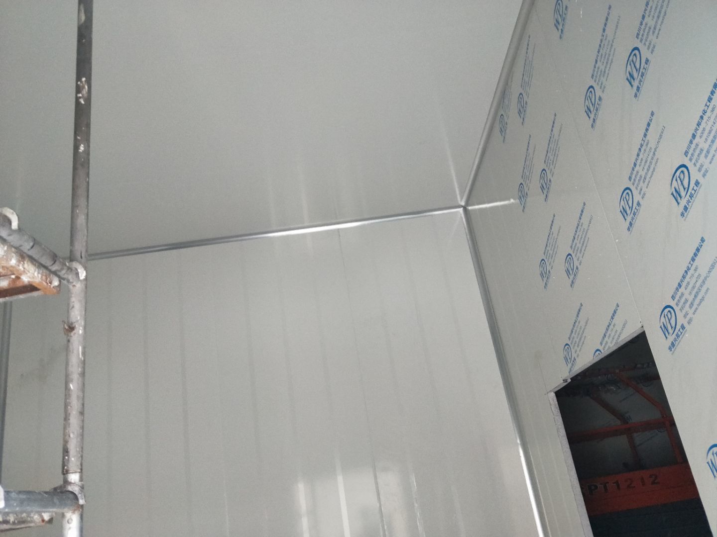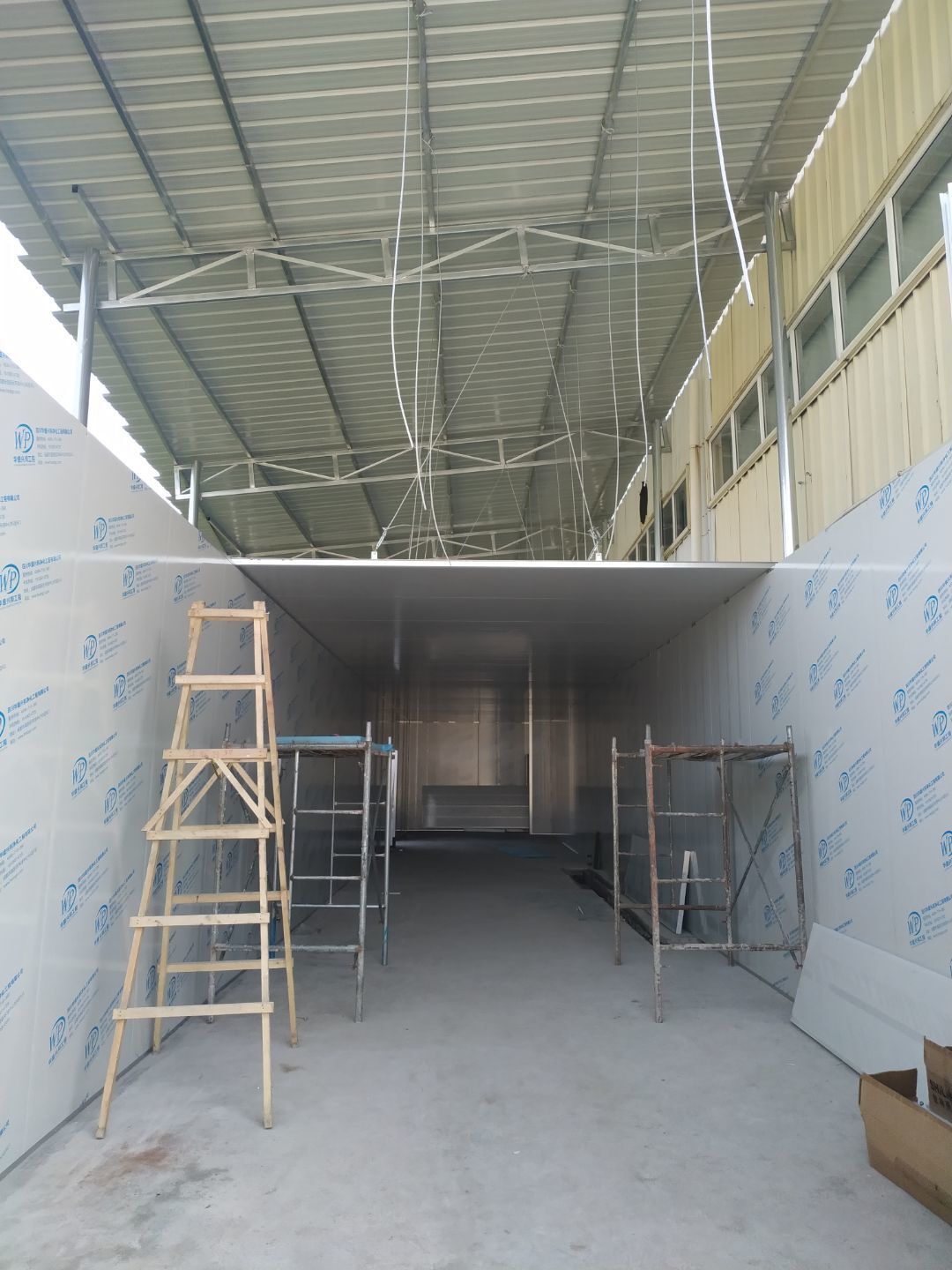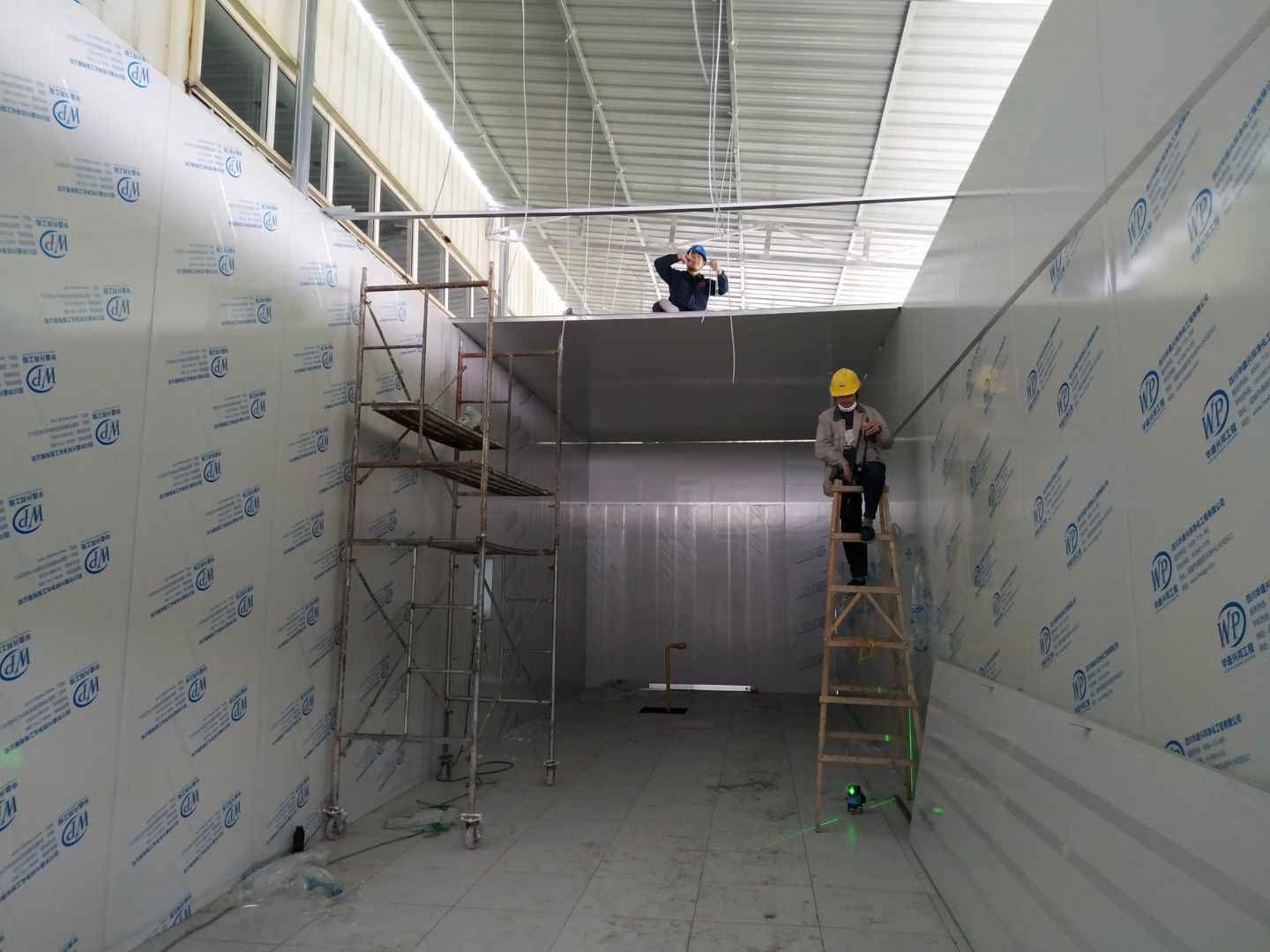 第三車彩板進場卸貨,墻板安裝完成90%,頂板安裝完成50%,燈具安裝完成25%,凍庫外機就位完成,銅管焊接完成。