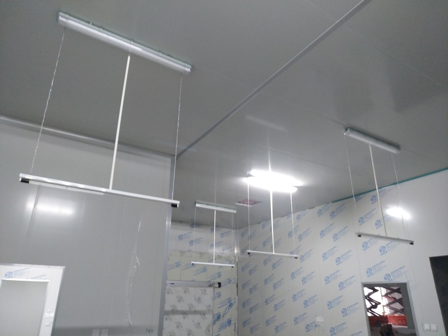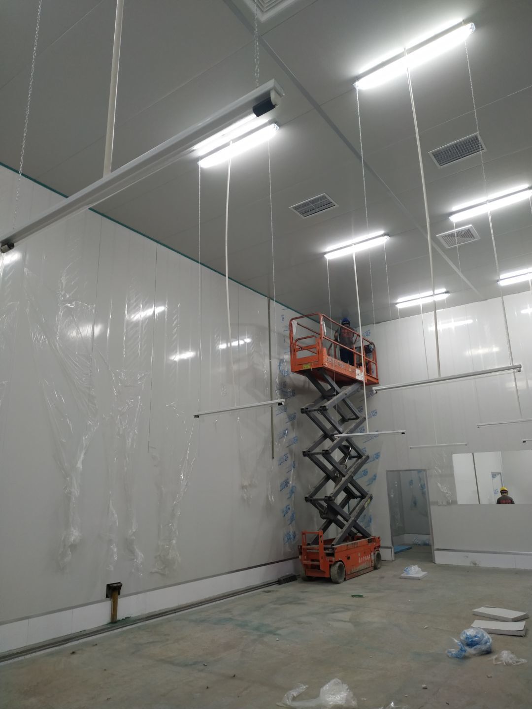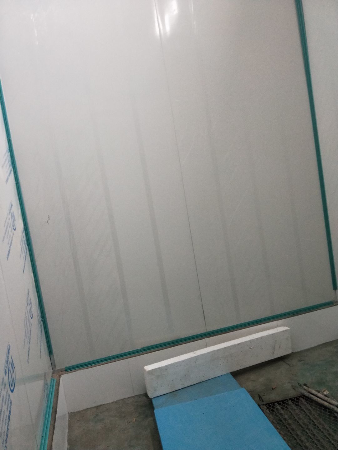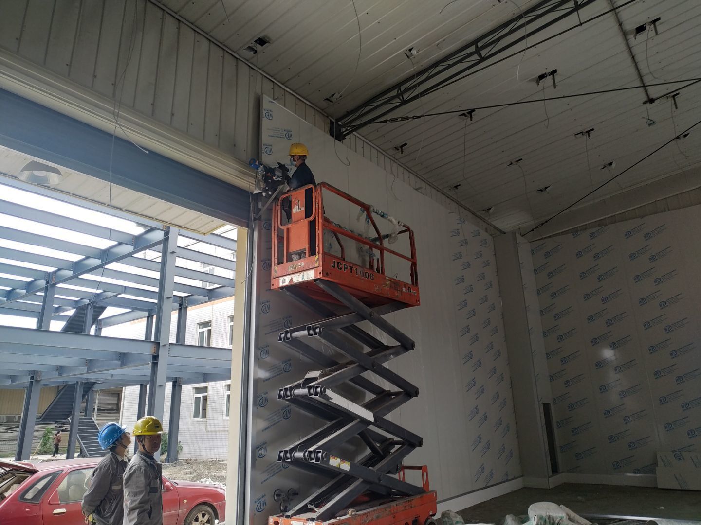 第三車彩板進場卸貨,墻板安裝完成90%,頂板安裝完成50%,燈具安裝完成25%,凍庫外機就位完成,銅管焊接完成。