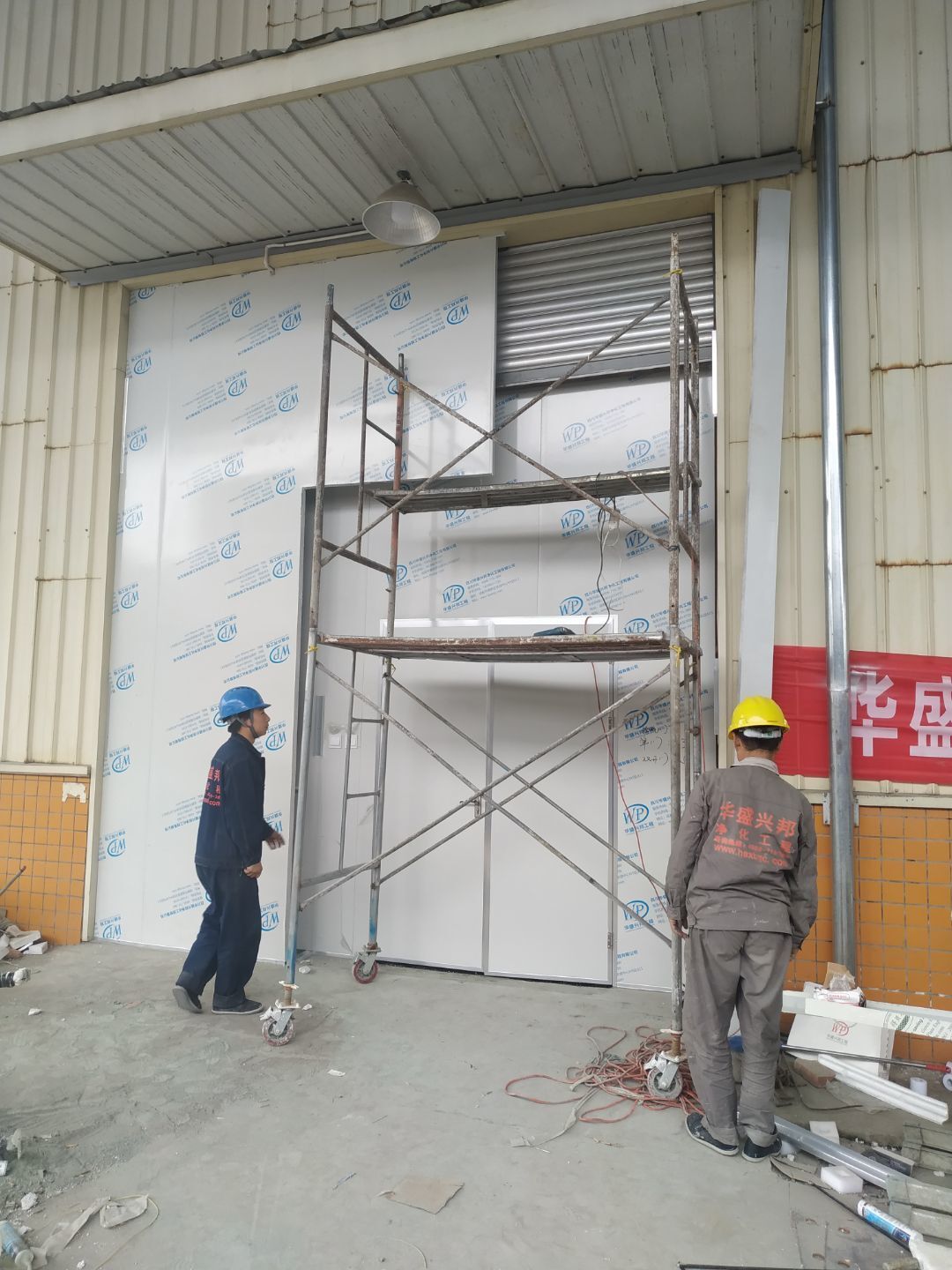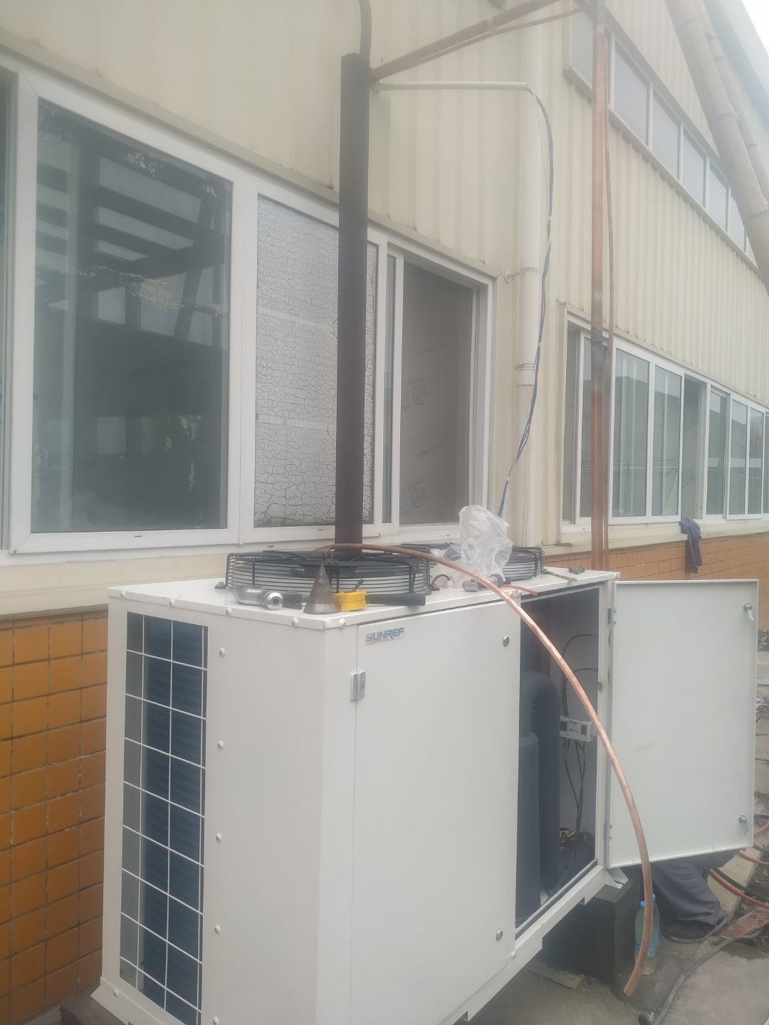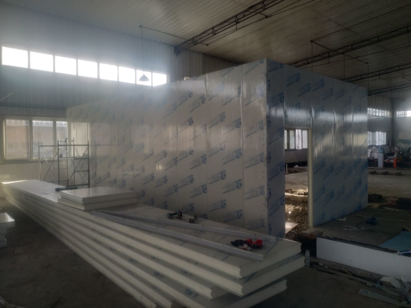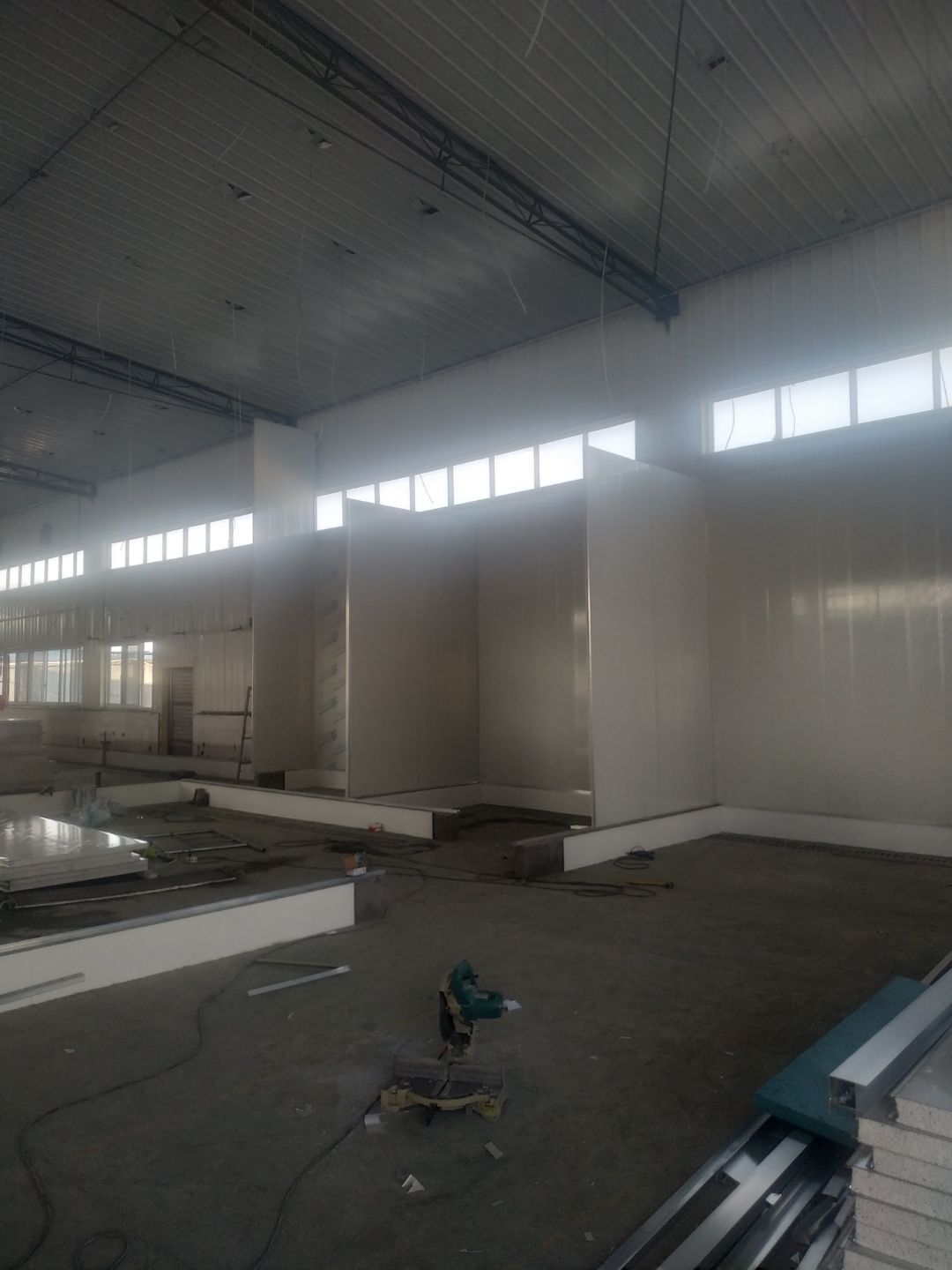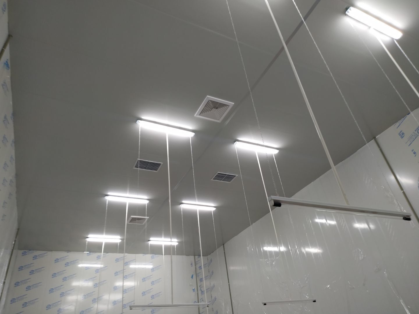 第三車彩板進場卸貨,墻板安裝完成90%,頂板安裝完成50%,燈具安裝完成25%,凍庫外機就位完成,銅管焊接完成。