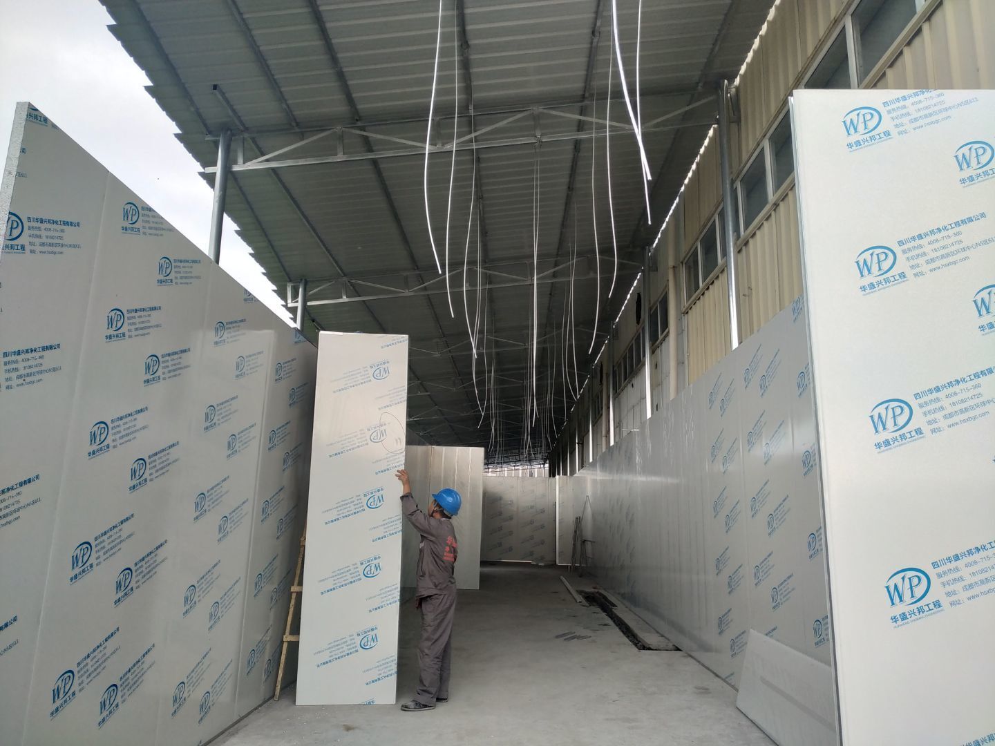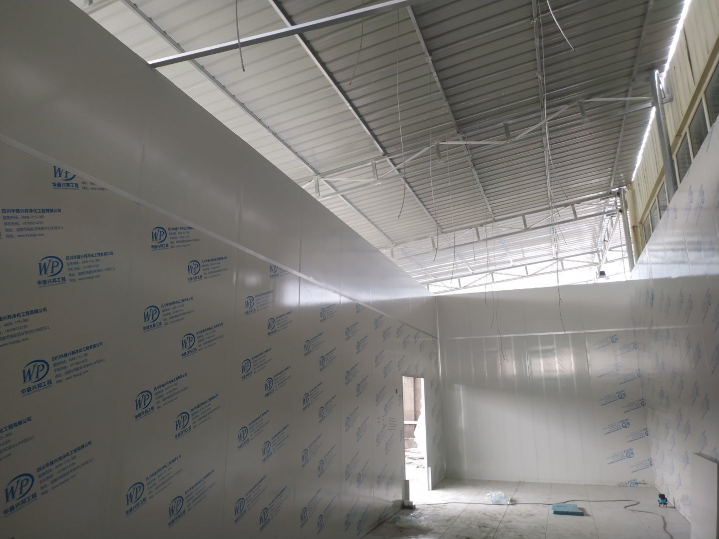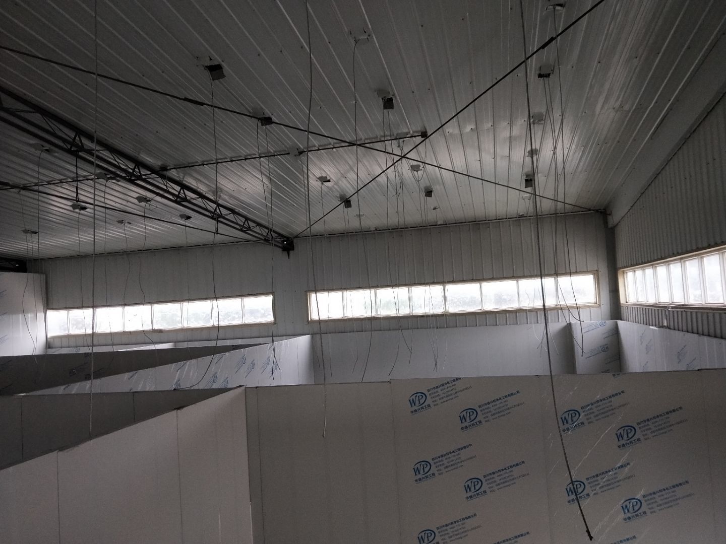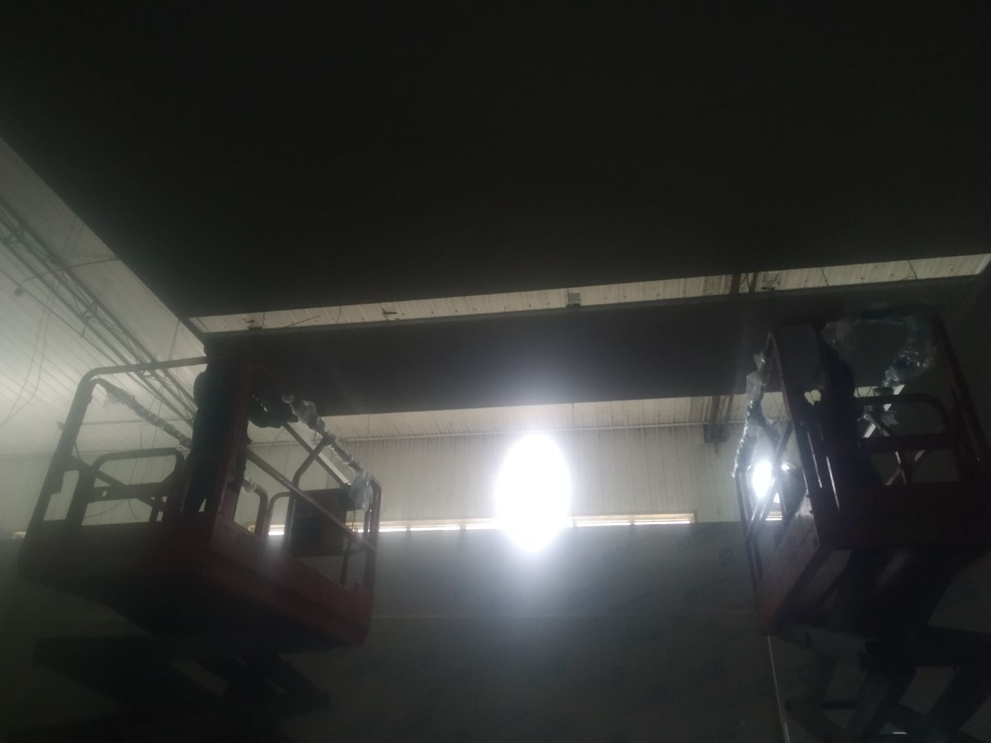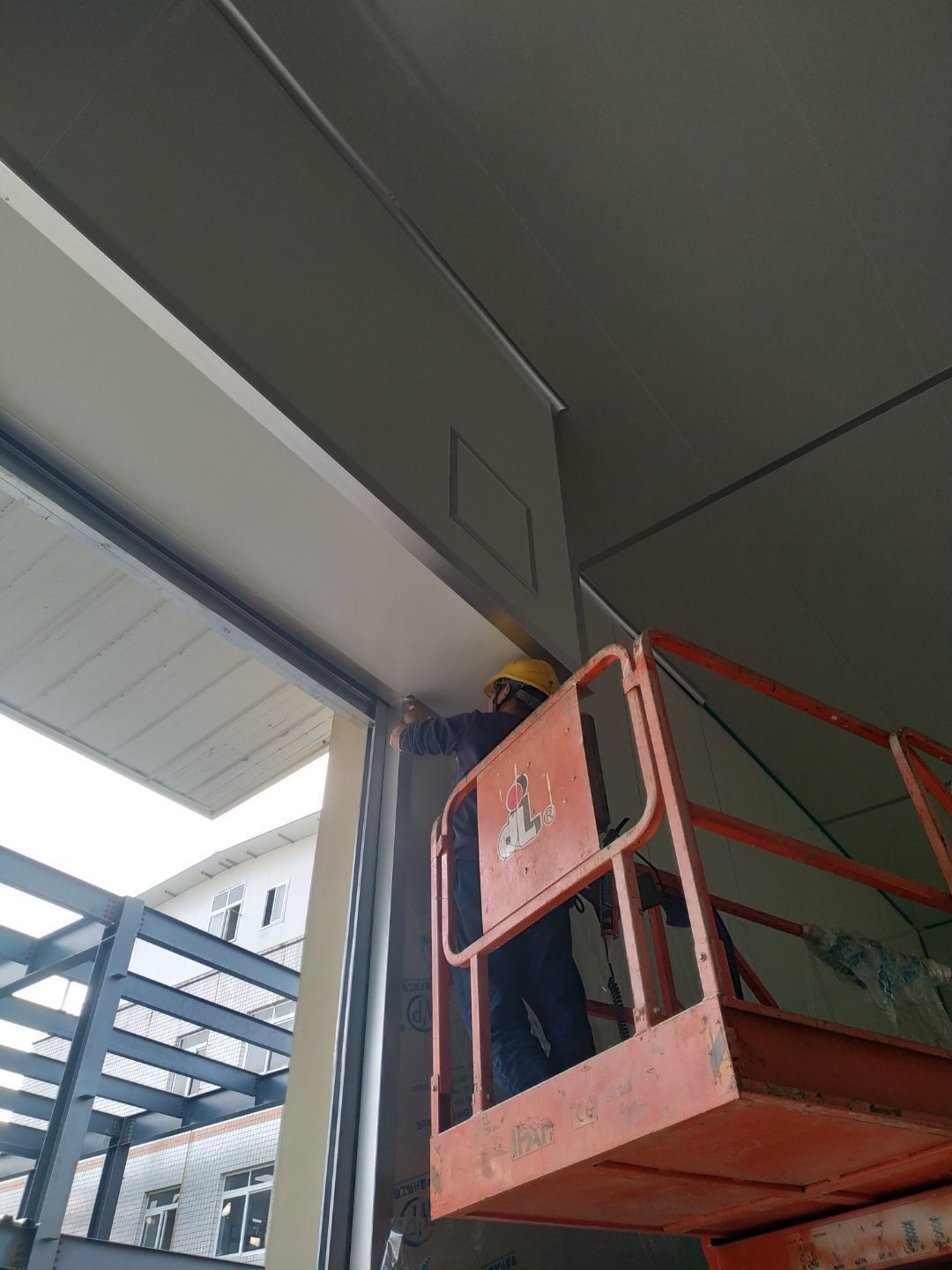 頂板安裝完成95%,新增排水溝安裝完成80%(剩余內包材消毒殺菌和地磚同步安裝),燈具安裝完成80%,撕膜打膠完成45%,圓弧安裝35%。室外排水管安裝完成,三防板安裝完成。
