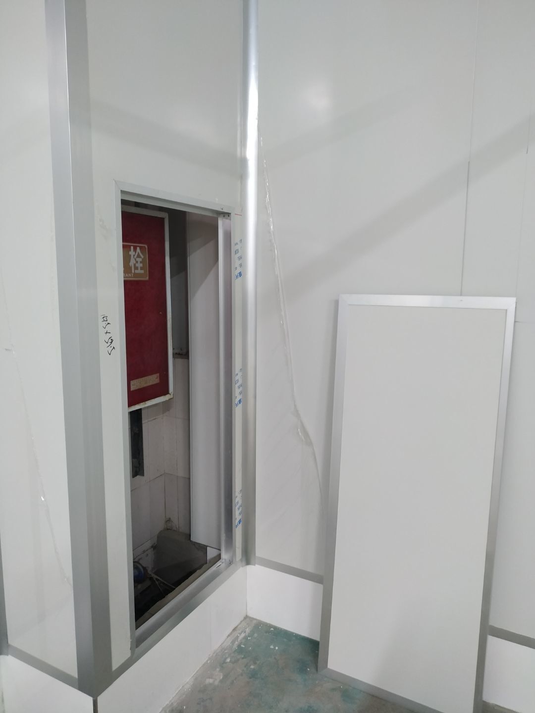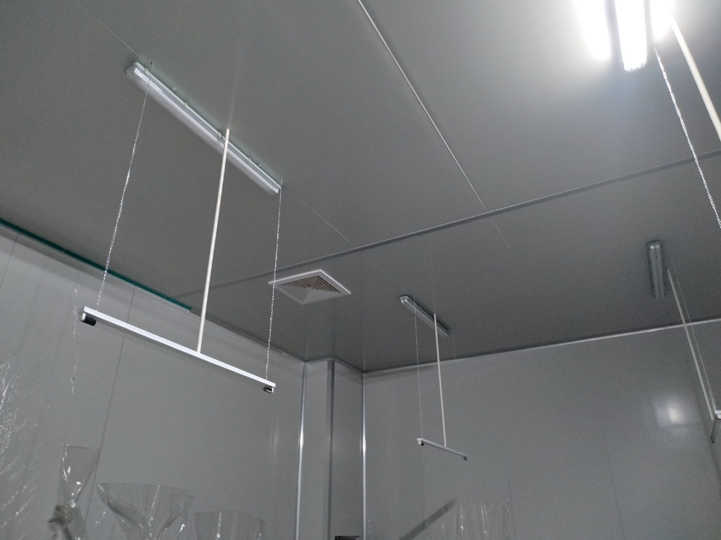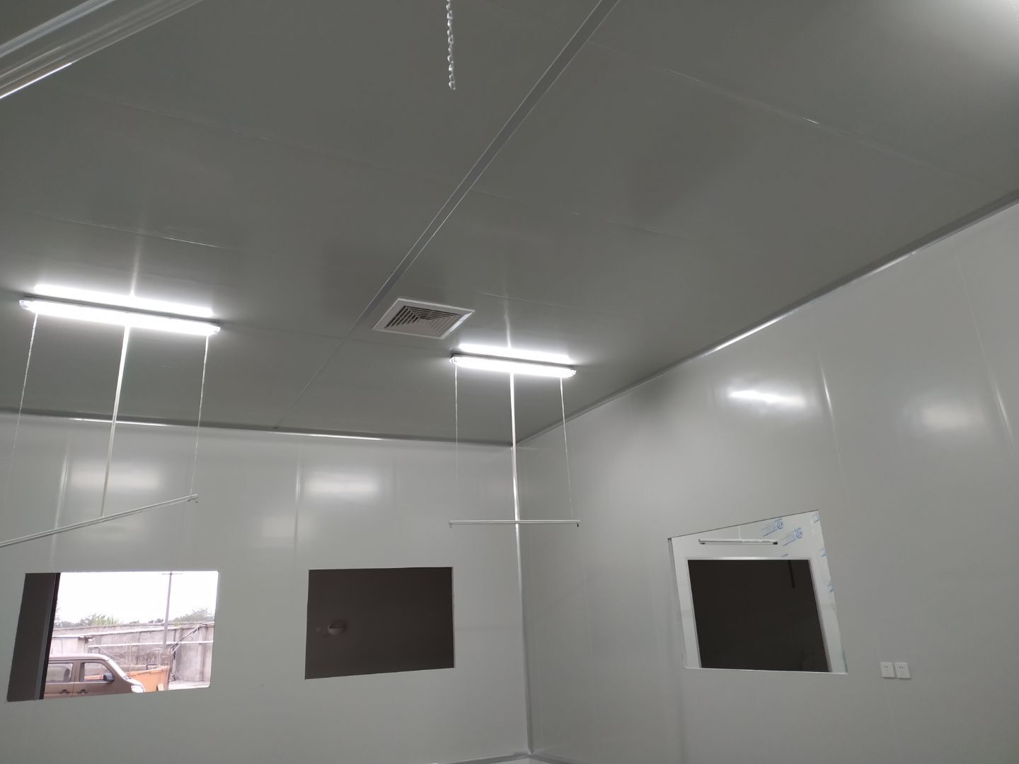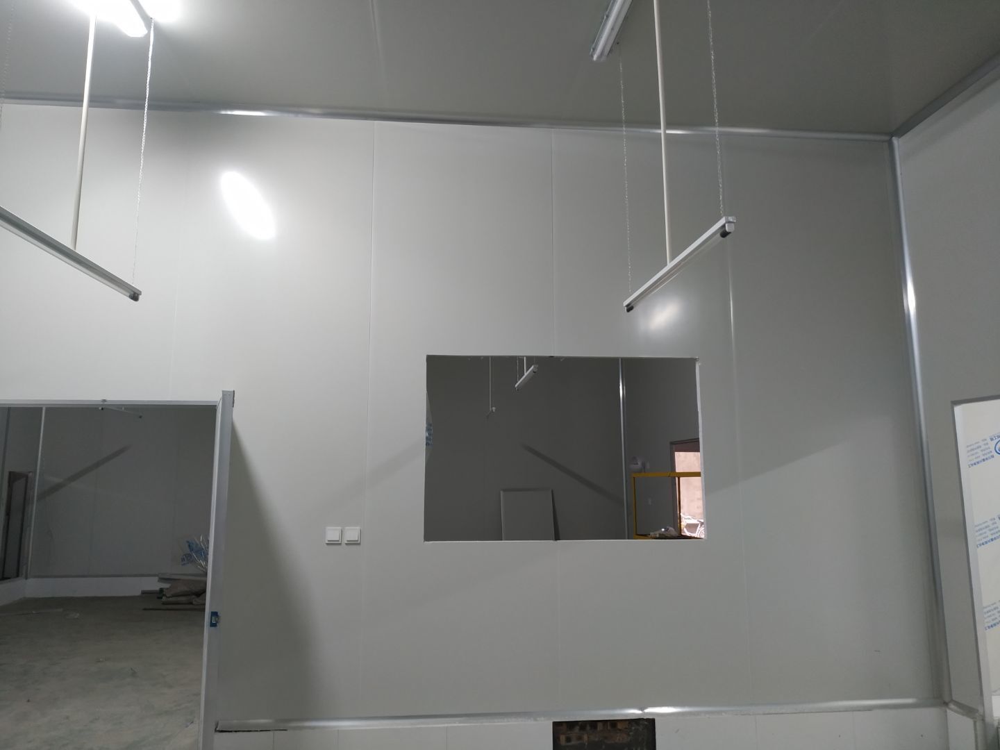 撕膜打膠完成70%,圓弧安裝完成60%,換氣扇安裝完成,進氣百葉安裝完成,照明燈和紫外線燈通電實驗完成。