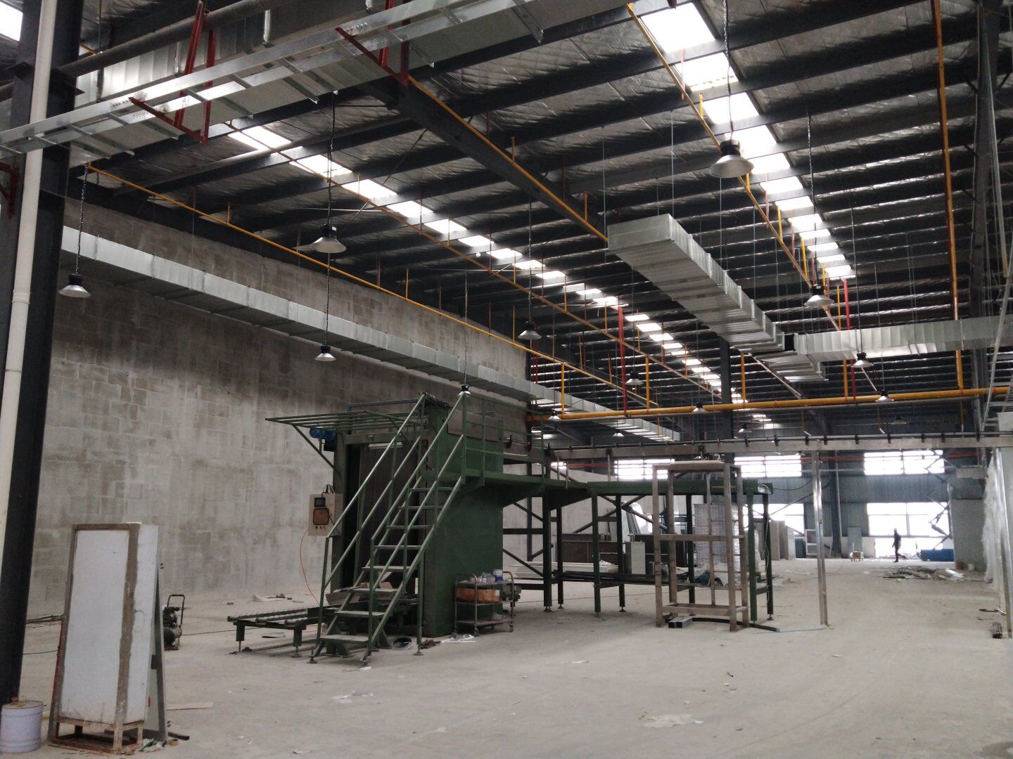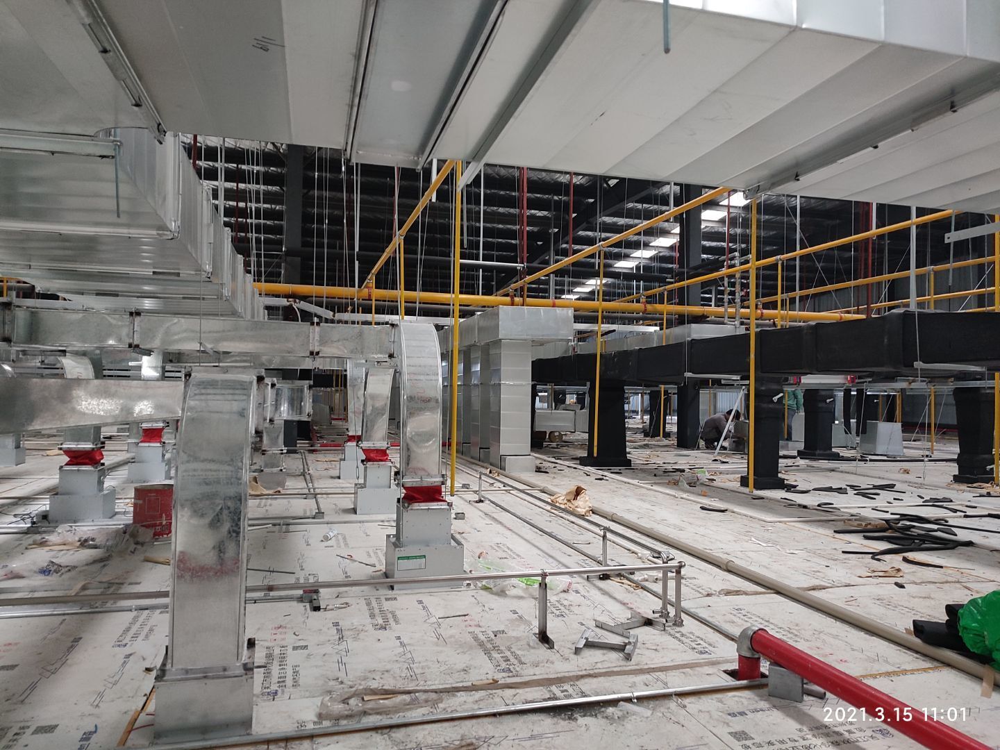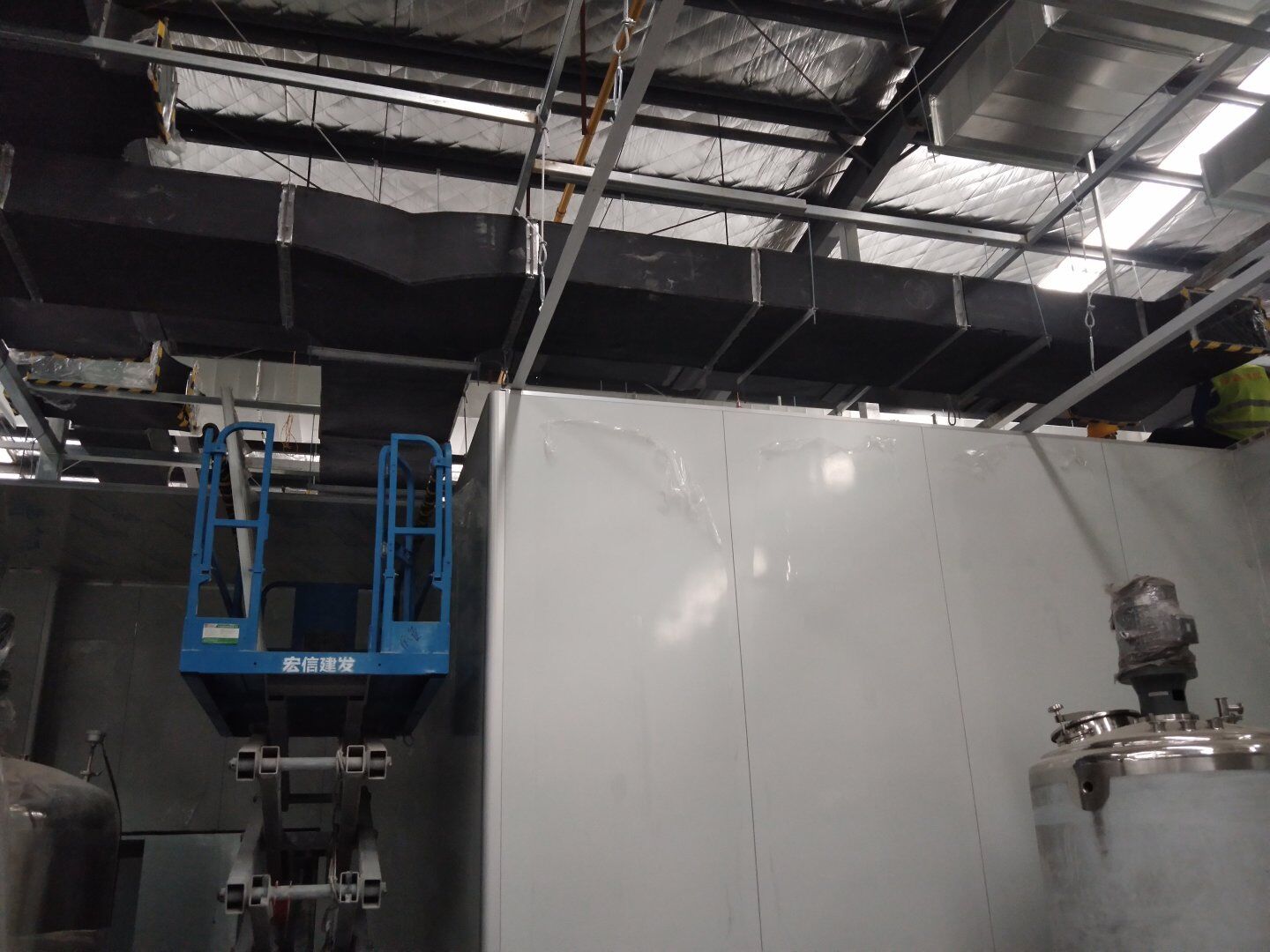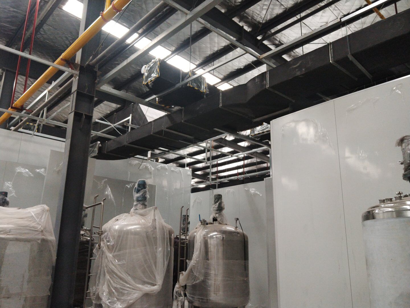液體車(chē)間: 1、剩余風(fēng)管拼裝完成80%;2、彩鋼板打膠完成95%;3、空調(diào)自控放線(xiàn)完成95%。