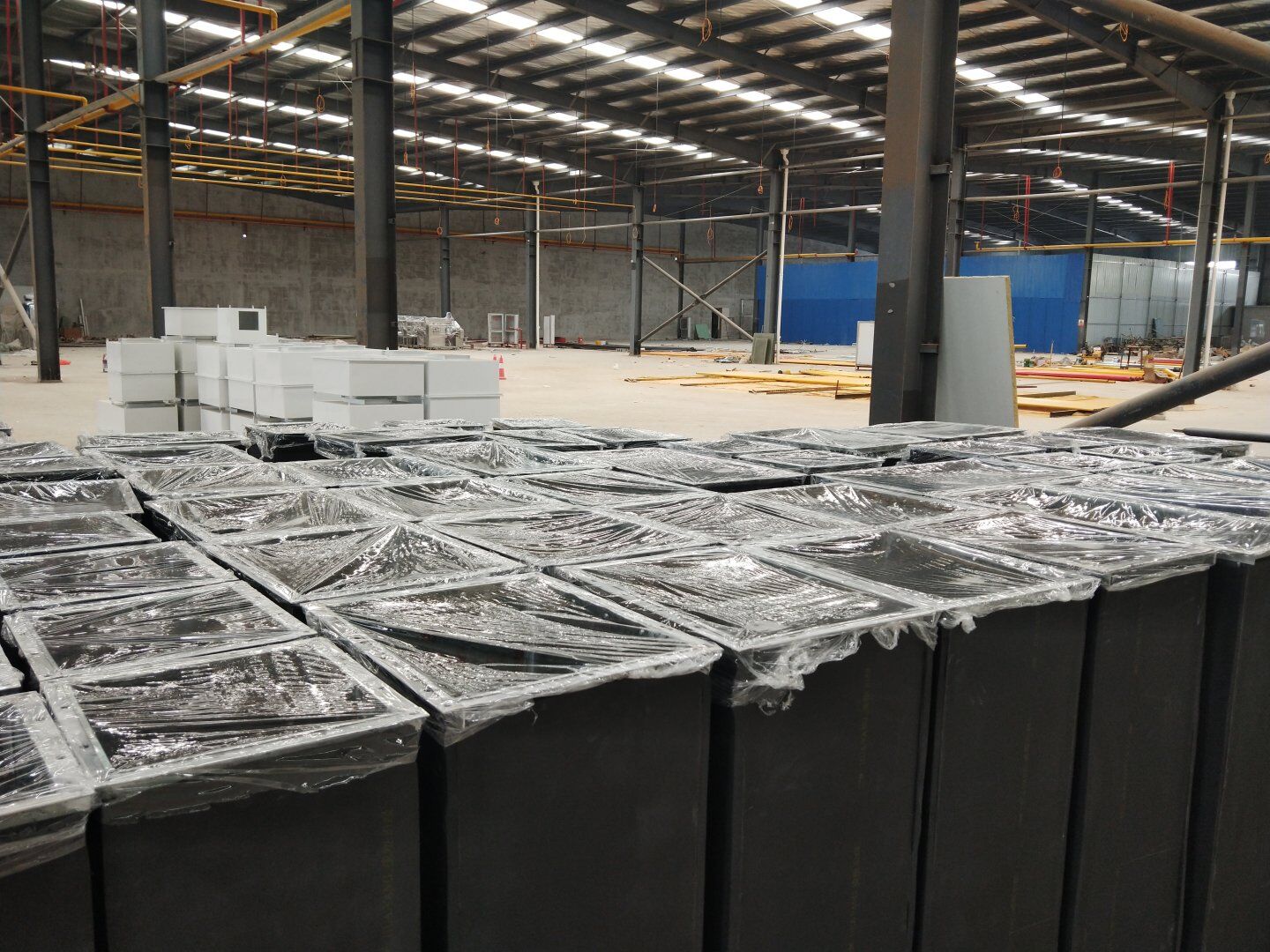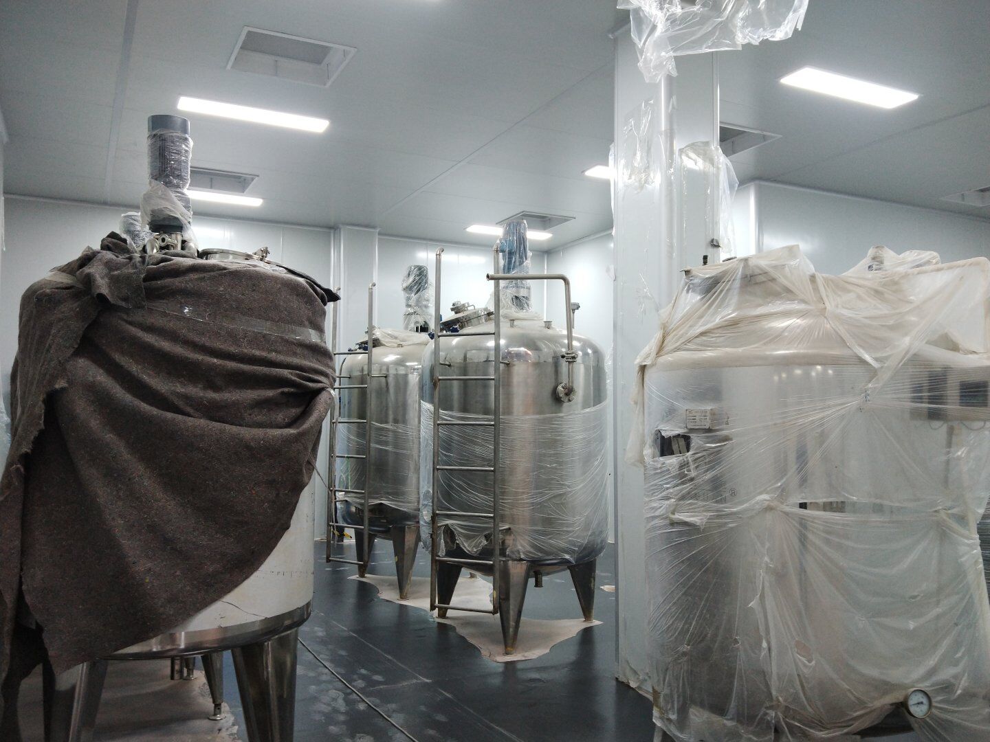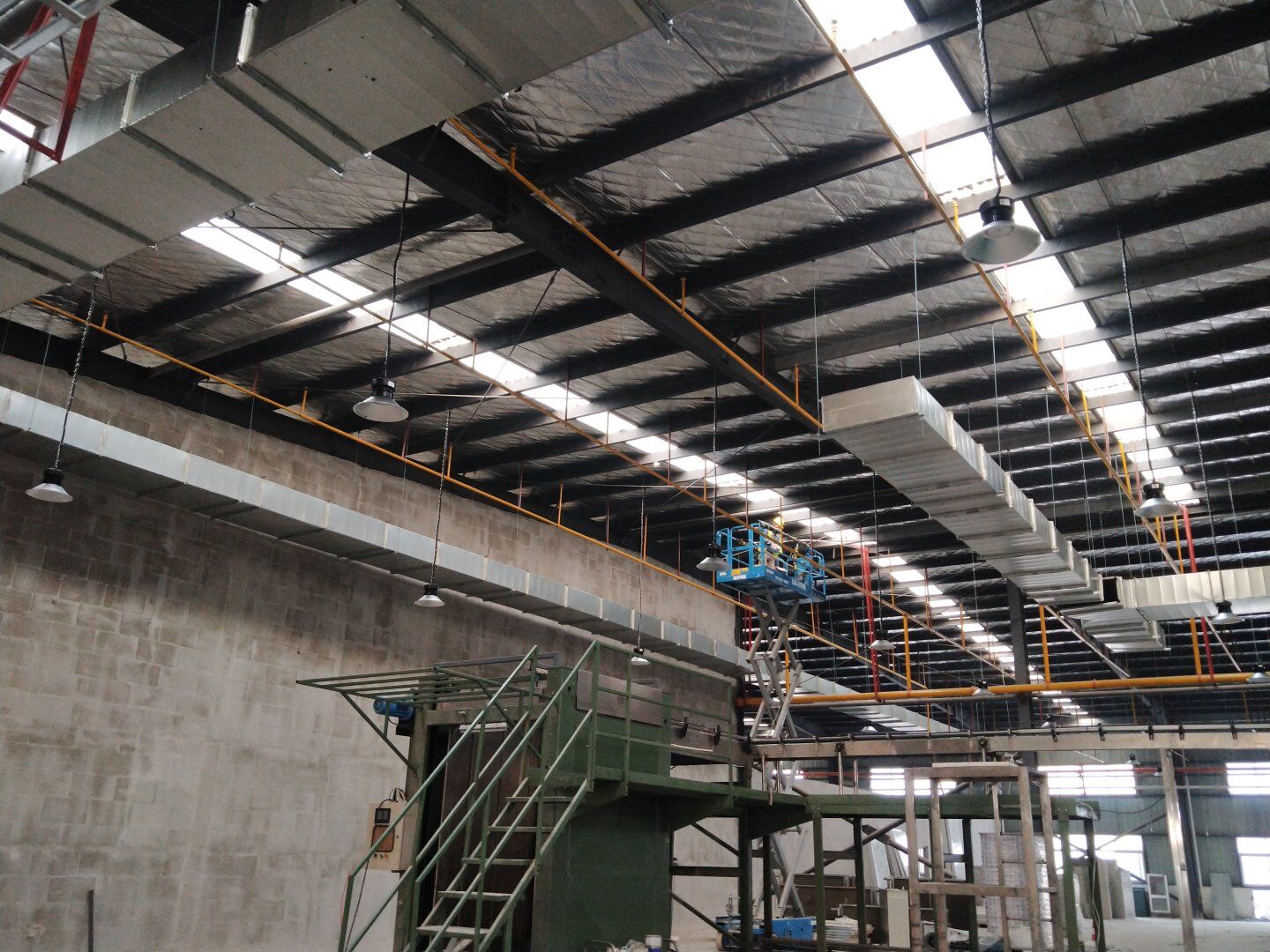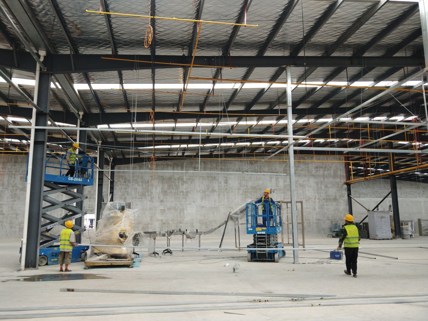 液體車(chē)間: 1、剩余風(fēng)管拼裝完成80%;2、彩鋼板打膠完成95%;3、空調(diào)自控放線(xiàn)完成95%。