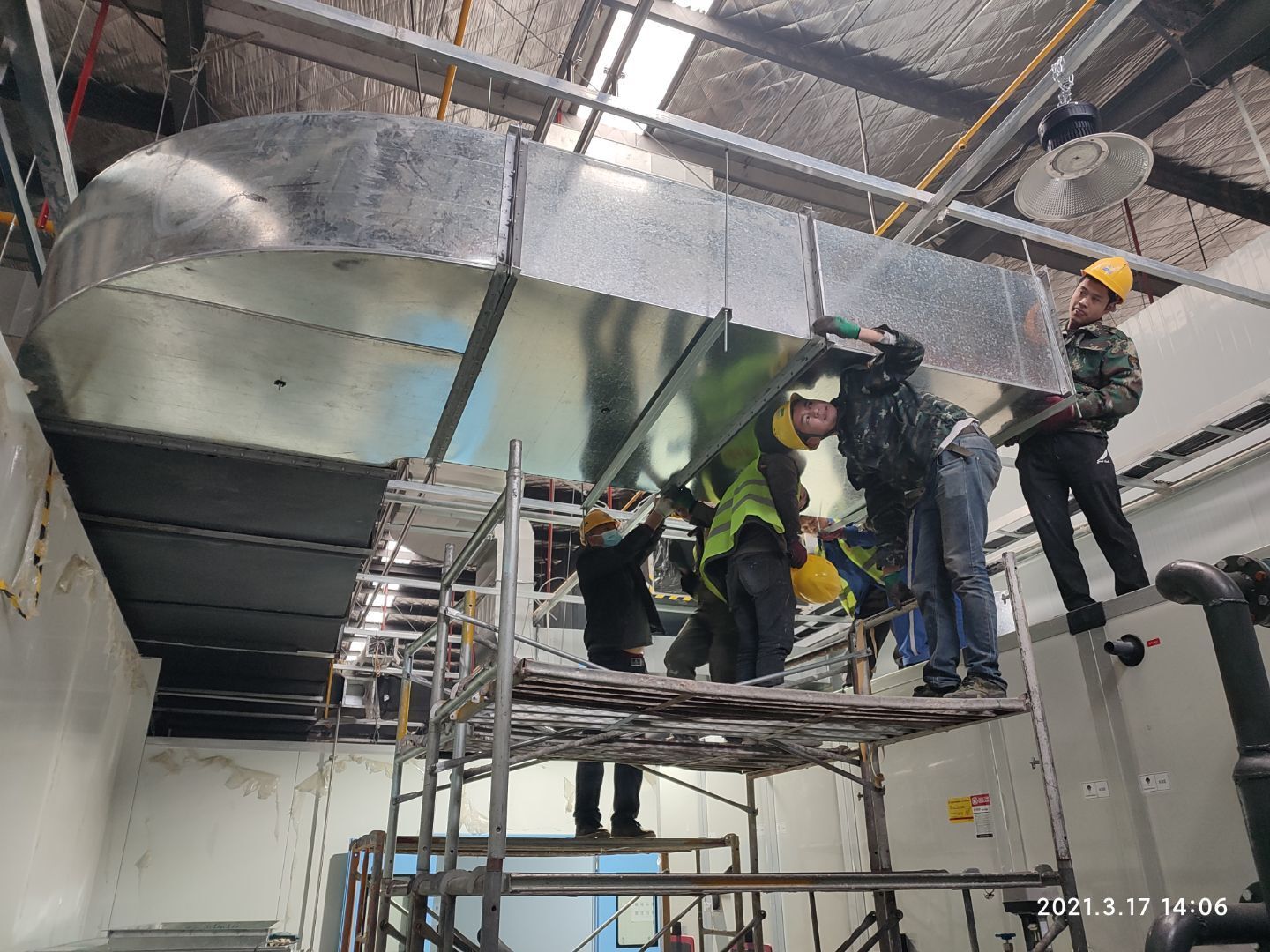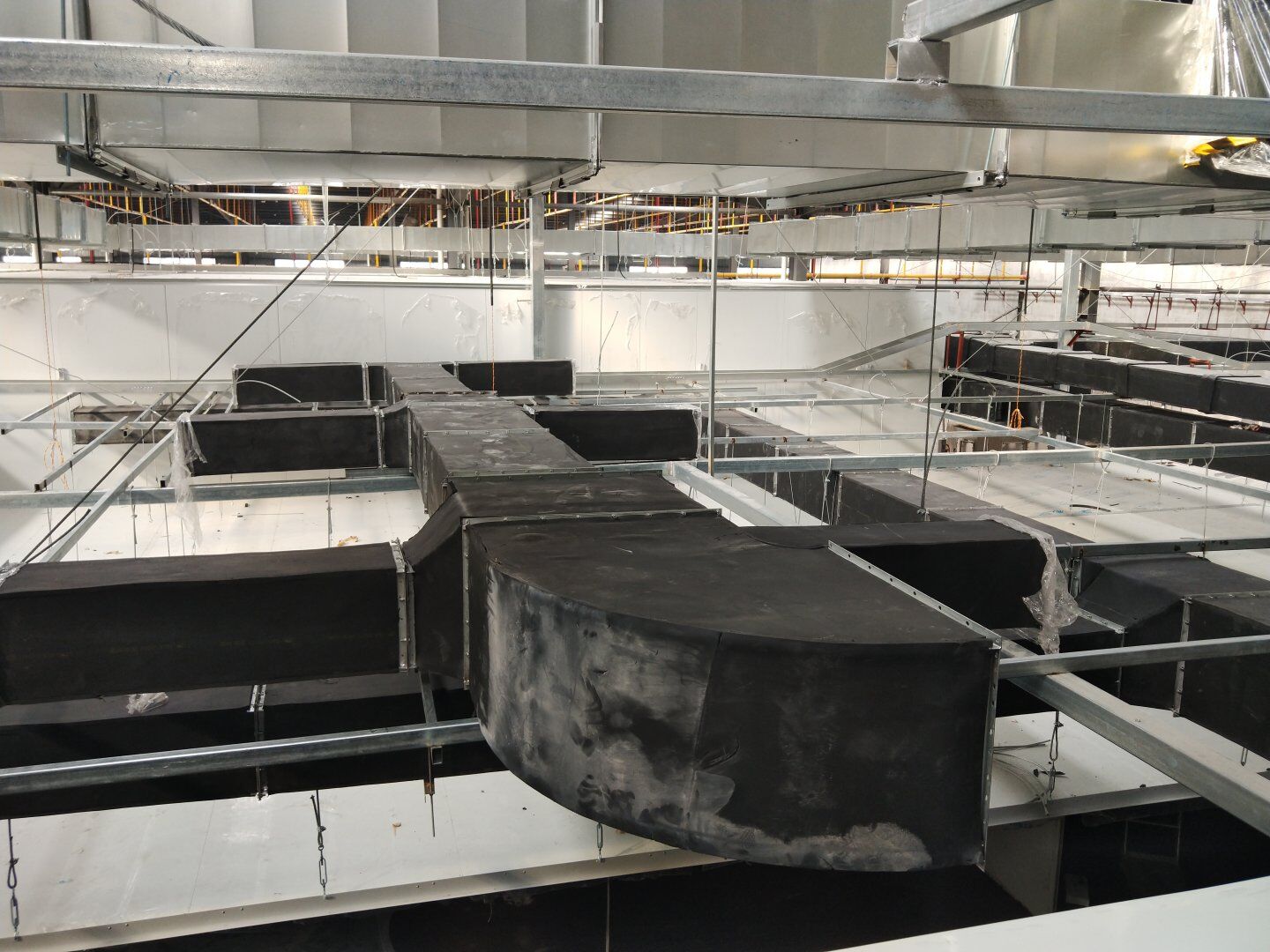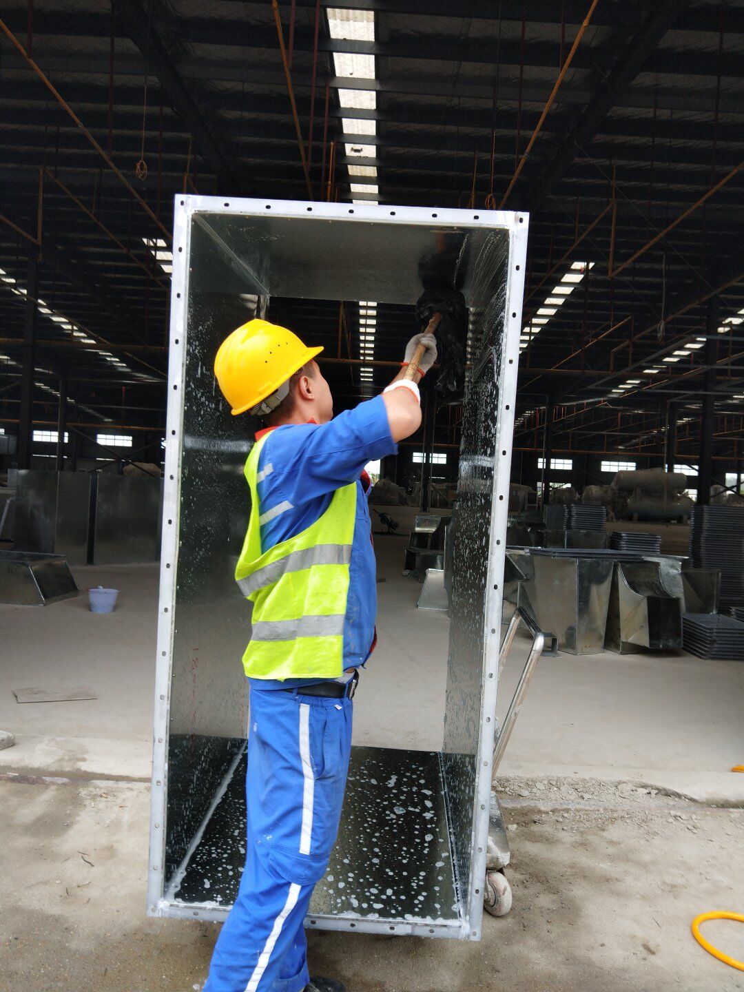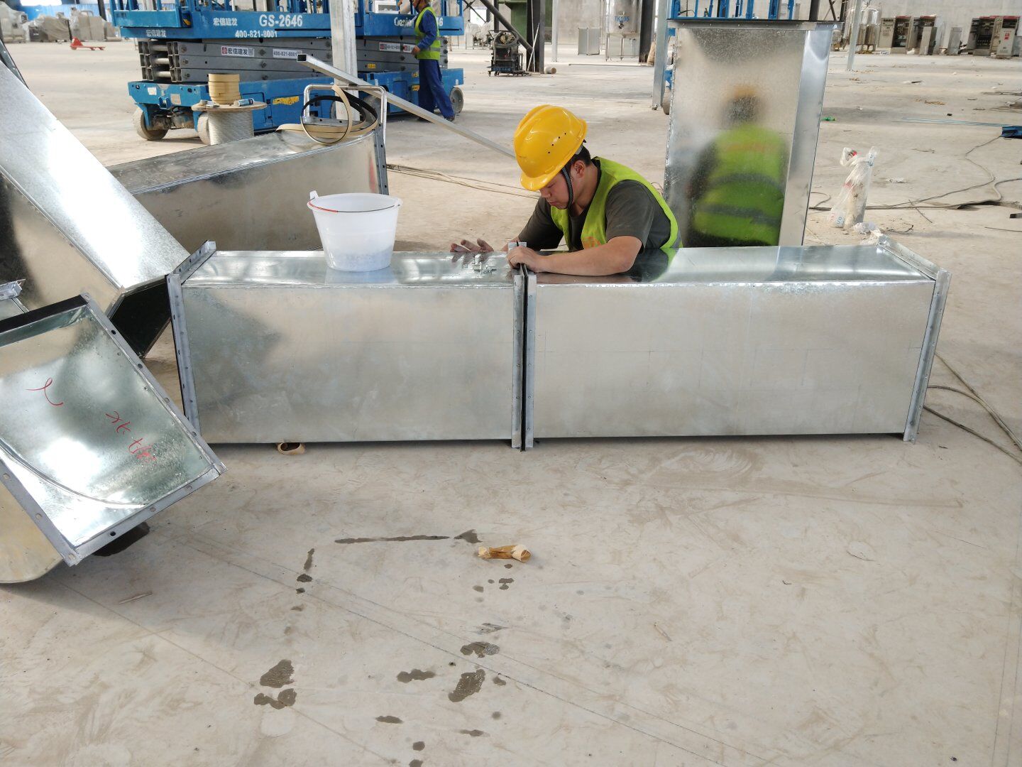 1、風(fēng)管主管半成品組裝完成; 2、風(fēng)管主管清洗,打膠密封,吊裝施工