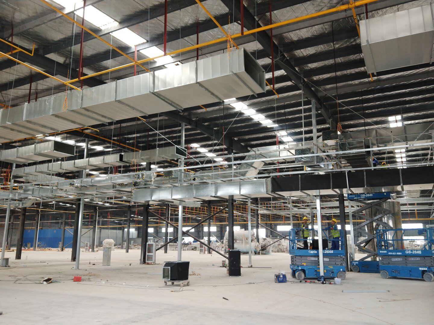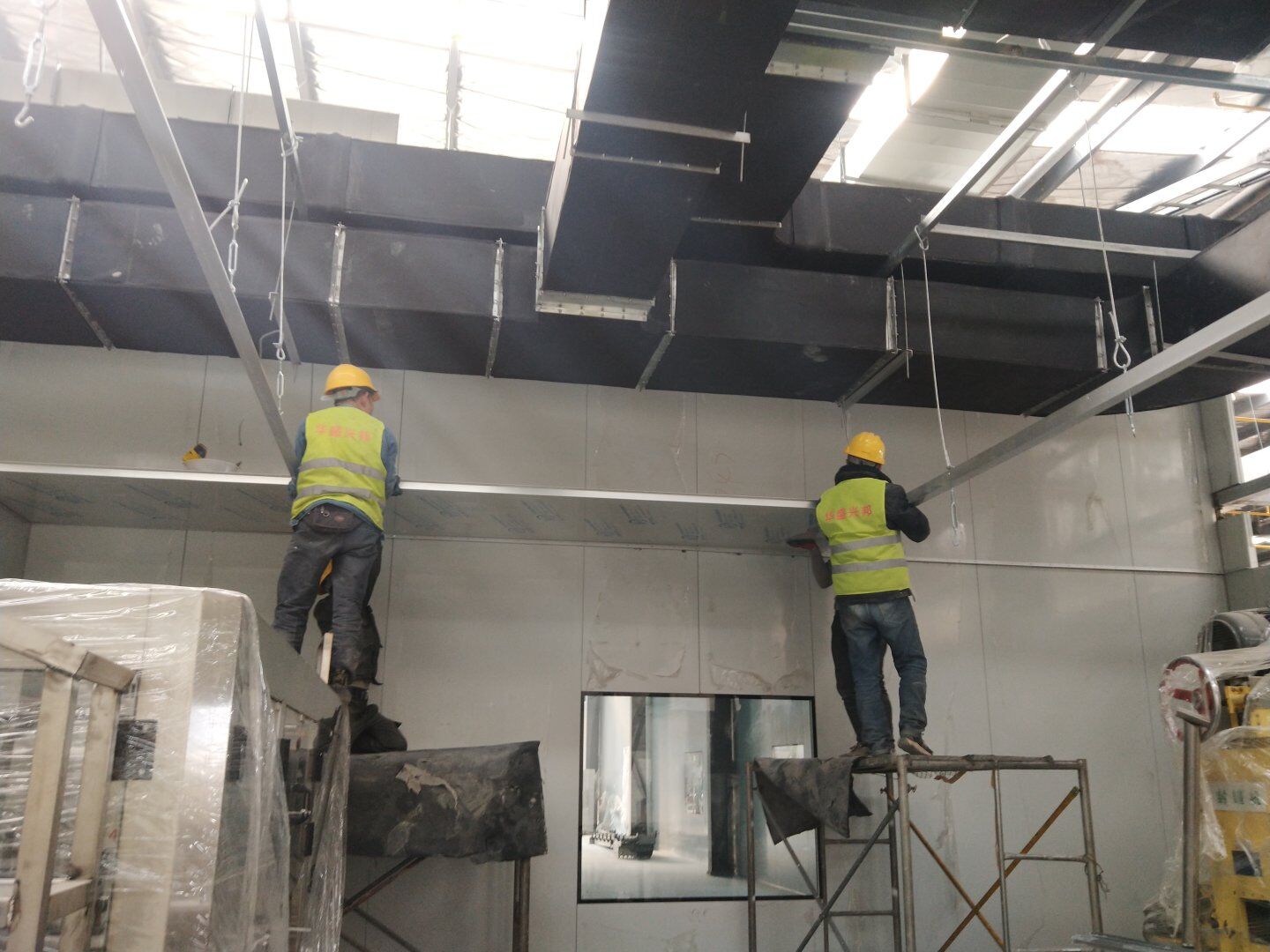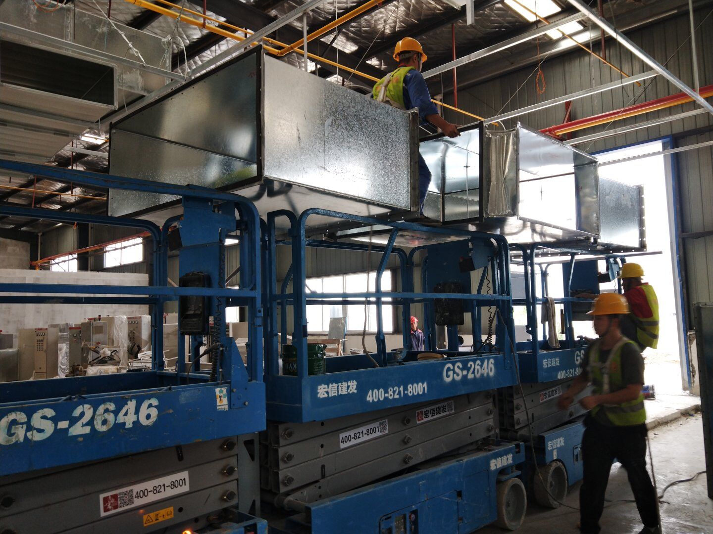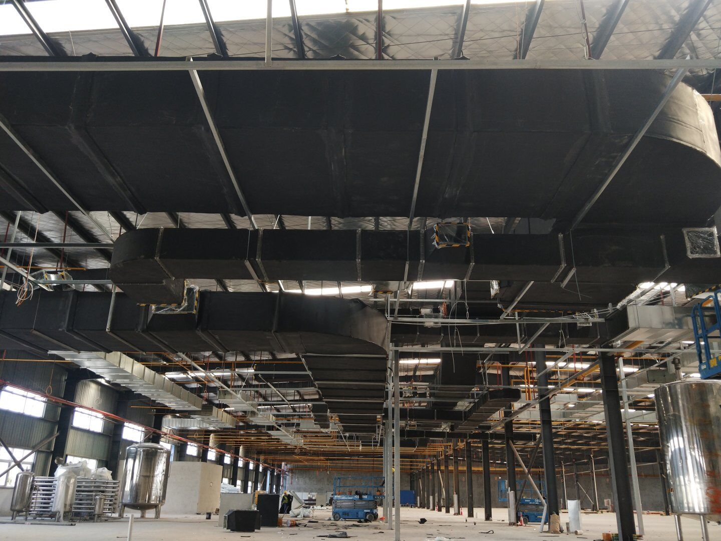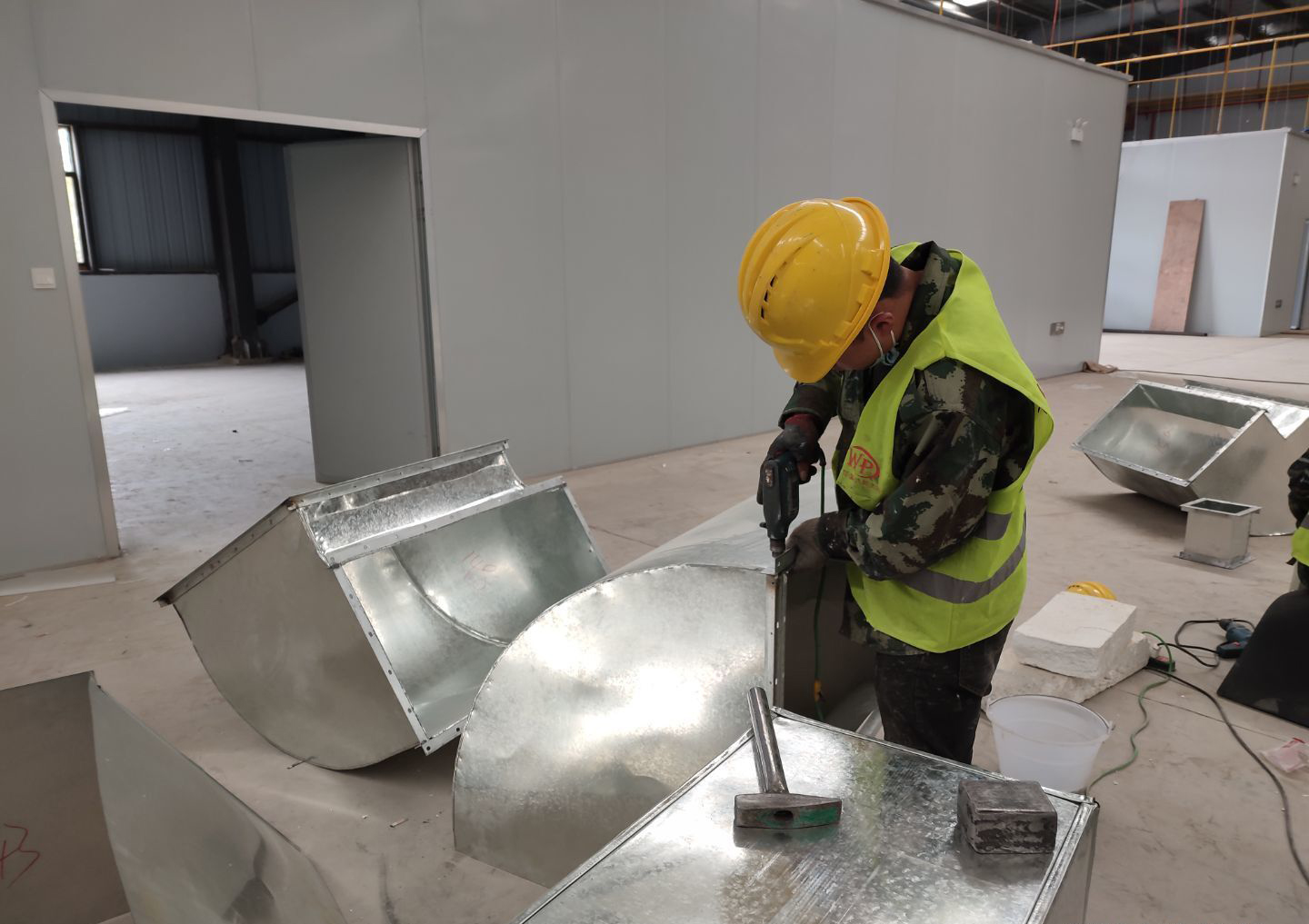 1、風(fēng)管主管半成品組裝完成; 2、風(fēng)管主管清洗,打膠密封,吊裝施工
