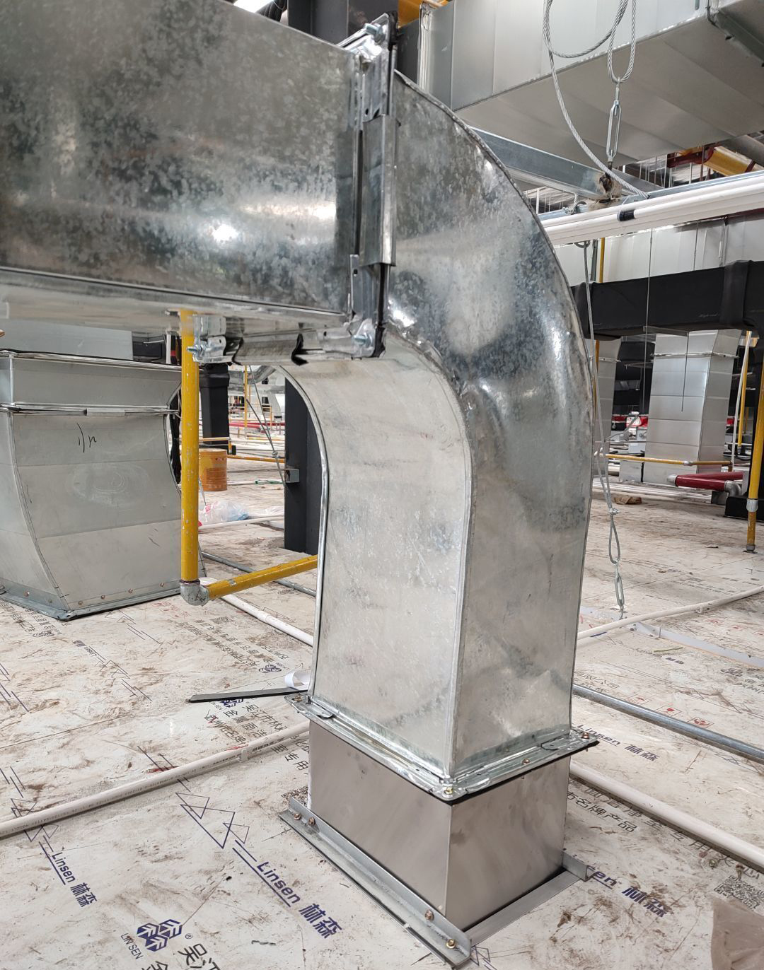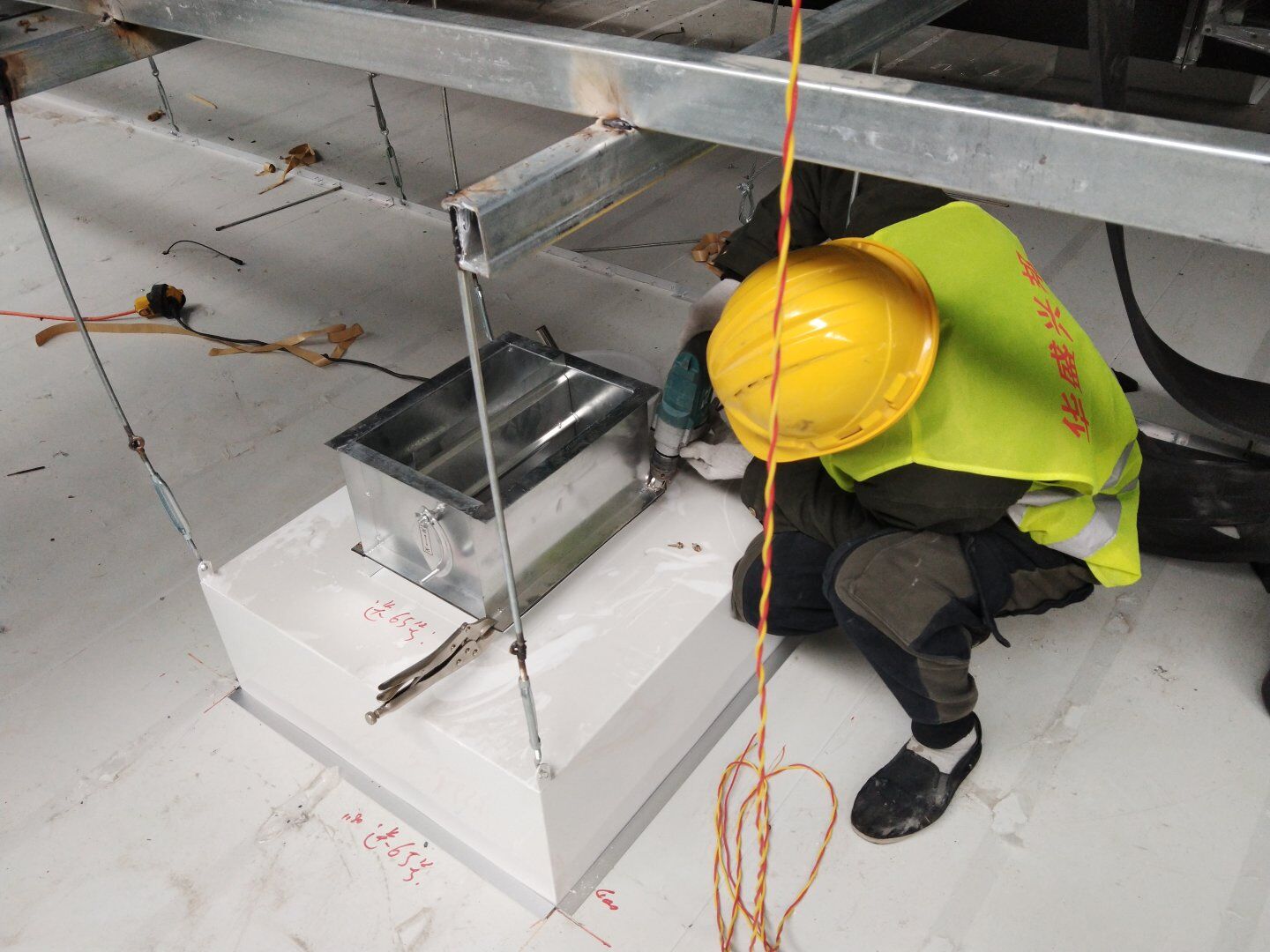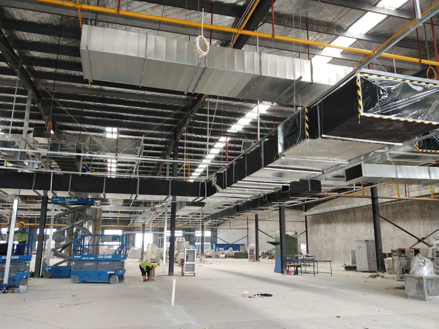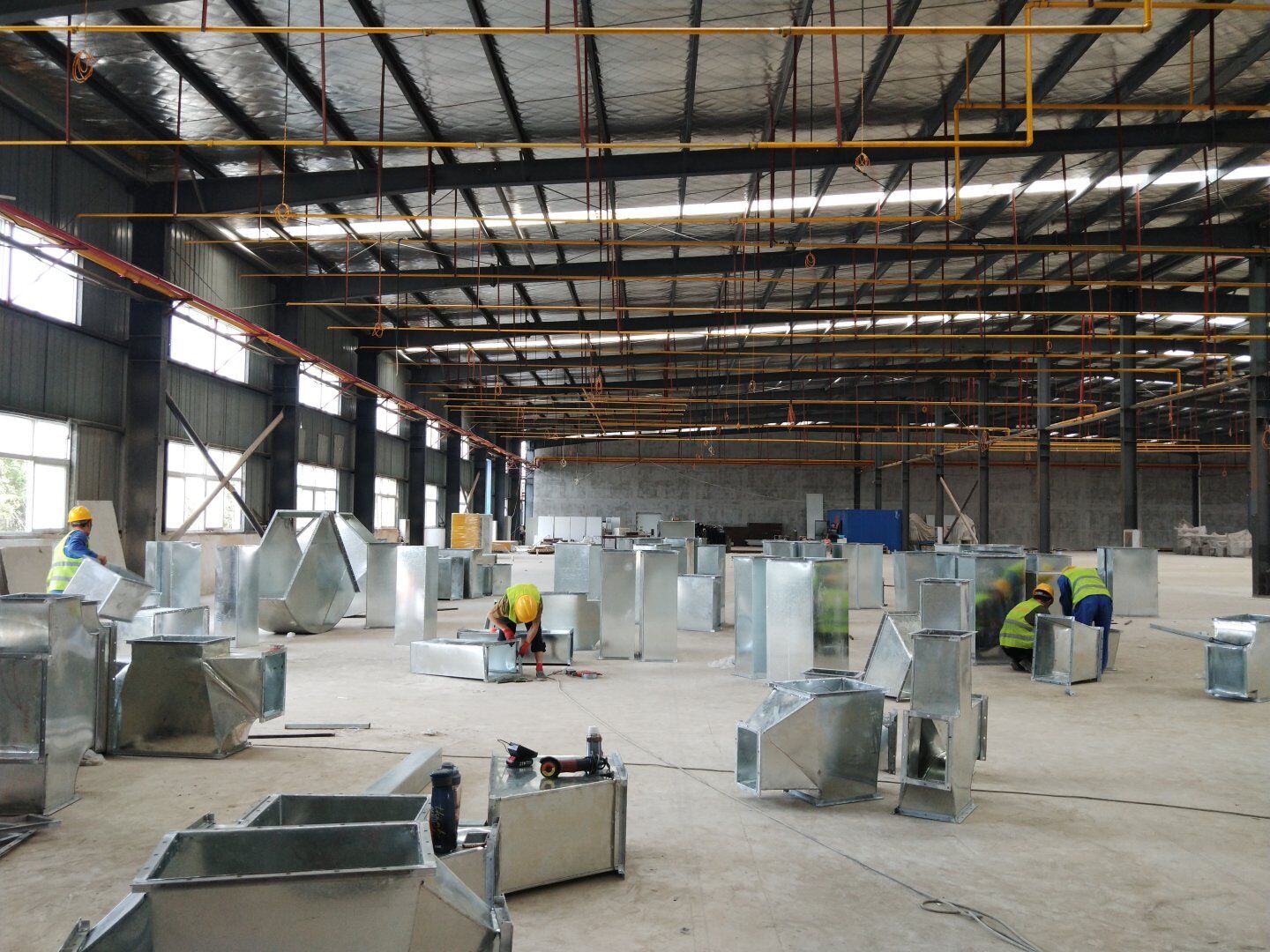 1、風(fēng)管主管半成品組裝完成; 2、風(fēng)管主管清洗,打膠密封,吊裝施工