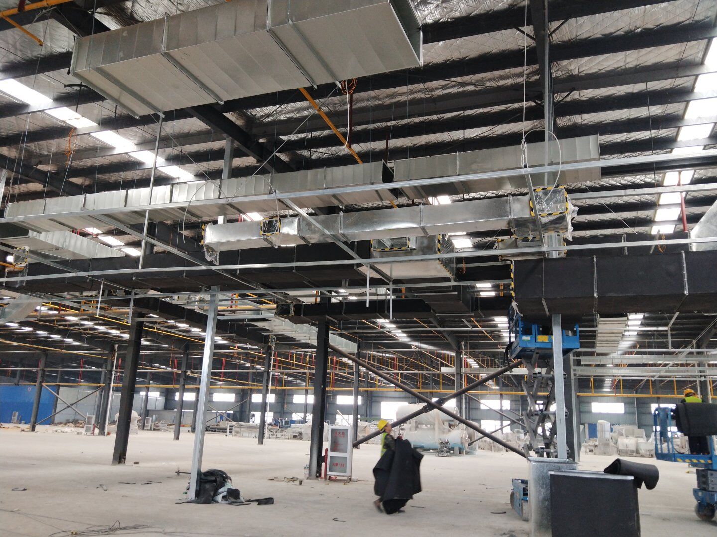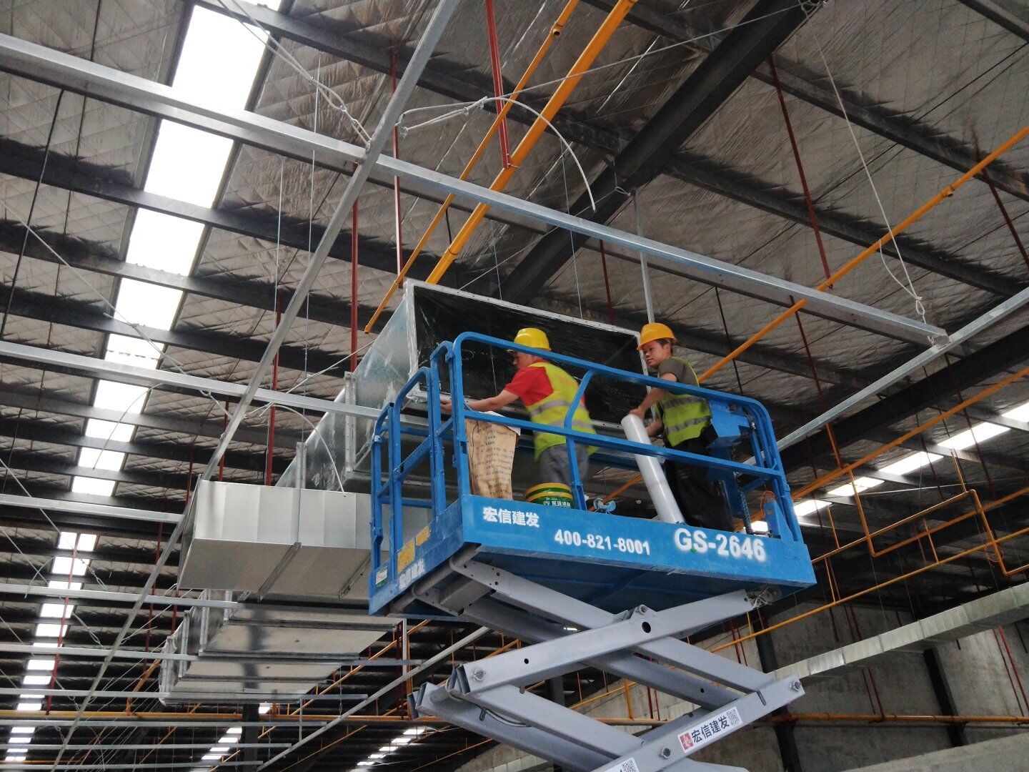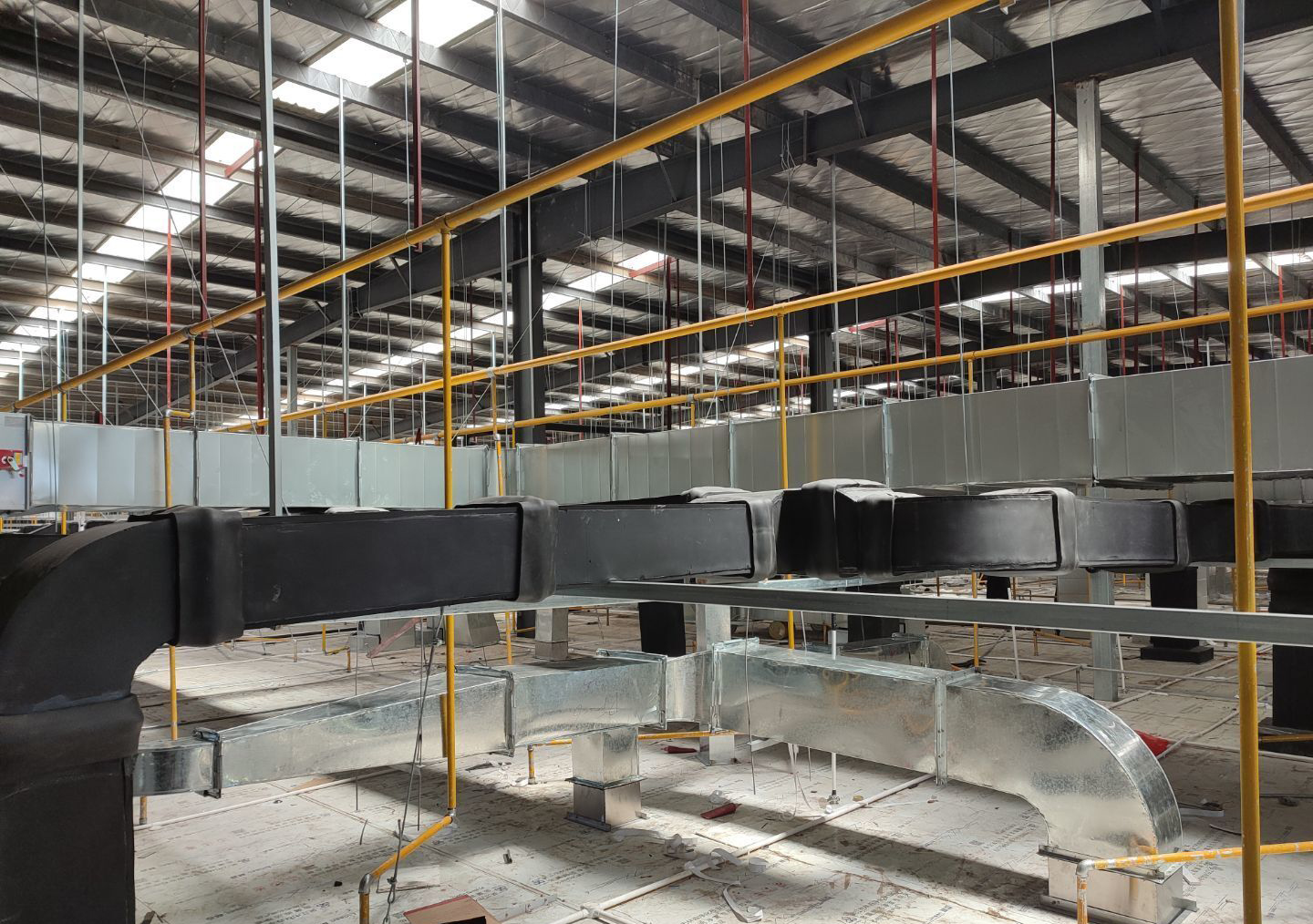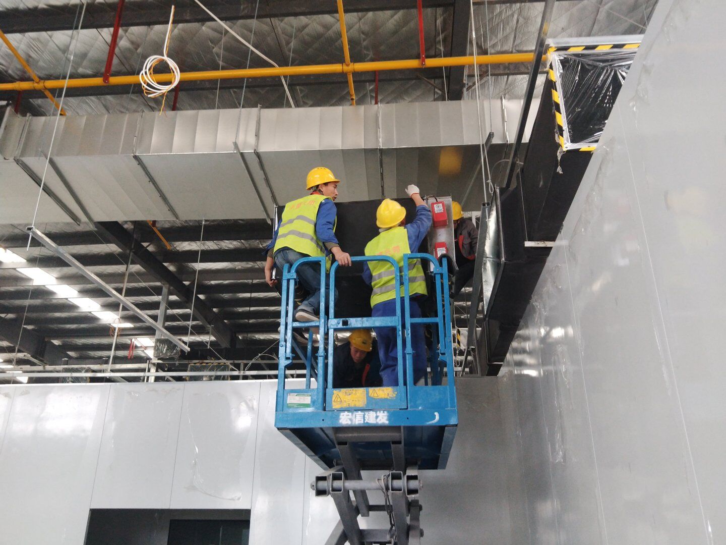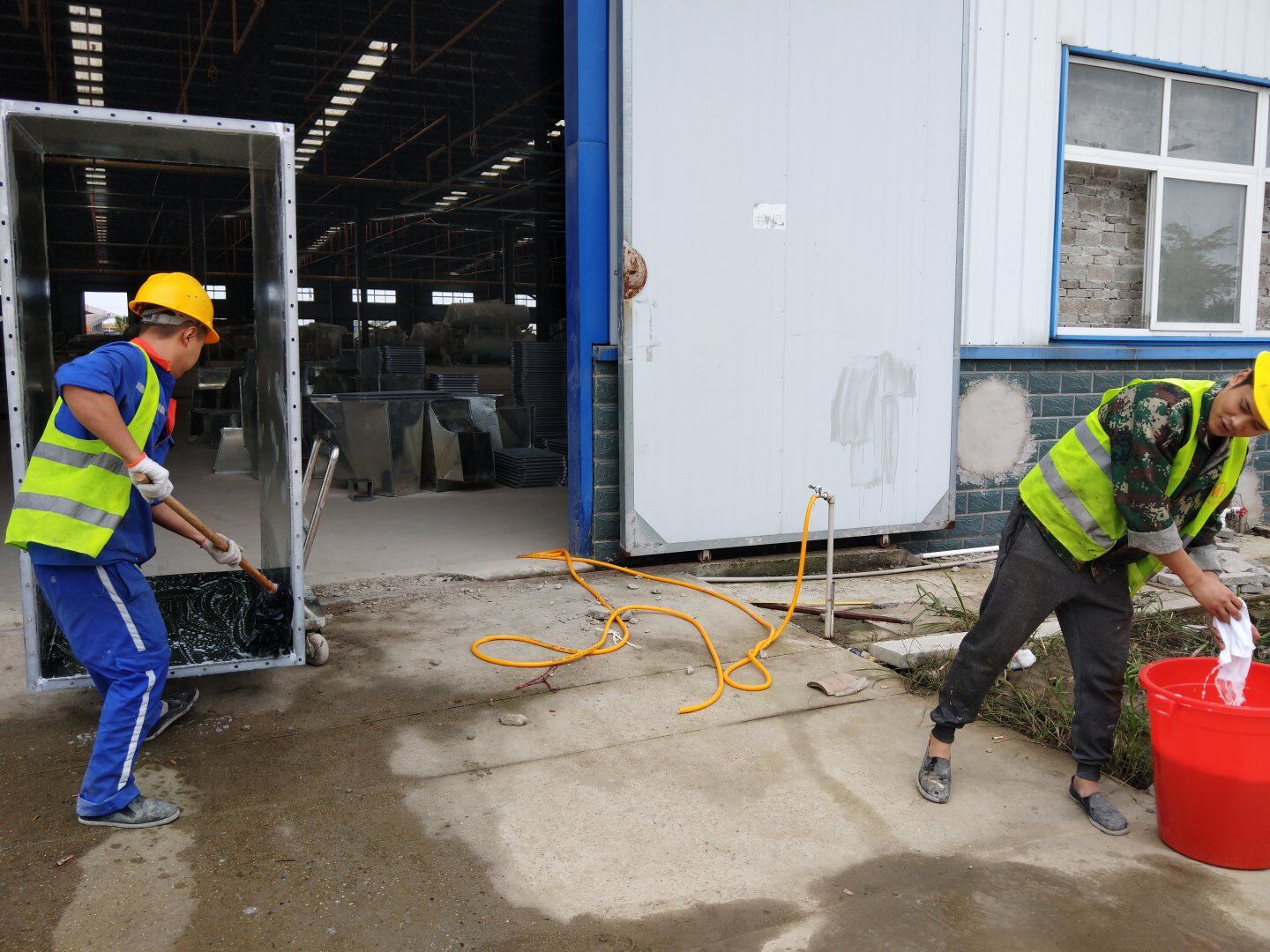 1、風(fēng)管主管半成品組裝完成; 2、風(fēng)管主管清洗,打膠密封,吊裝施工