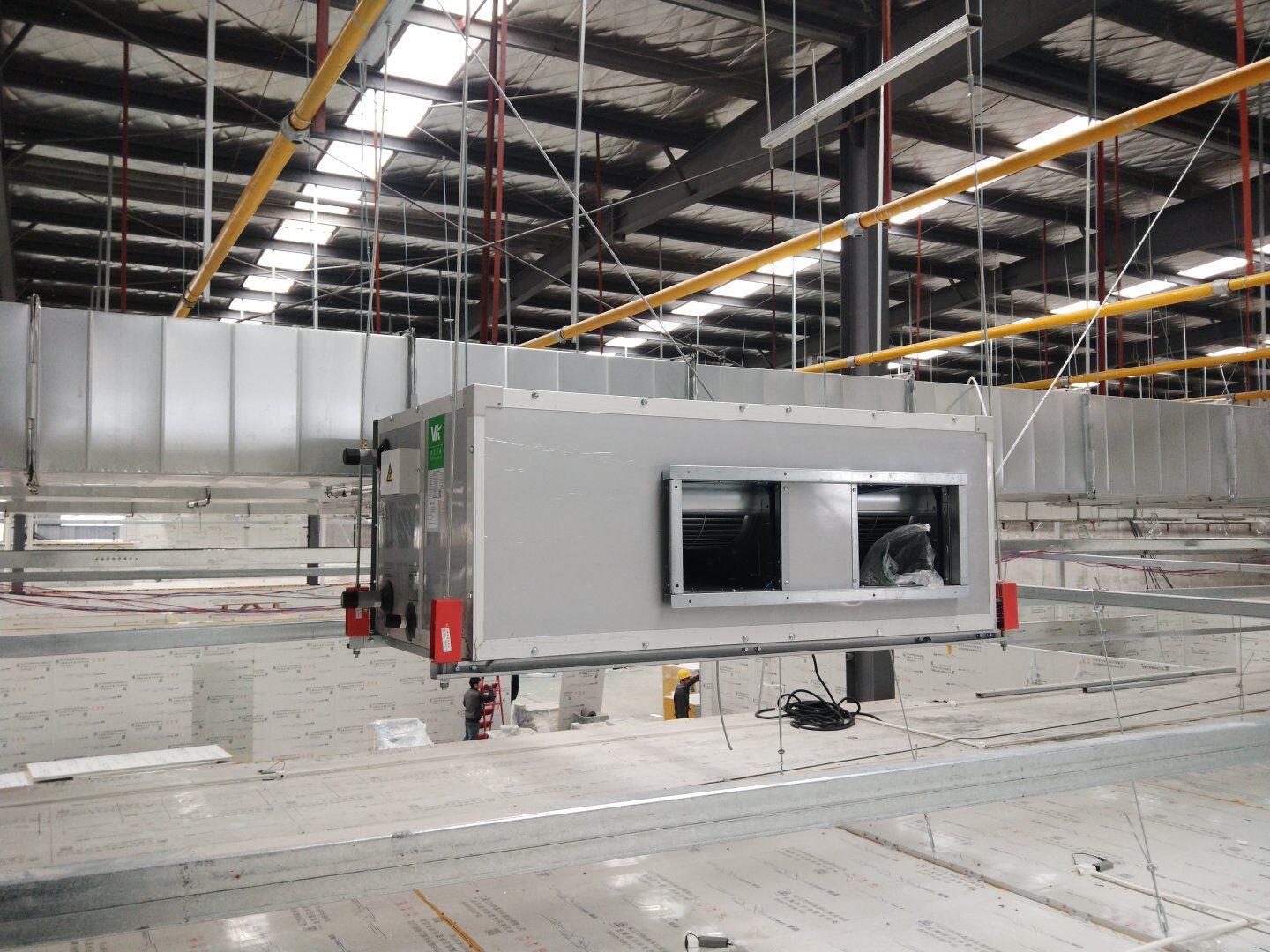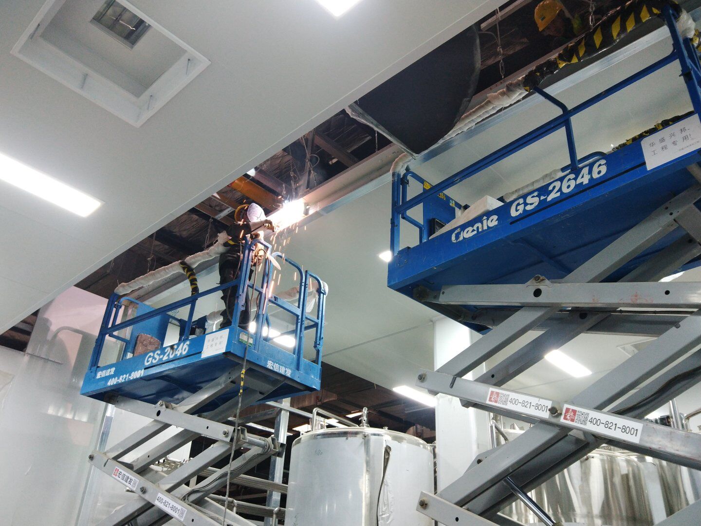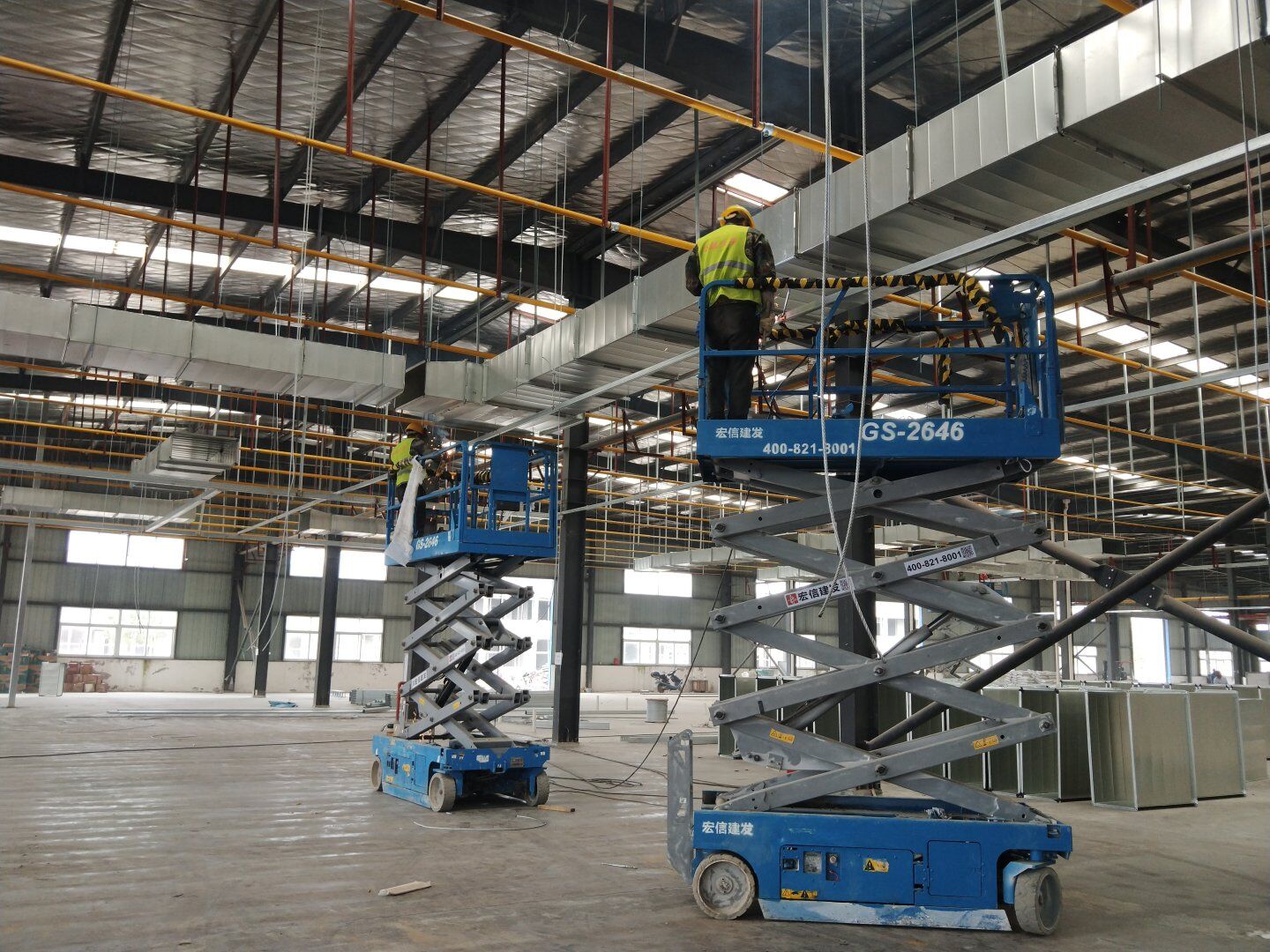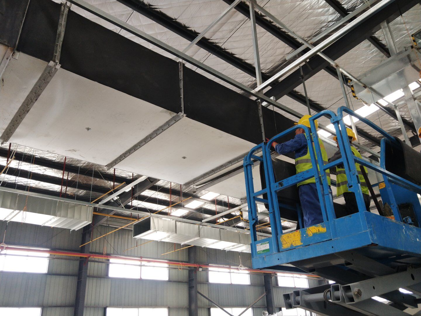 1、風(fēng)管主管半成品組裝完成; 2、風(fēng)管主管清洗,打膠密封,吊裝施工