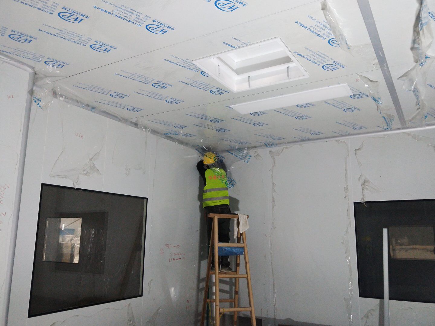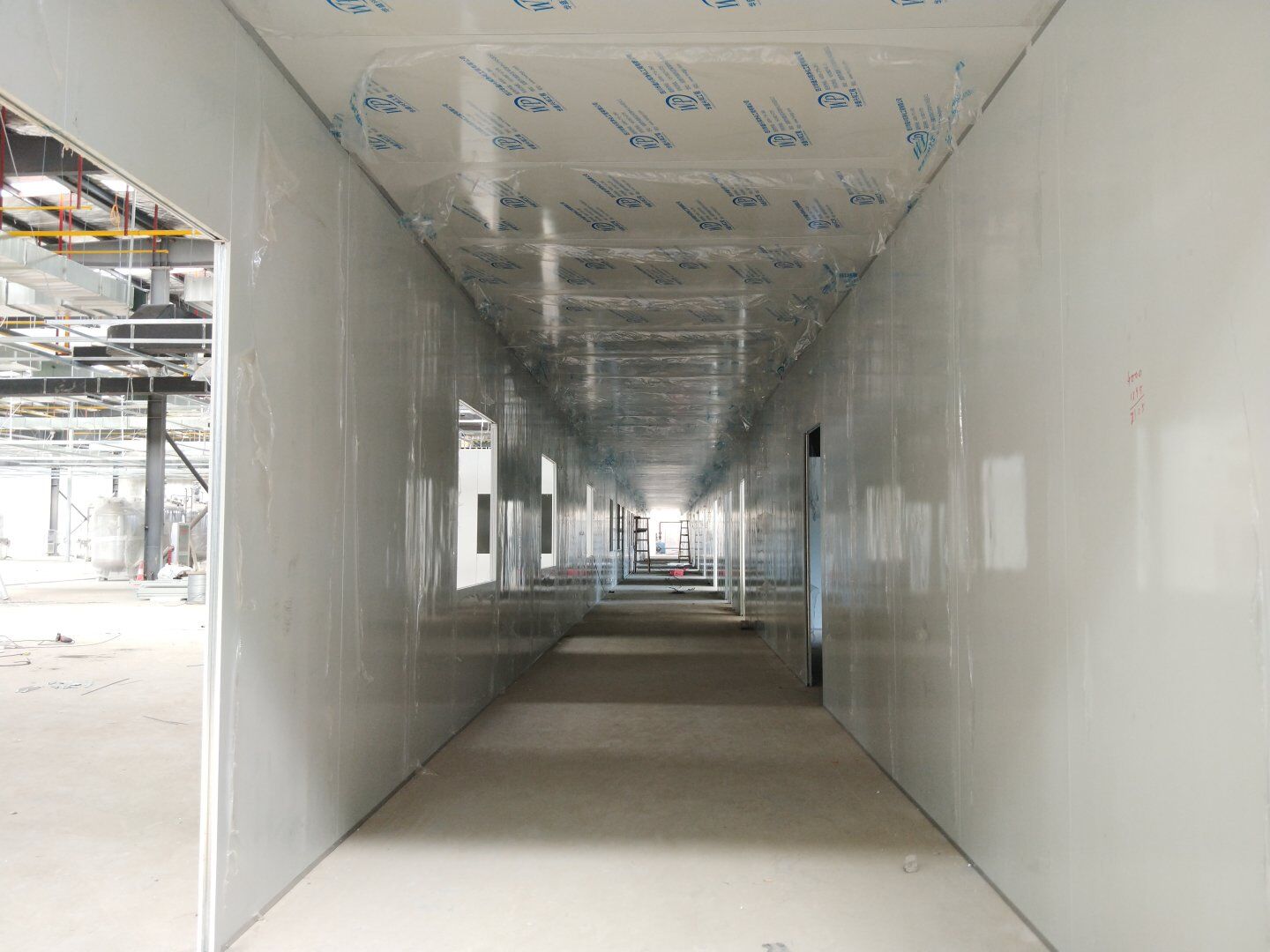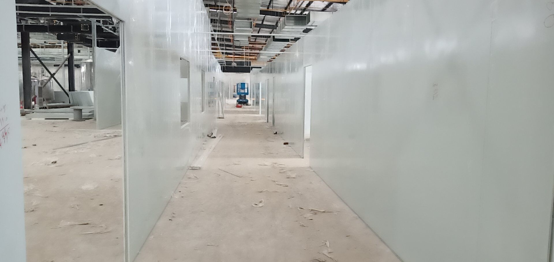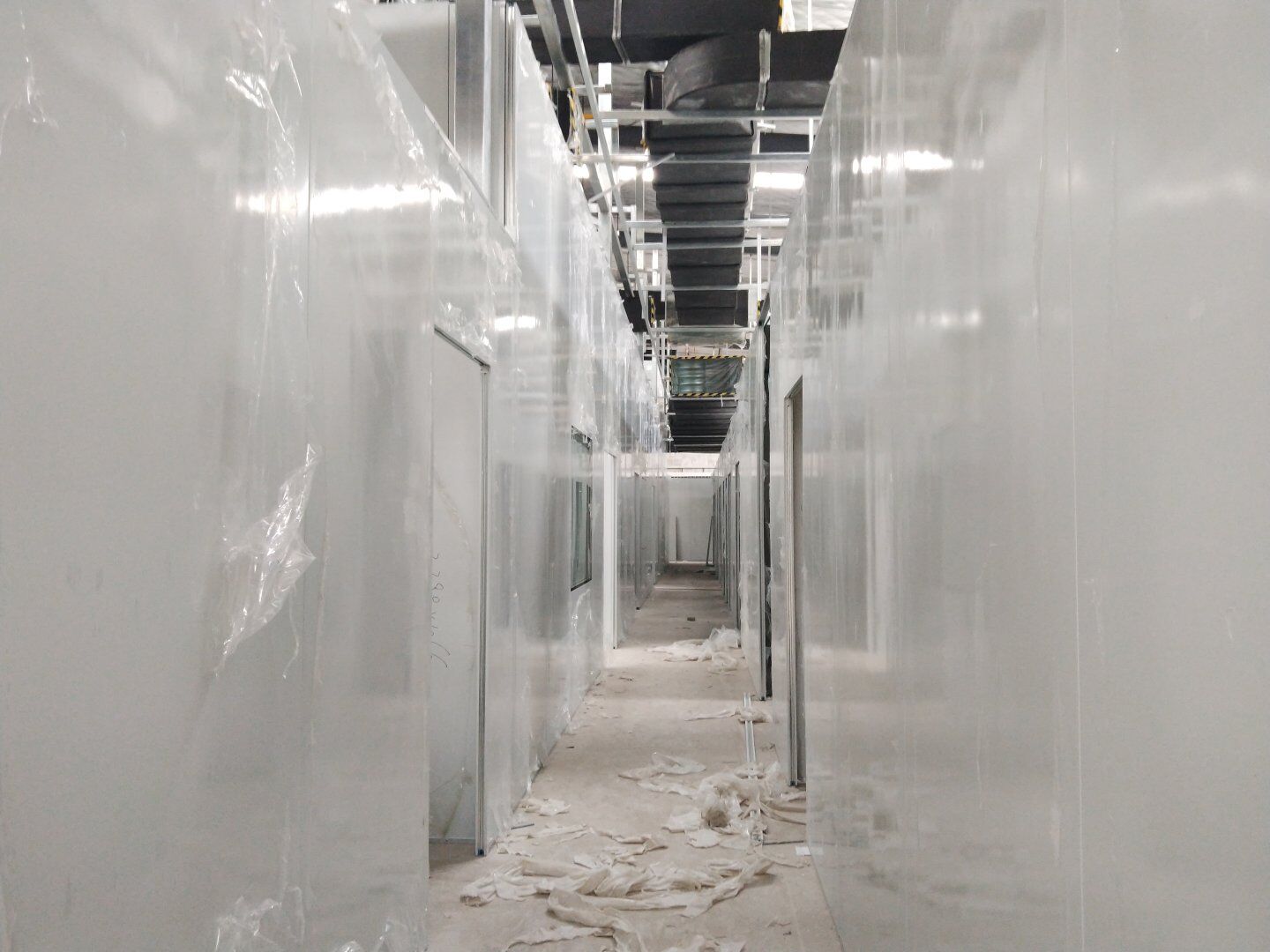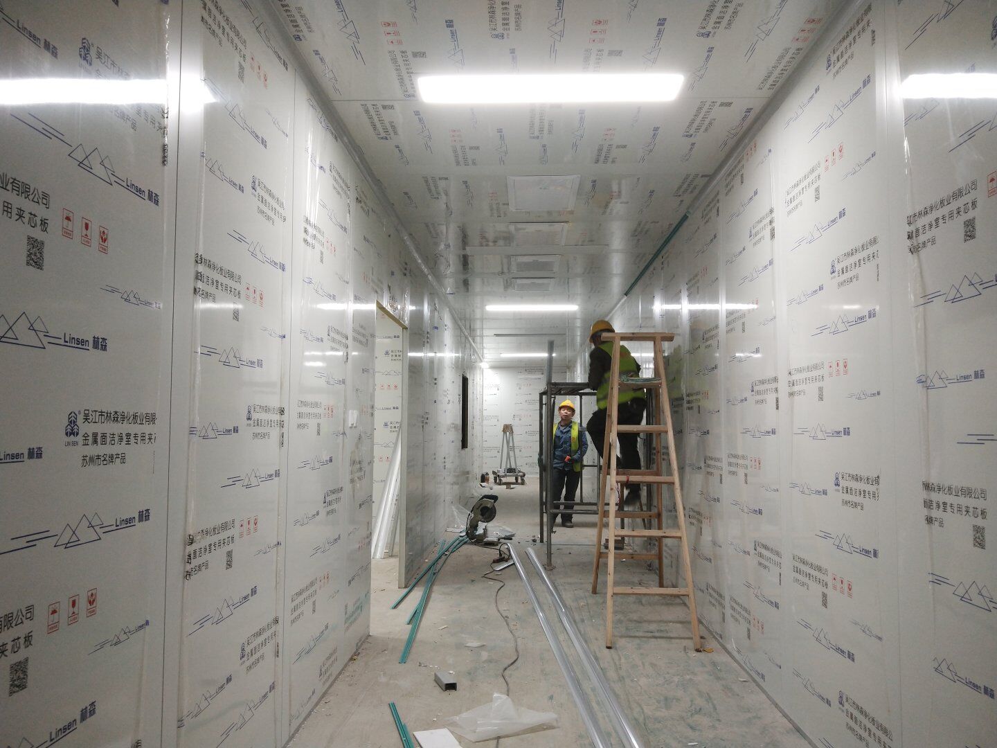 1,彩鋼板墻板完成75% 2,回風(fēng)夾道安裝,撕膜,打膠完成15% 3,潔凈窗安裝完成60%。