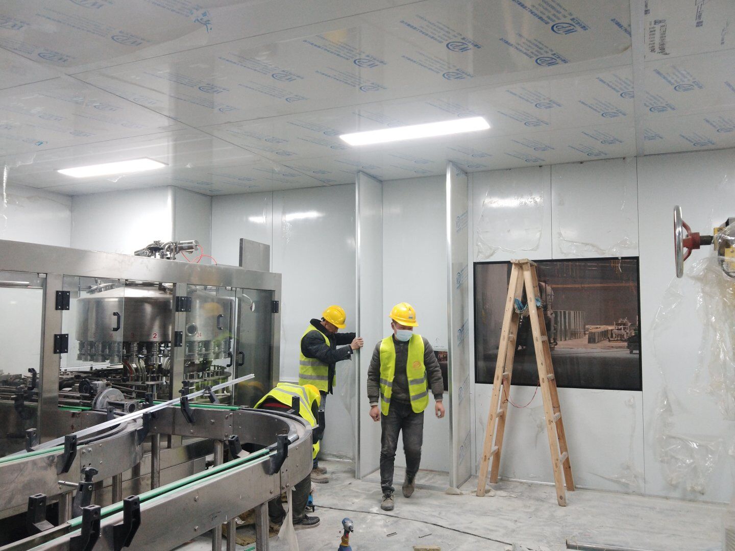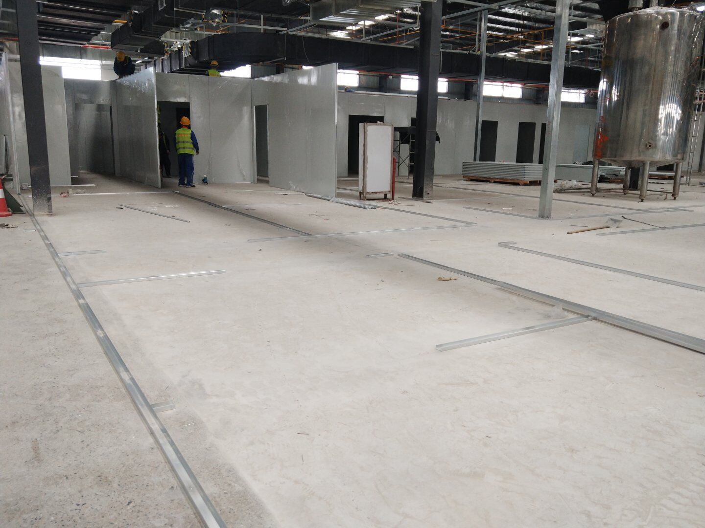 液體車(chē)間施工: 1,前期預(yù)留通道墻板安裝完成50%,并預(yù)留可拆卸設(shè)備門(mén) 飲片車(chē)間: 2,所有墻板完成,頂板完成95%