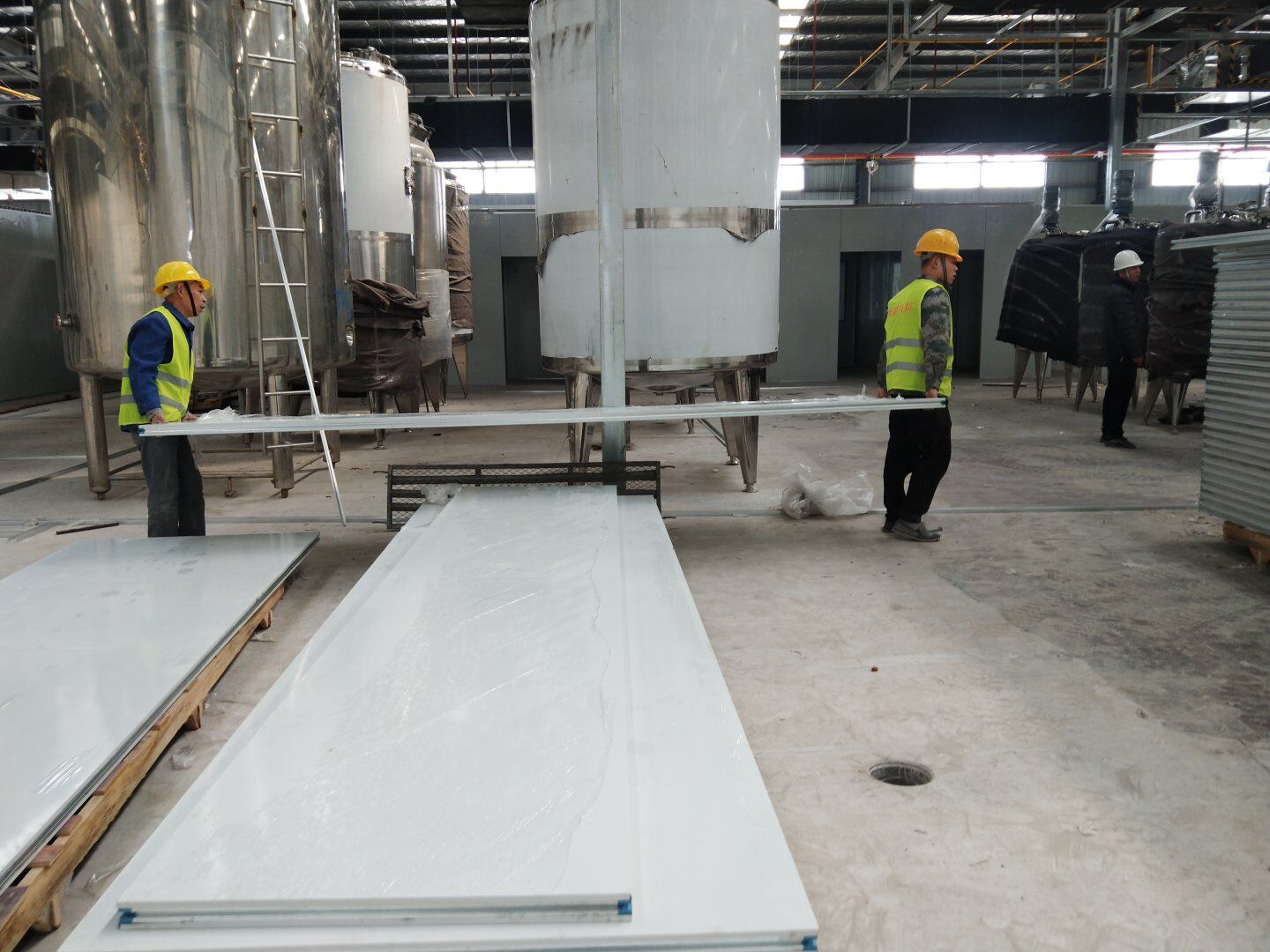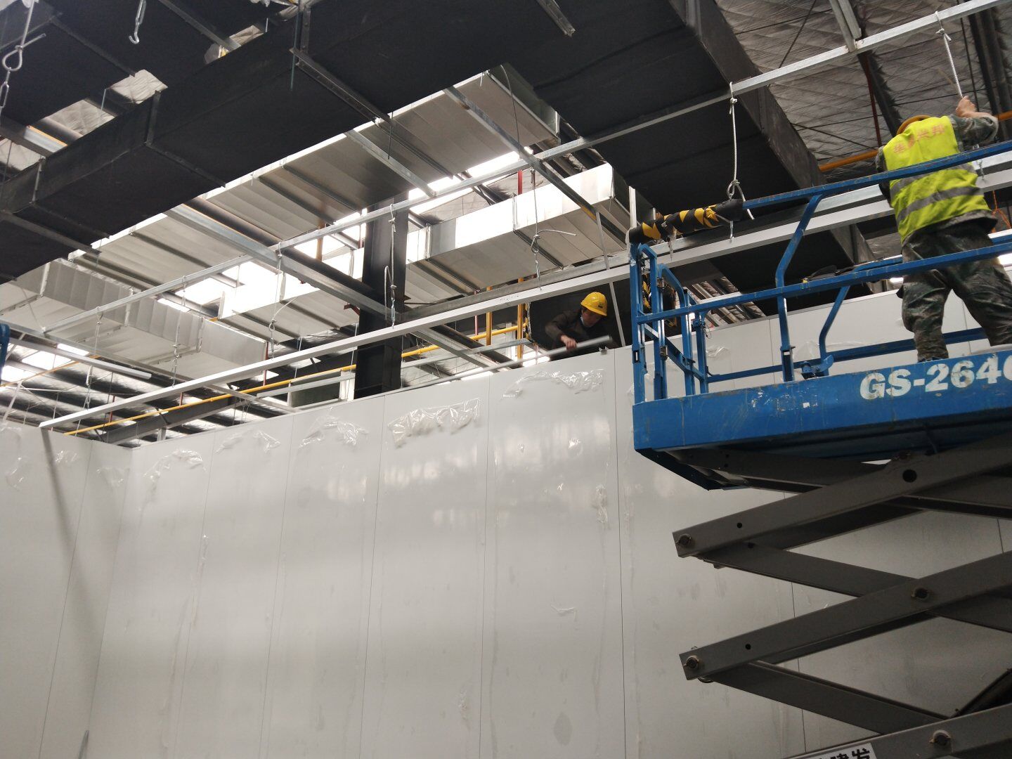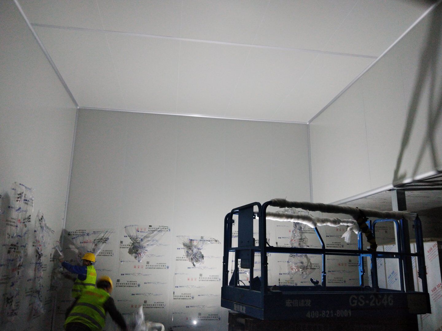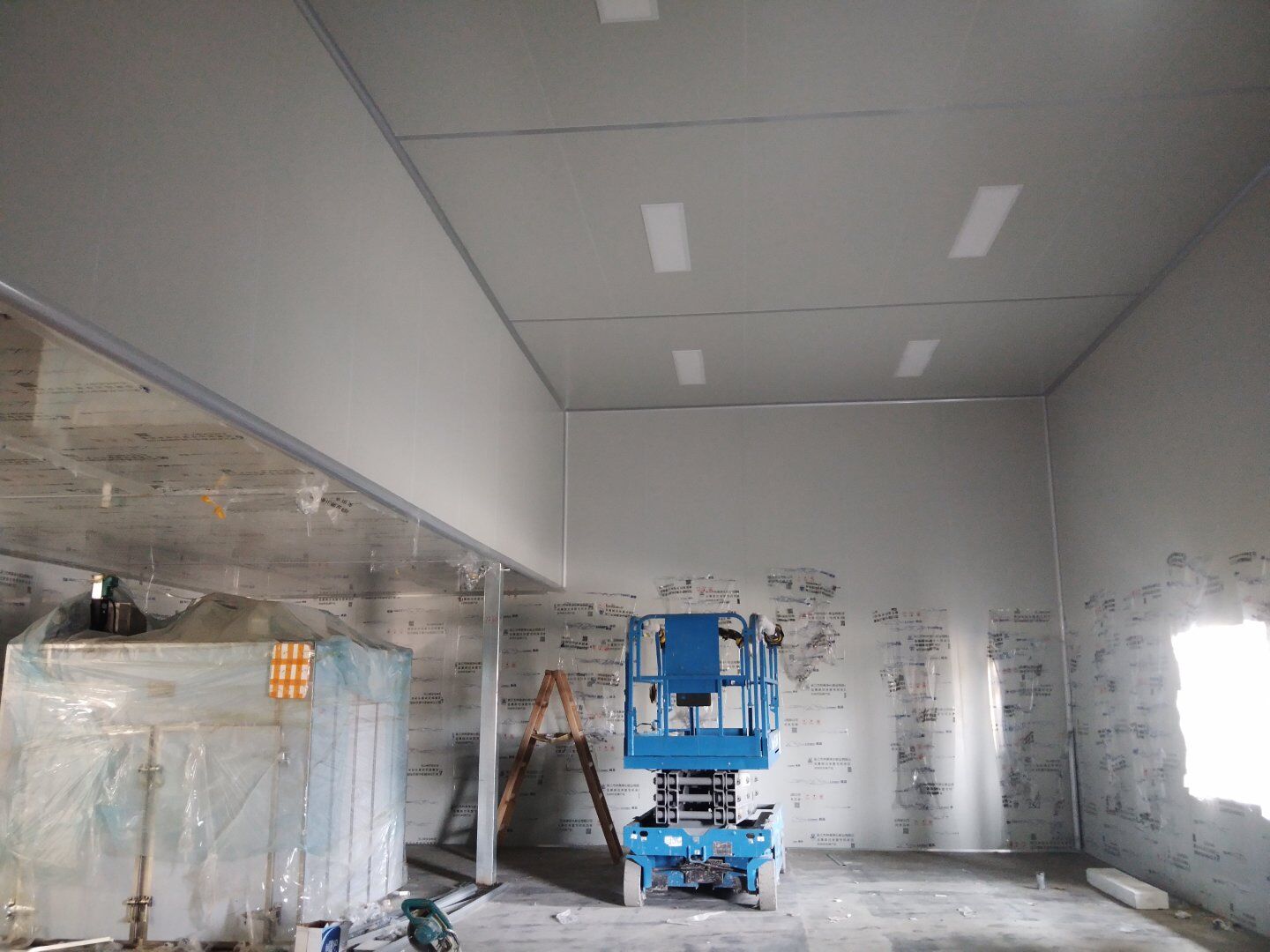 1,除預(yù)留設(shè)備通道外的彩鋼板墻板完成; 2,彩鋼板頂板完成80%。