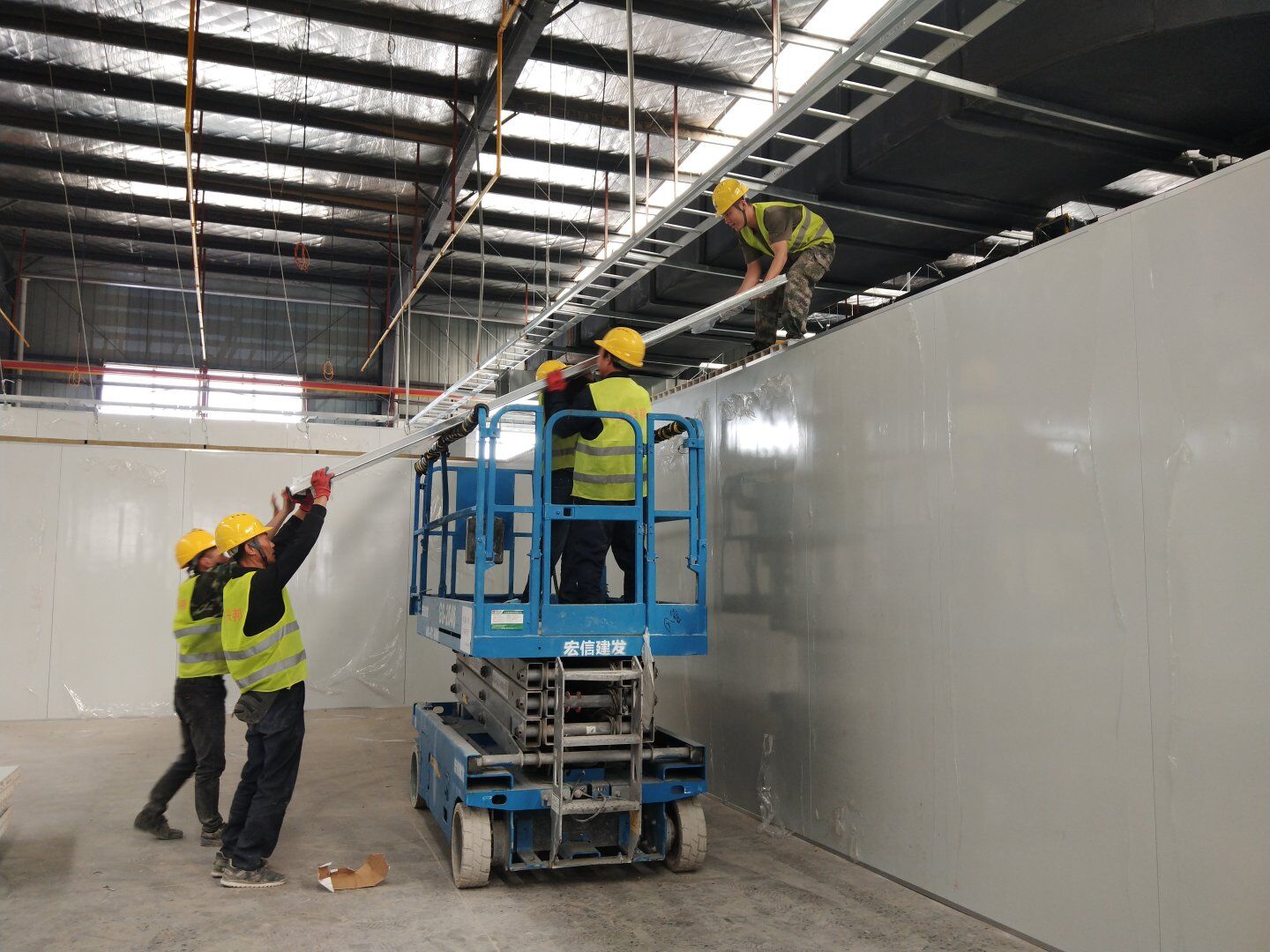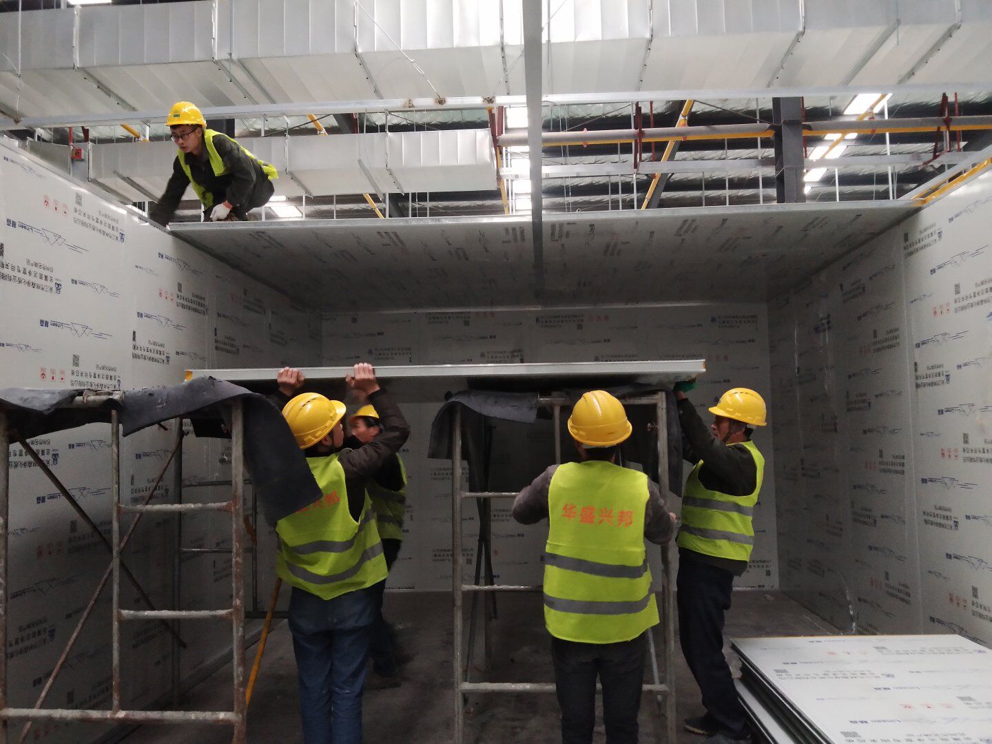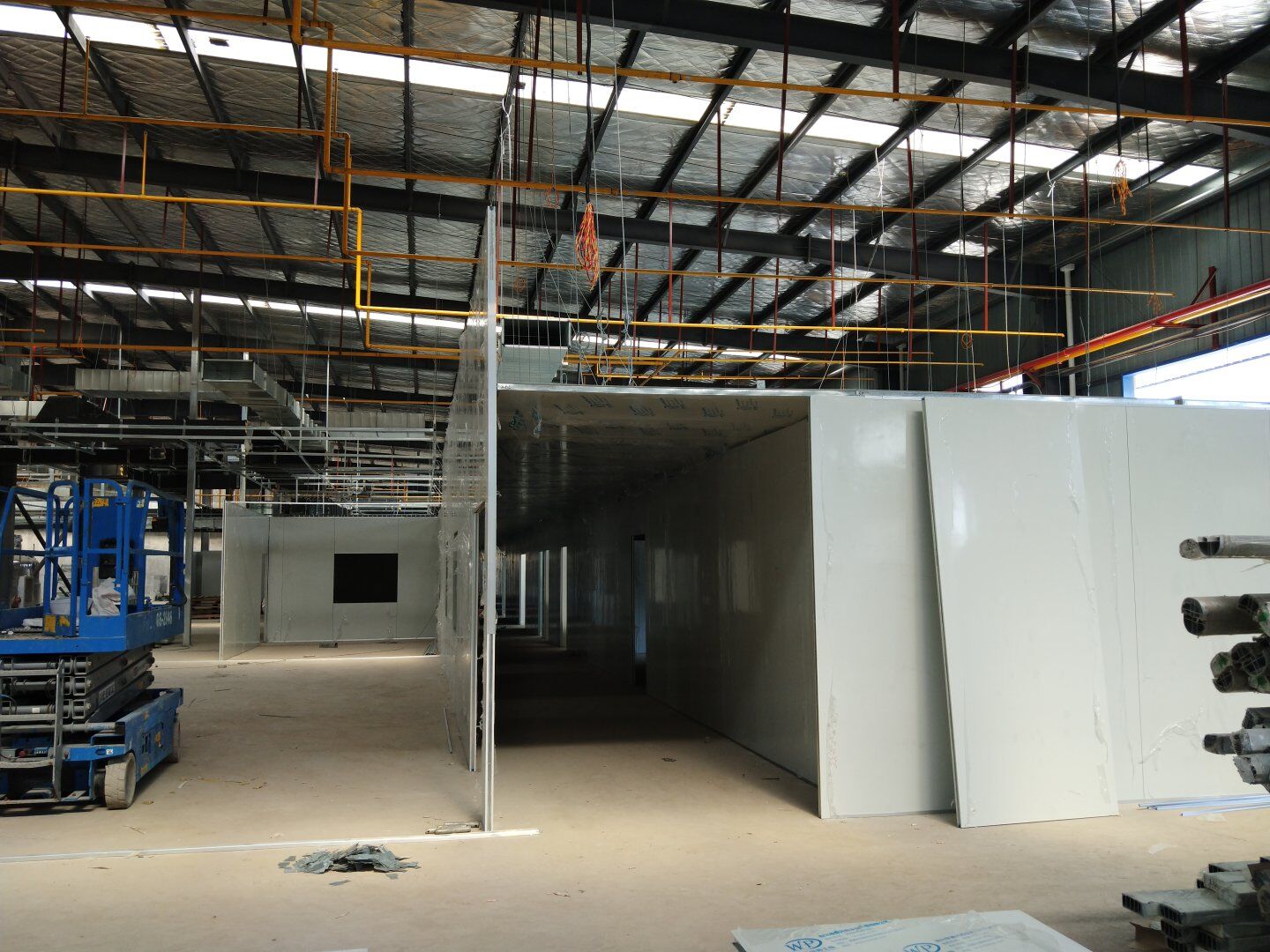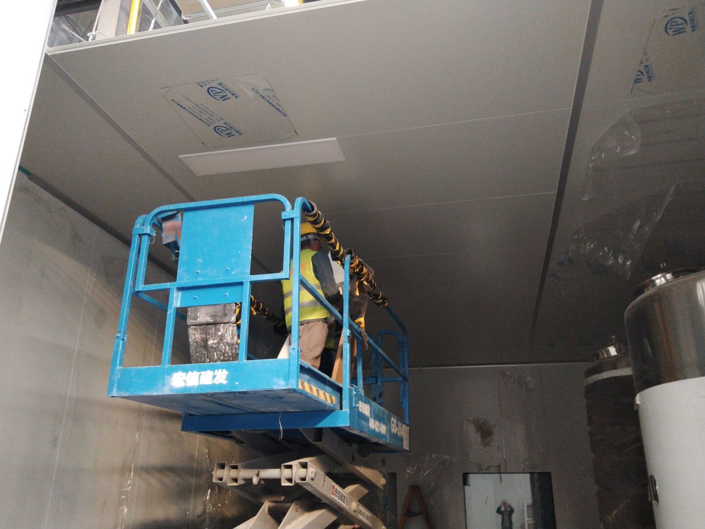 1,除預(yù)留設(shè)備通道外的彩鋼板墻板完成; 2,彩鋼板頂板完成80%。
