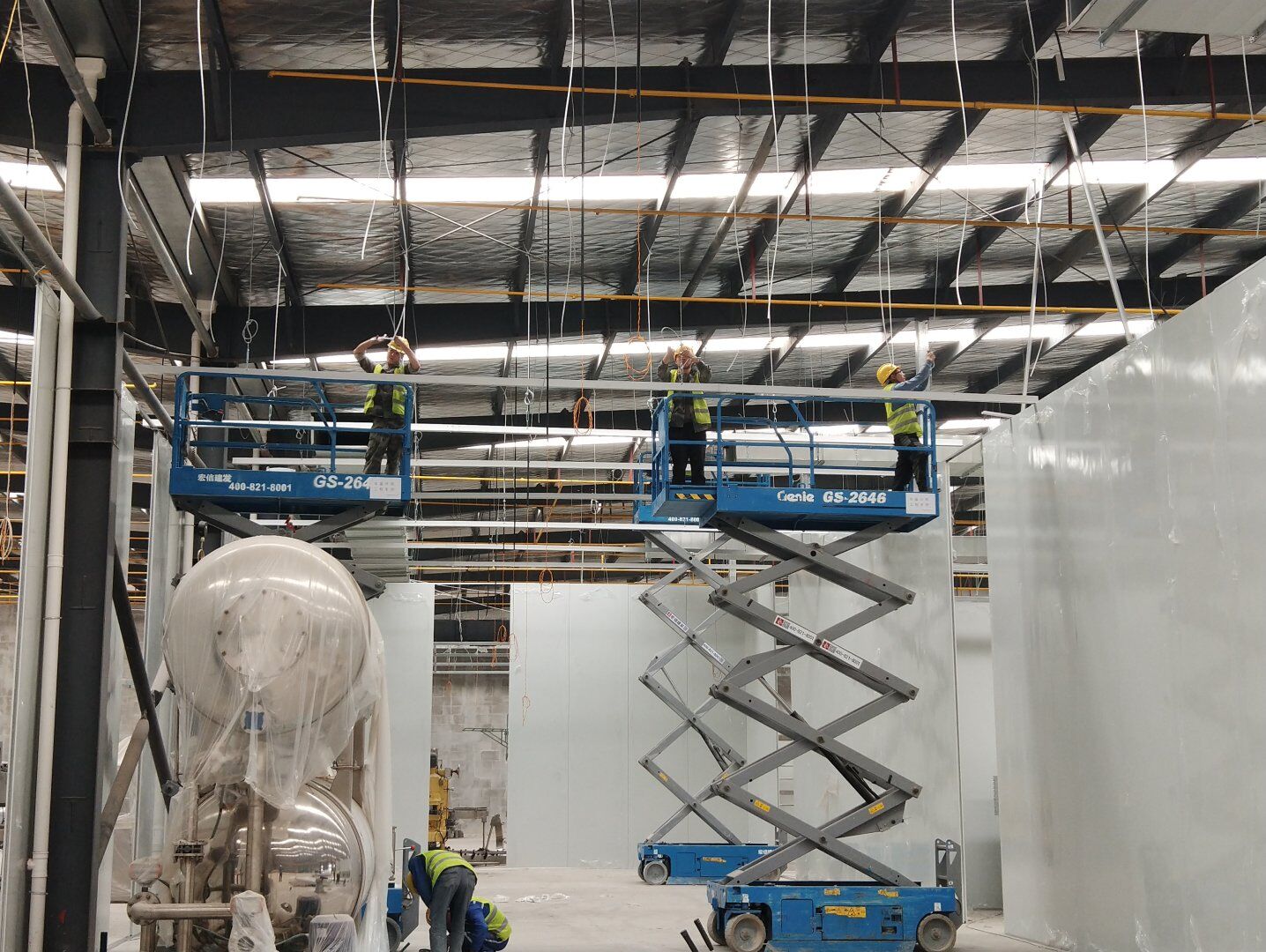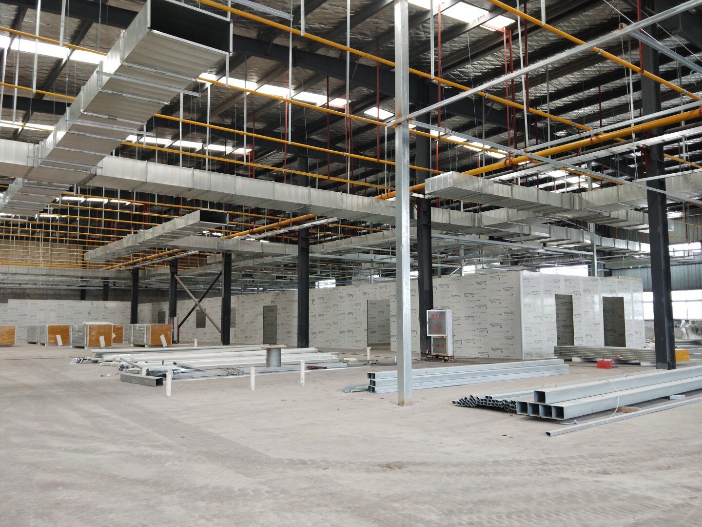 二次吊掛鋼構(gòu)網(wǎng)架施工;車(chē)間定基準(zhǔn)線(xiàn)及彩鋼板隔墻放線(xiàn);凈化風(fēng)管施工