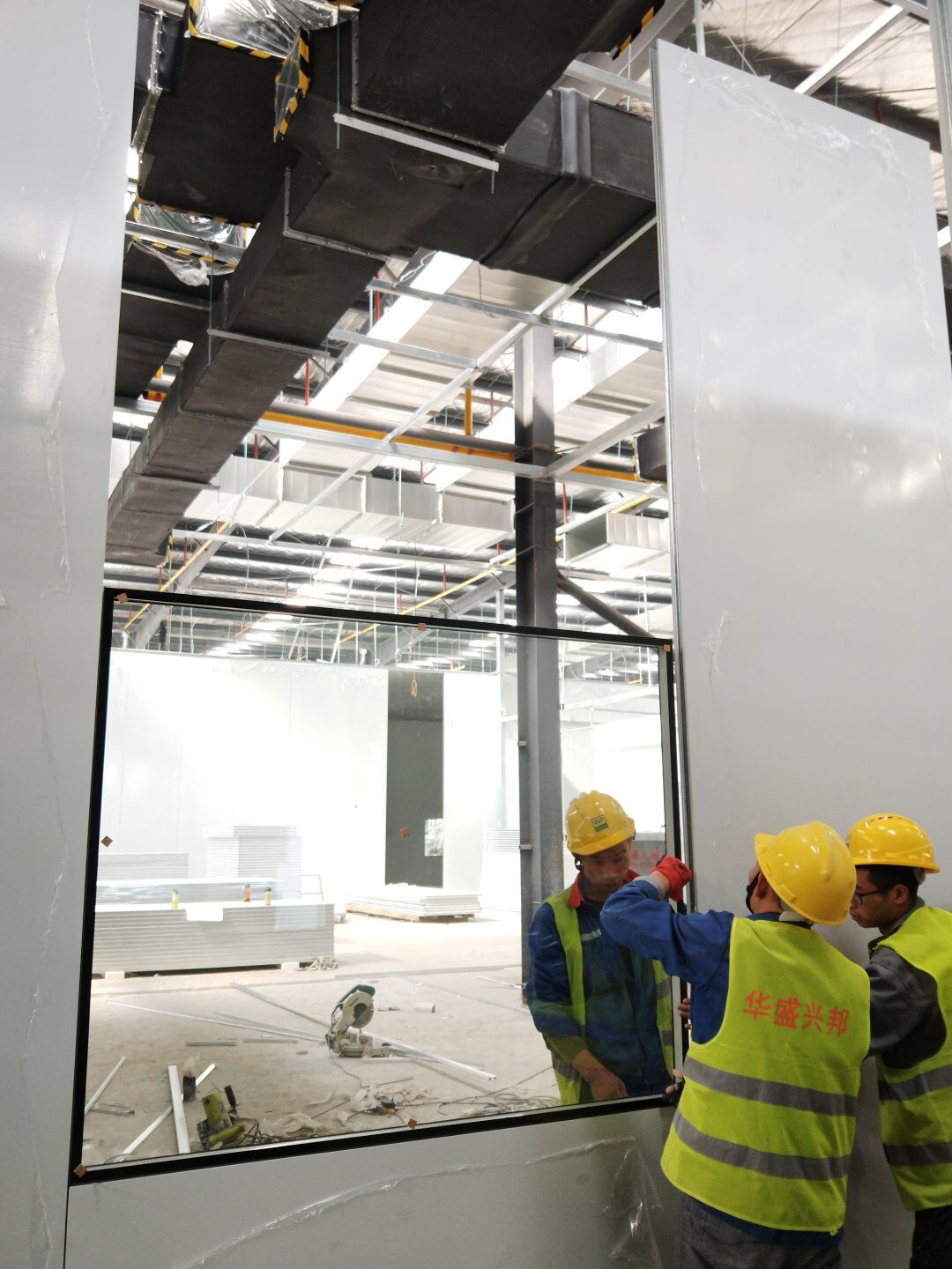 1,潔凈雙層觀(guān)察窗安裝完成30%; 2,高效送風(fēng)口頂板定位開(kāi)洞完成25%; 3,內(nèi)圓弧安裝完成20%