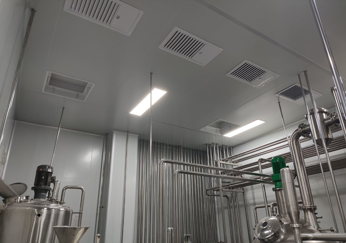 1,工礦燈配管穿線(xiàn)安裝完成50% 飲片車(chē)間 1,彩鋼板頂板安裝完成65%