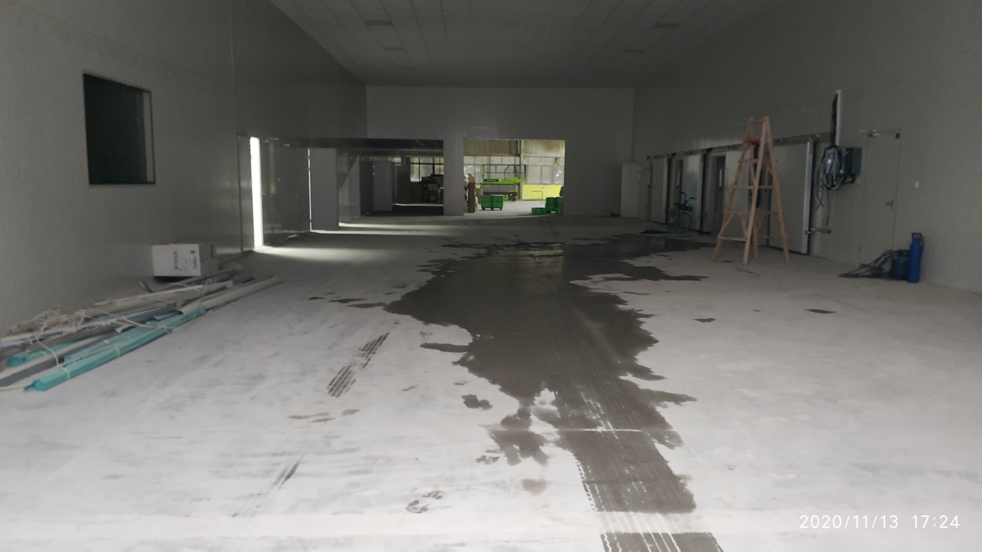 1.凍庫收邊收口完成百分之七十;2、凍庫門安裝完成百分之六十五; 3、生產車間地面鋪裝完成百分之七十; 4、生產車間排水溝貼磚完成。