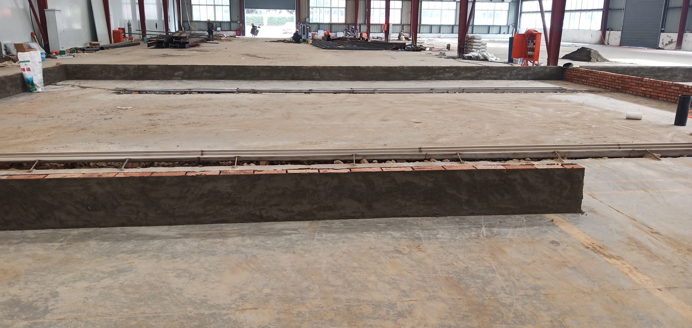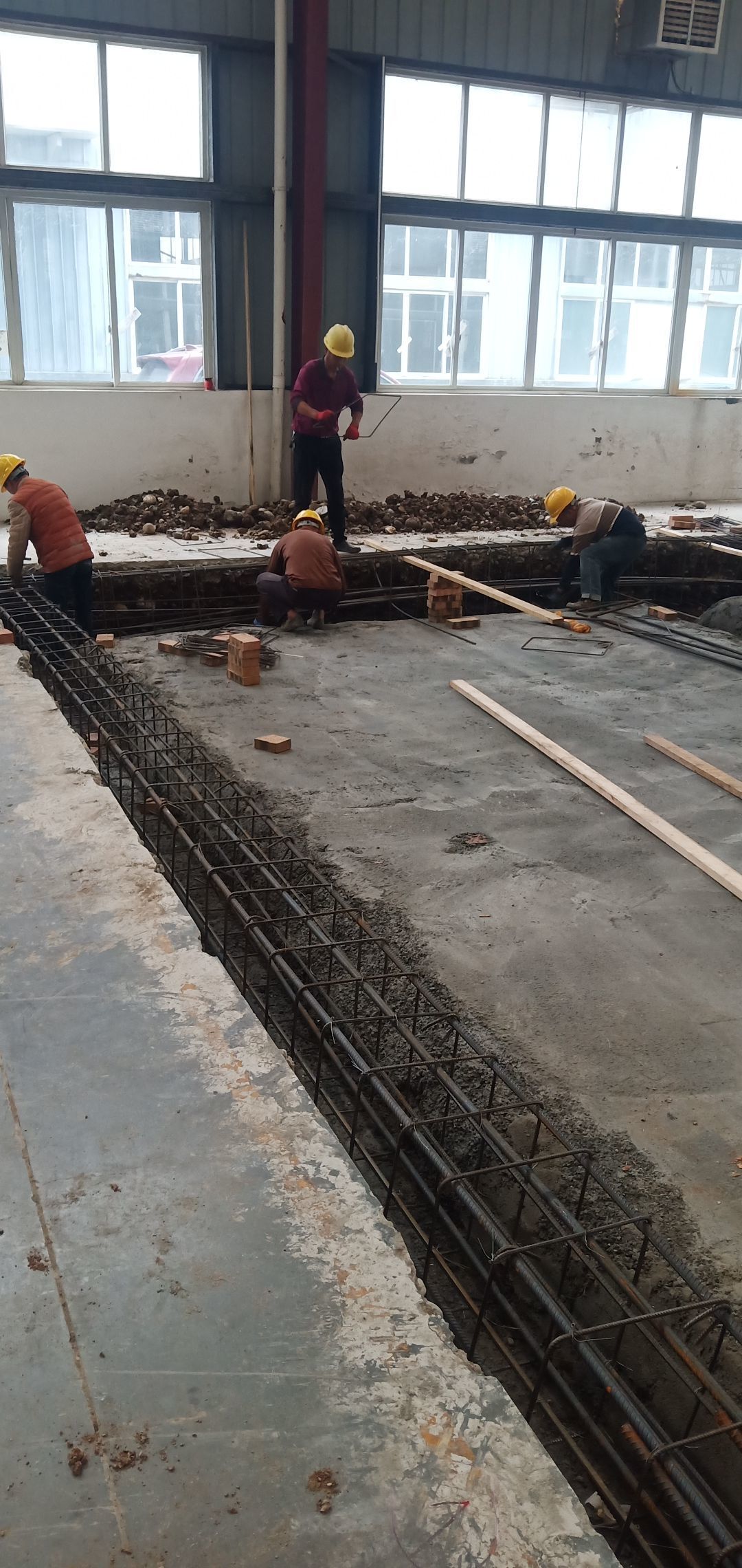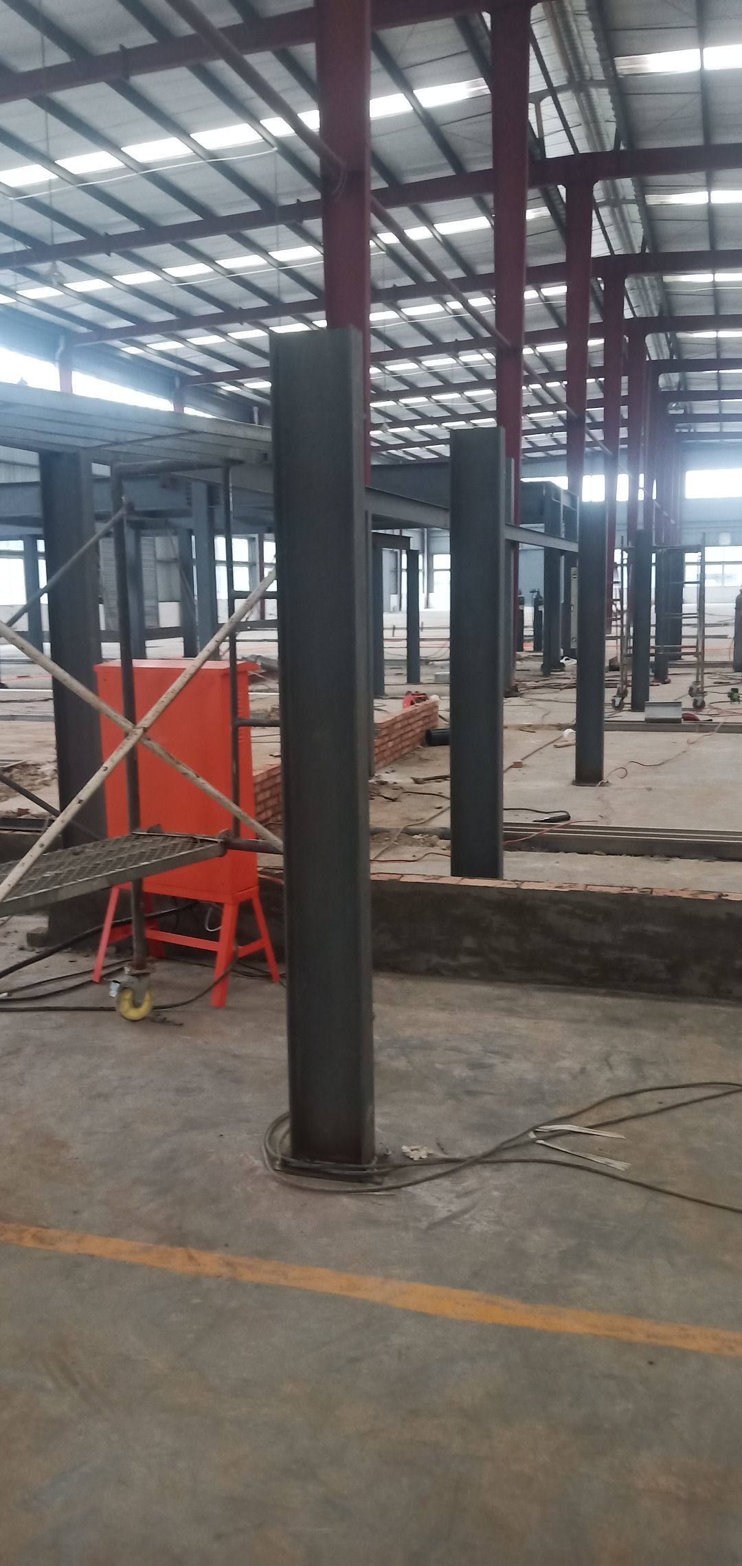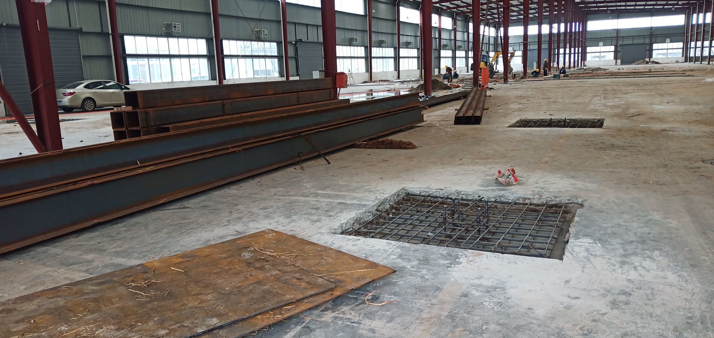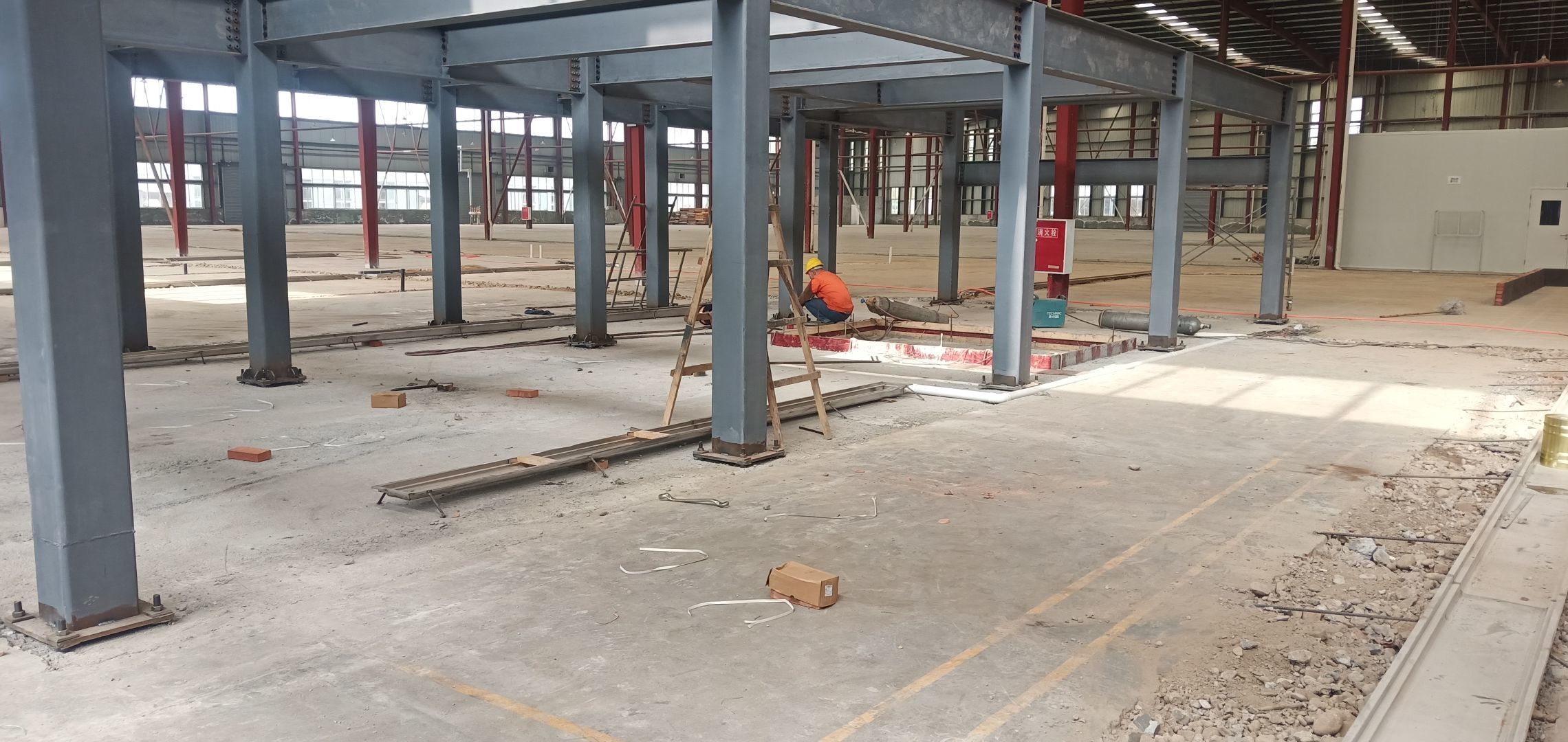 平臺基礎上安裝不銹鋼排水溝,鋼結構柱腳板安裝,鋼梁、鋼柱加工,鋼梁、鋼柱制作完成60%