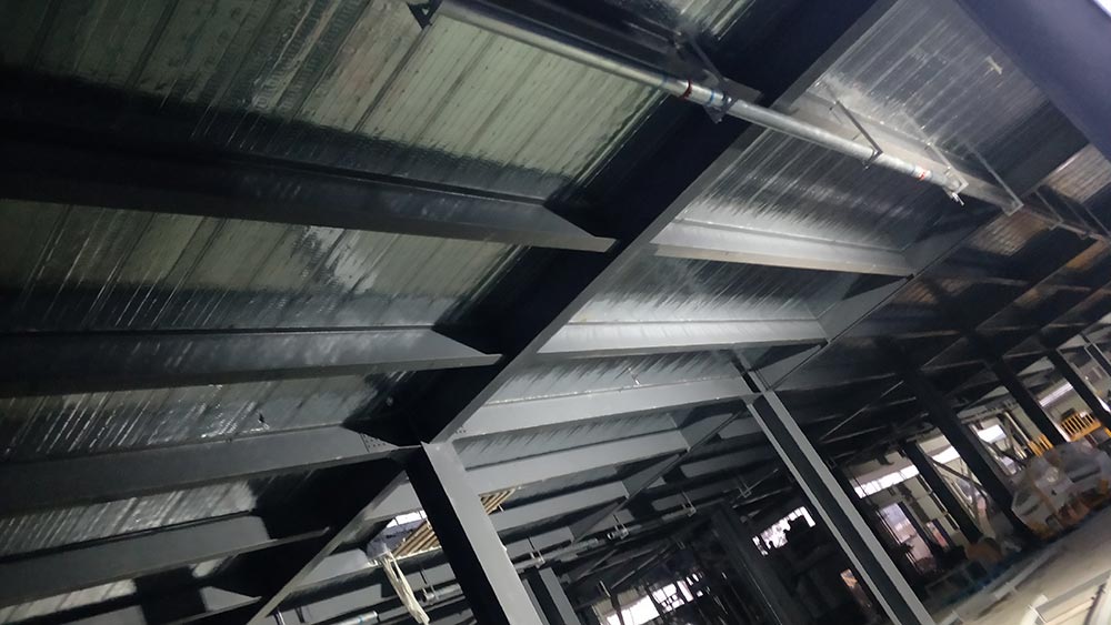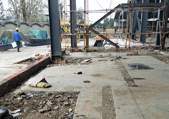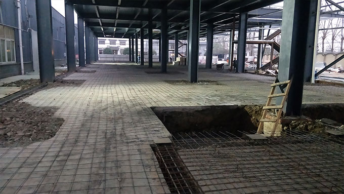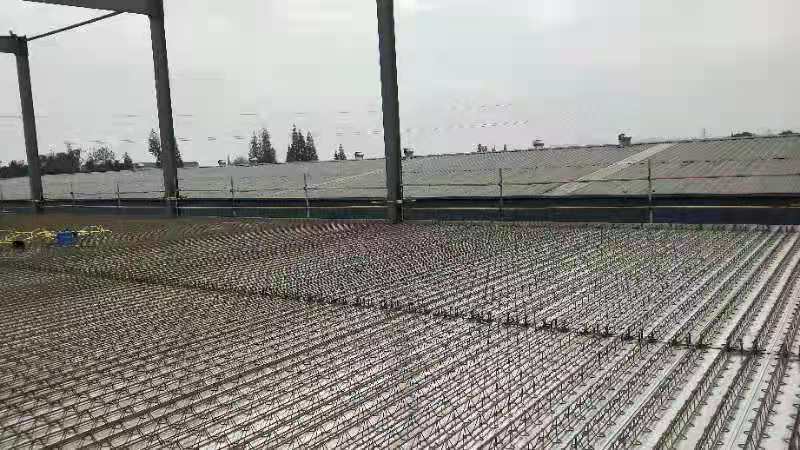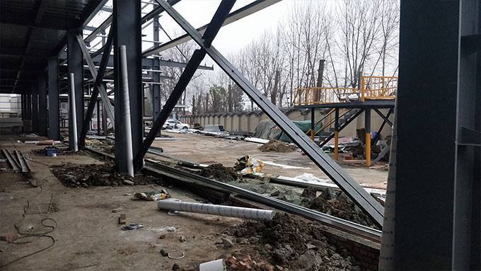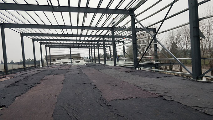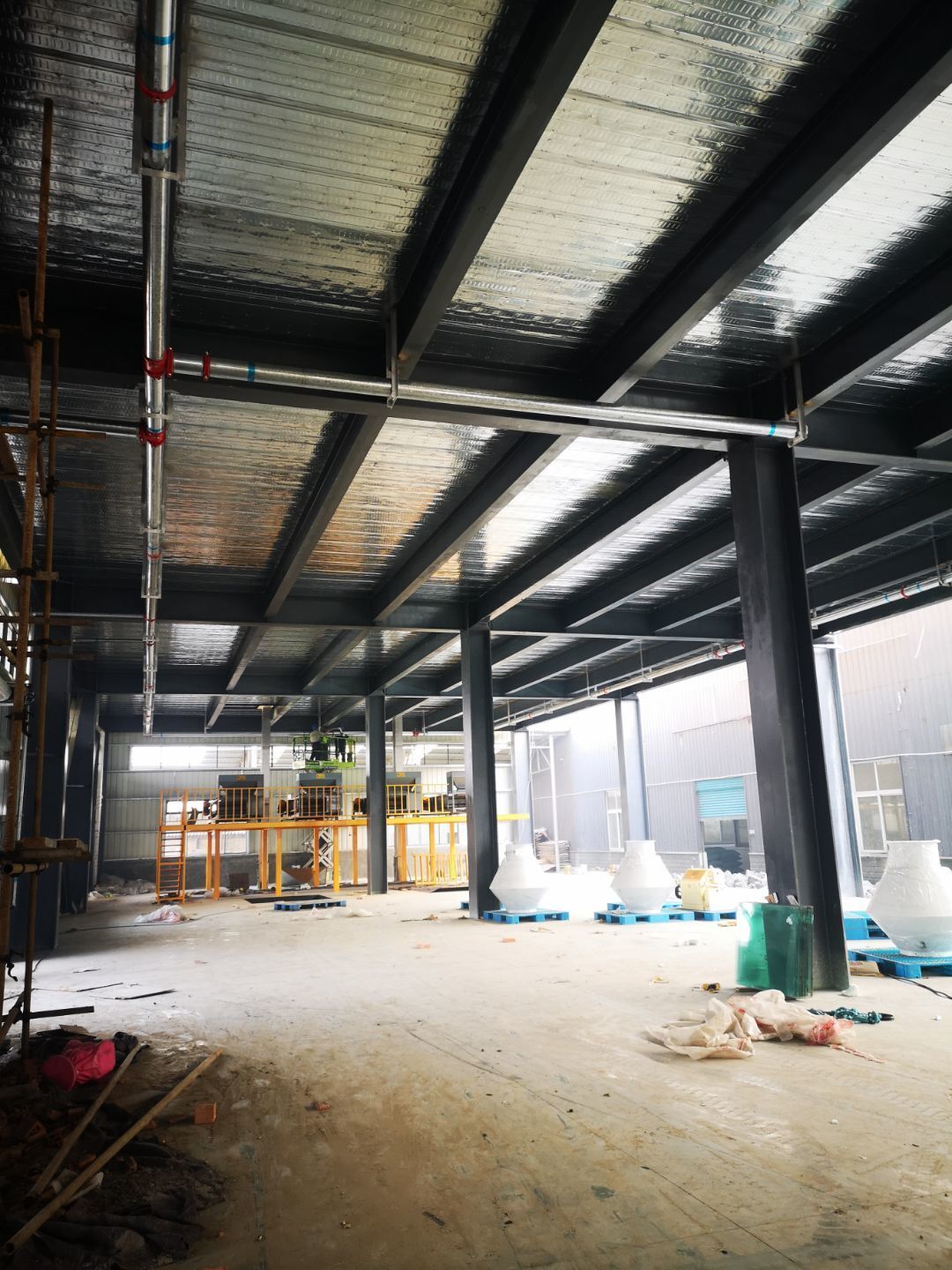 1.設(shè)備基礎(chǔ)完成100%;2.落水管預(yù)埋完成100%;3.屋面夾層完成30%;4.屋面檁條安裝完成100%;5.地坪鋼筋安裝完成100%;6.低洼處鋪石子完成