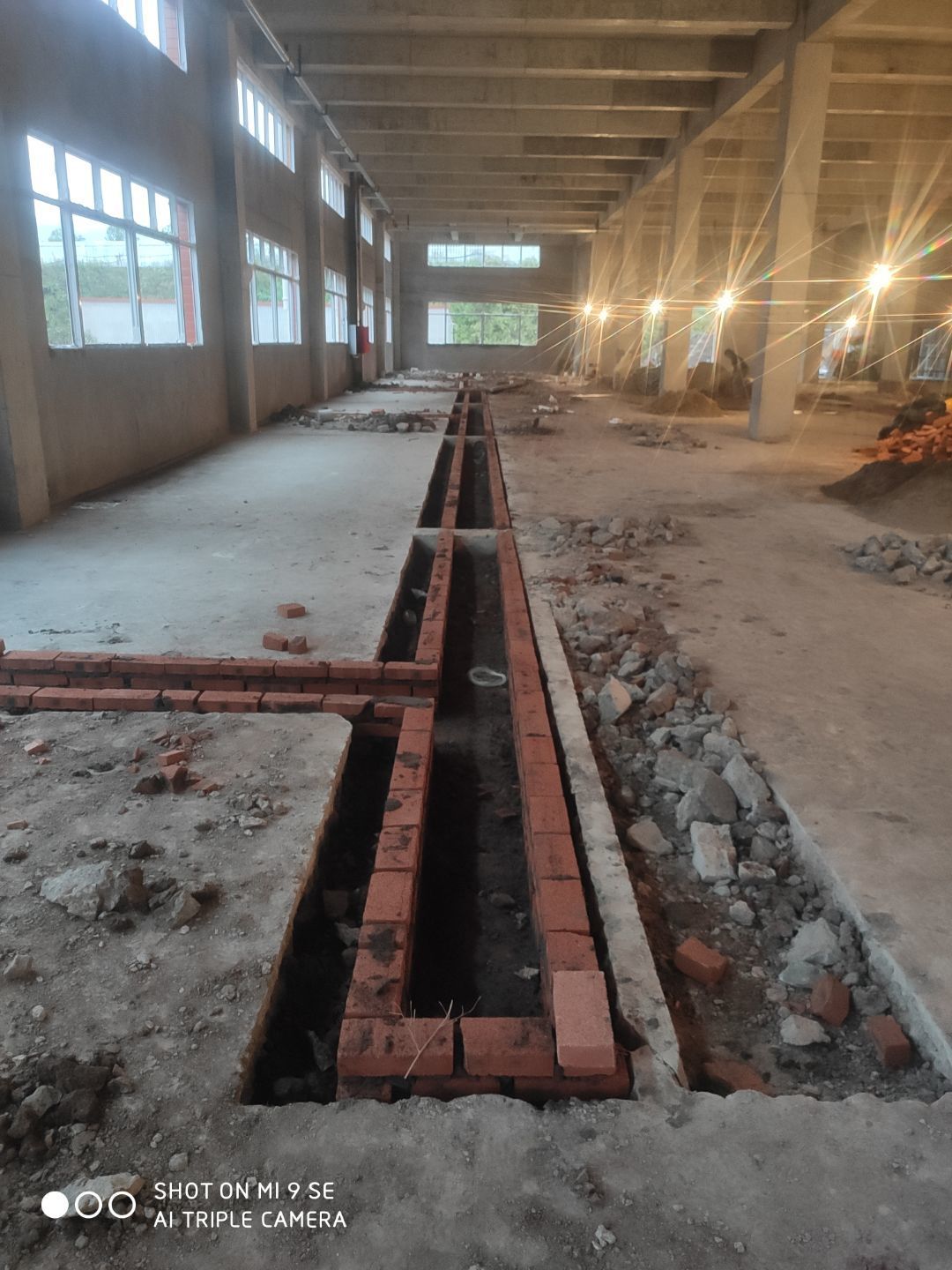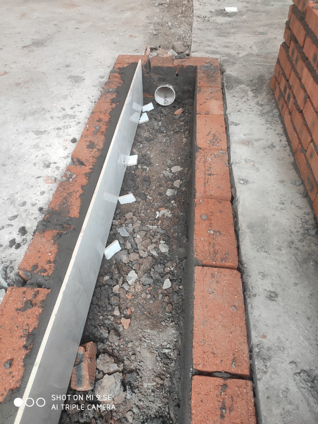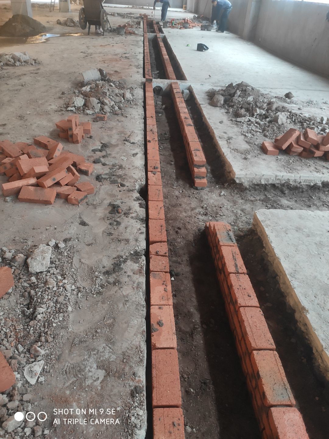 1.水溝砌磚施工完成 2.地面刨毛完成百分之五十