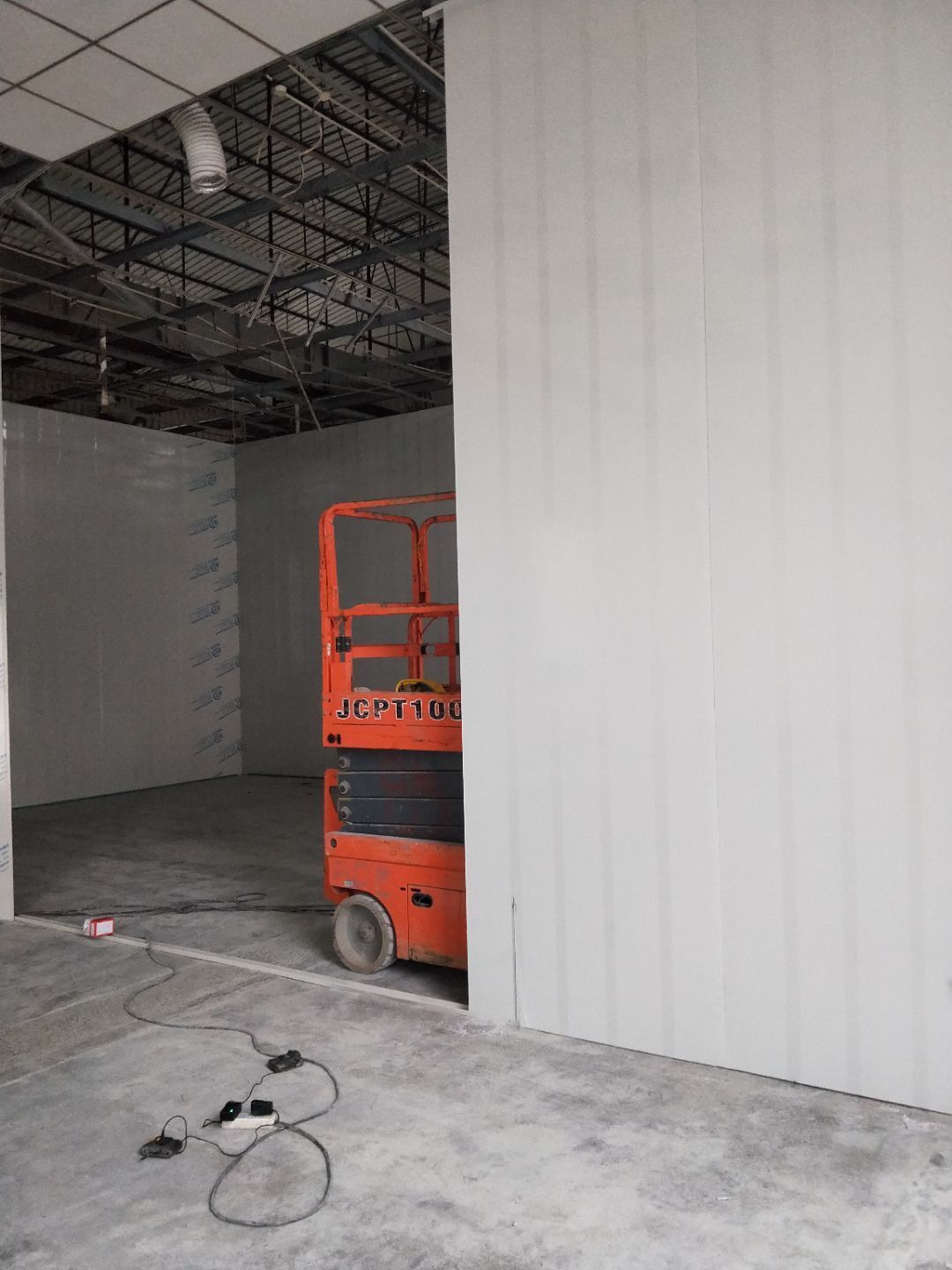 彩鋼立板完成,開始做門,拍圓弧撕膜打膠。 土建邊角處理