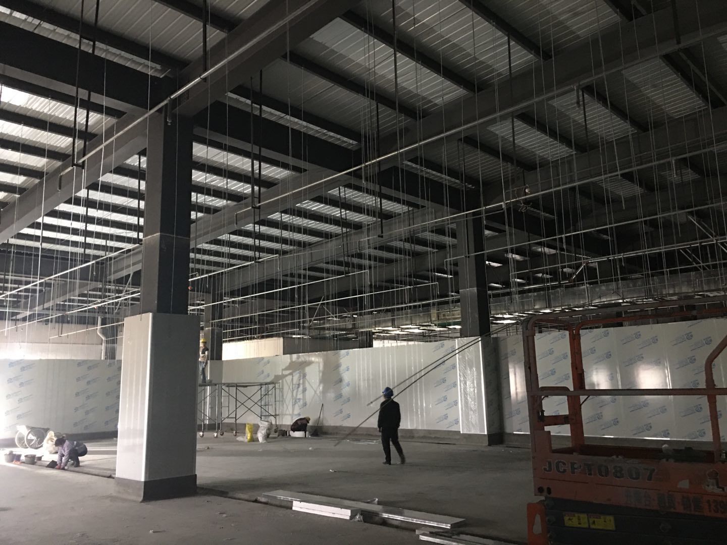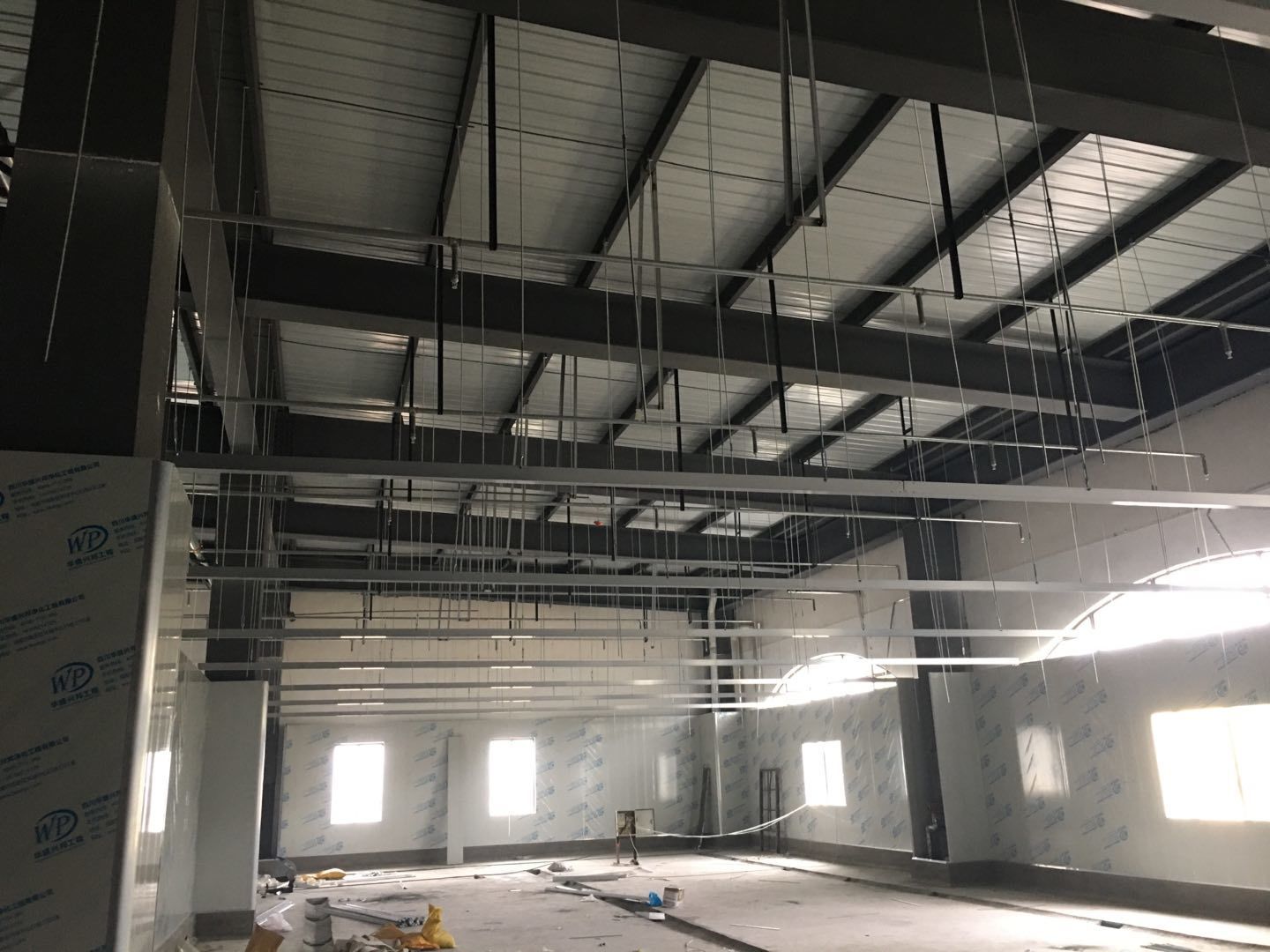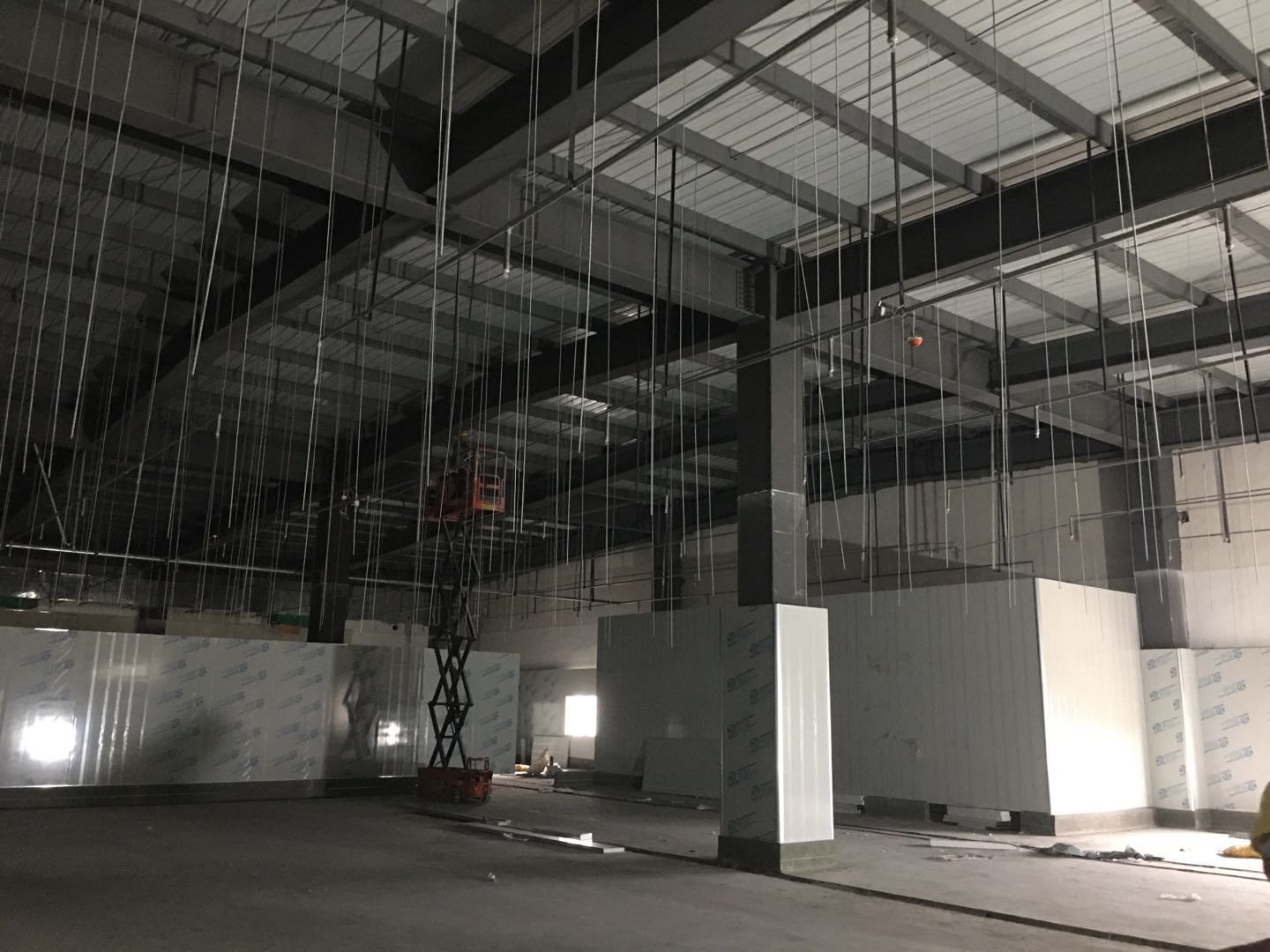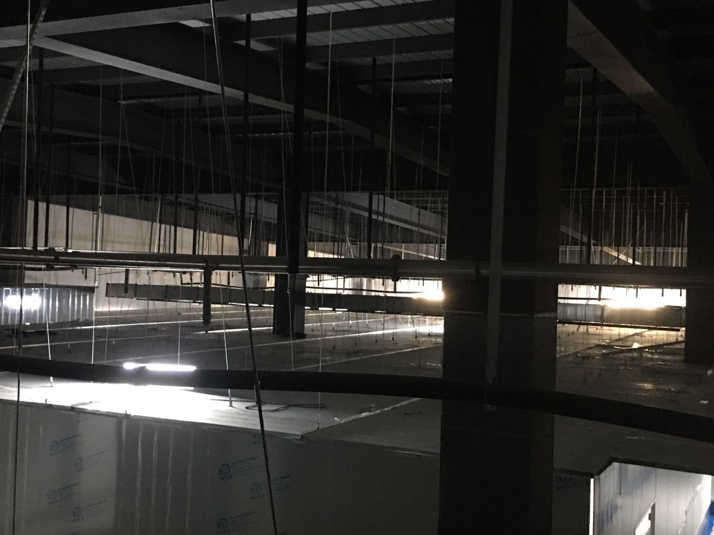 1.簽證彩板內包材庫未封頂,門窗已投合,明日開始全面開預留孔2.空調班組風盤絲桿支架固定,管道布置焊接。3.水電班組-燈具安裝,配線配管。全部燈具安裝完成。