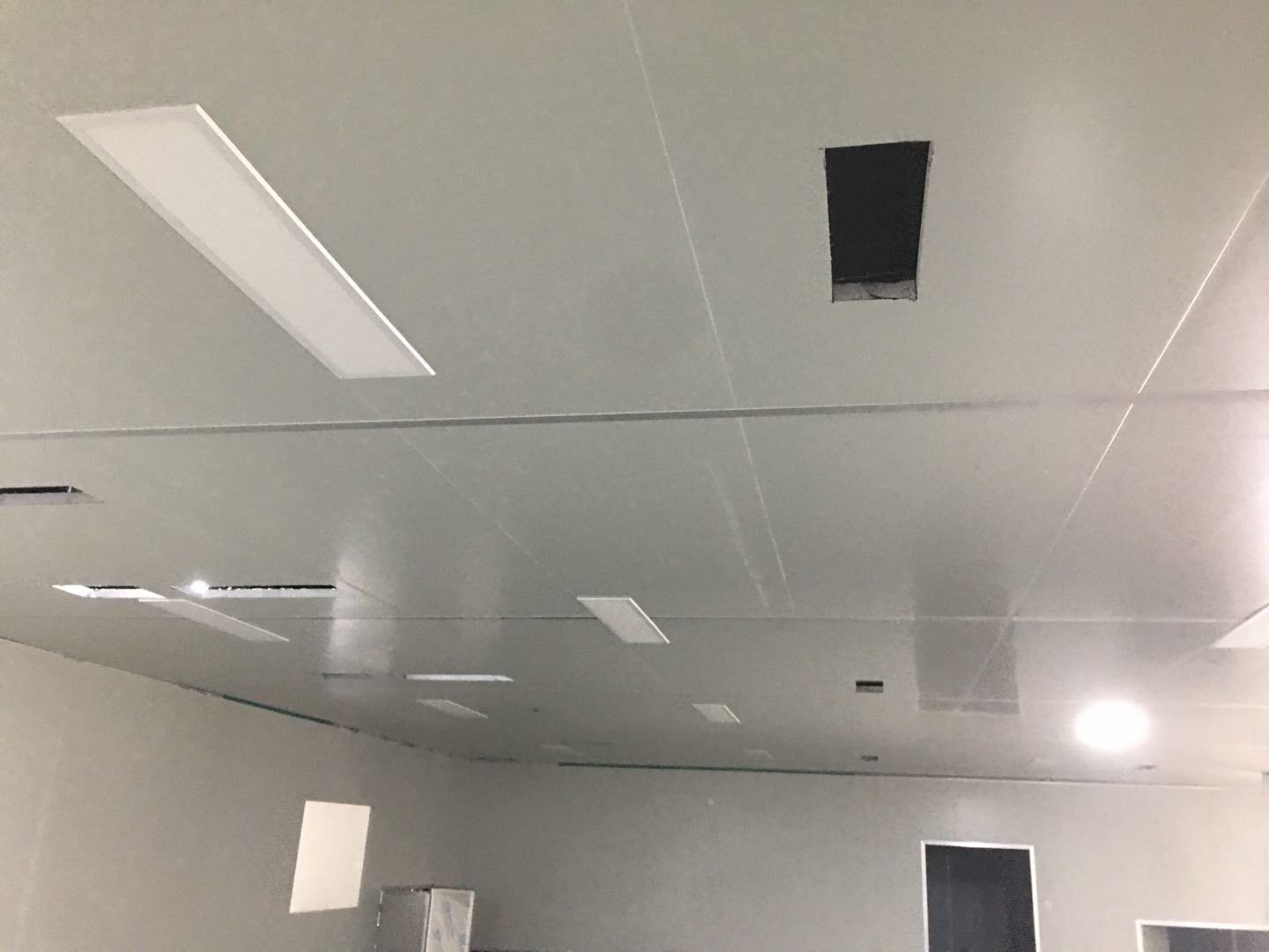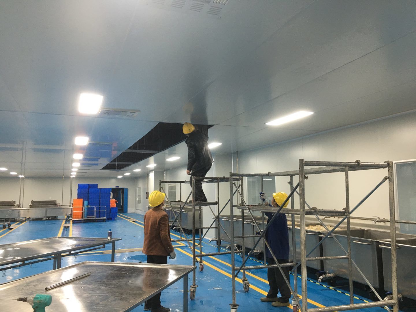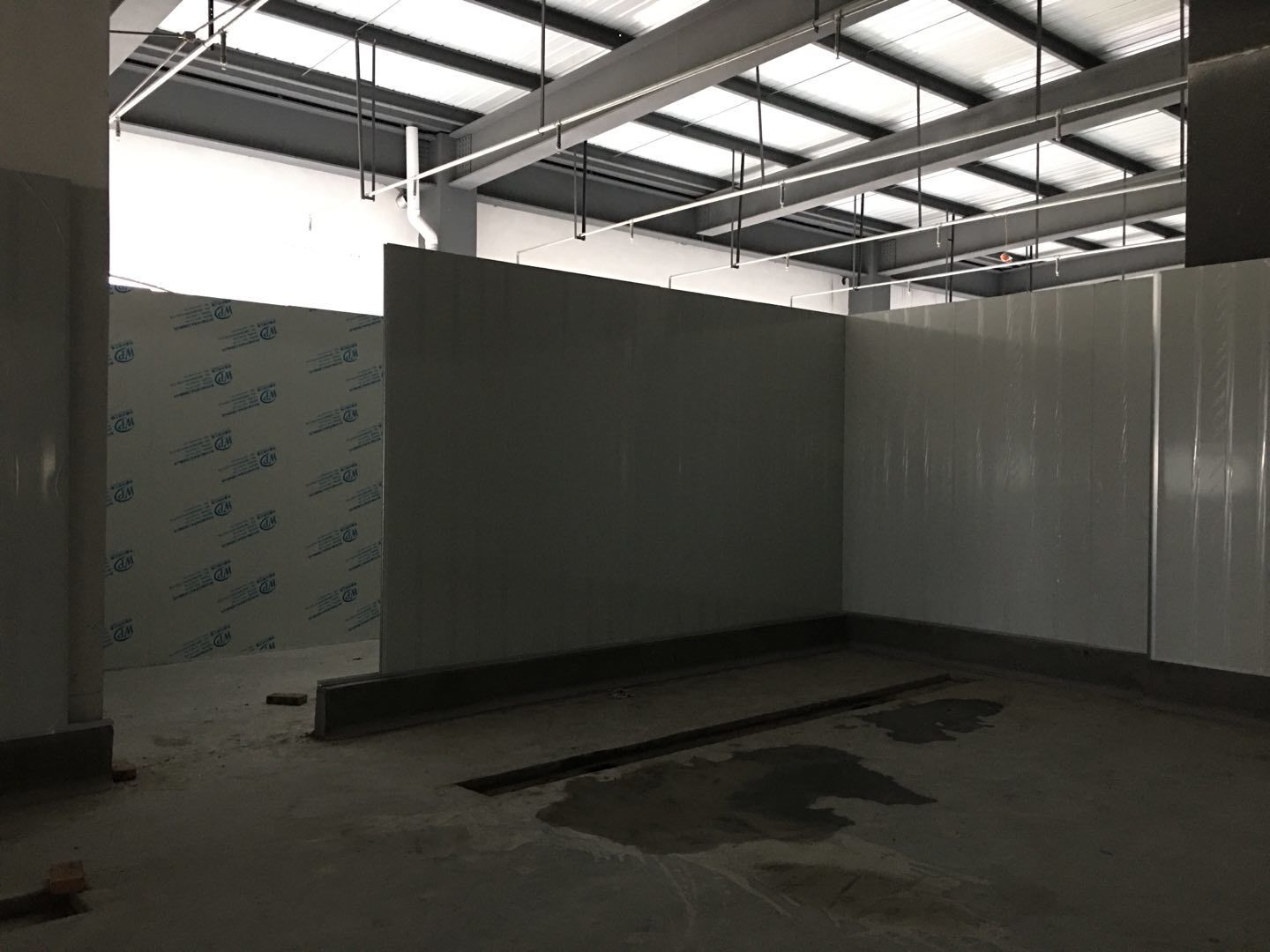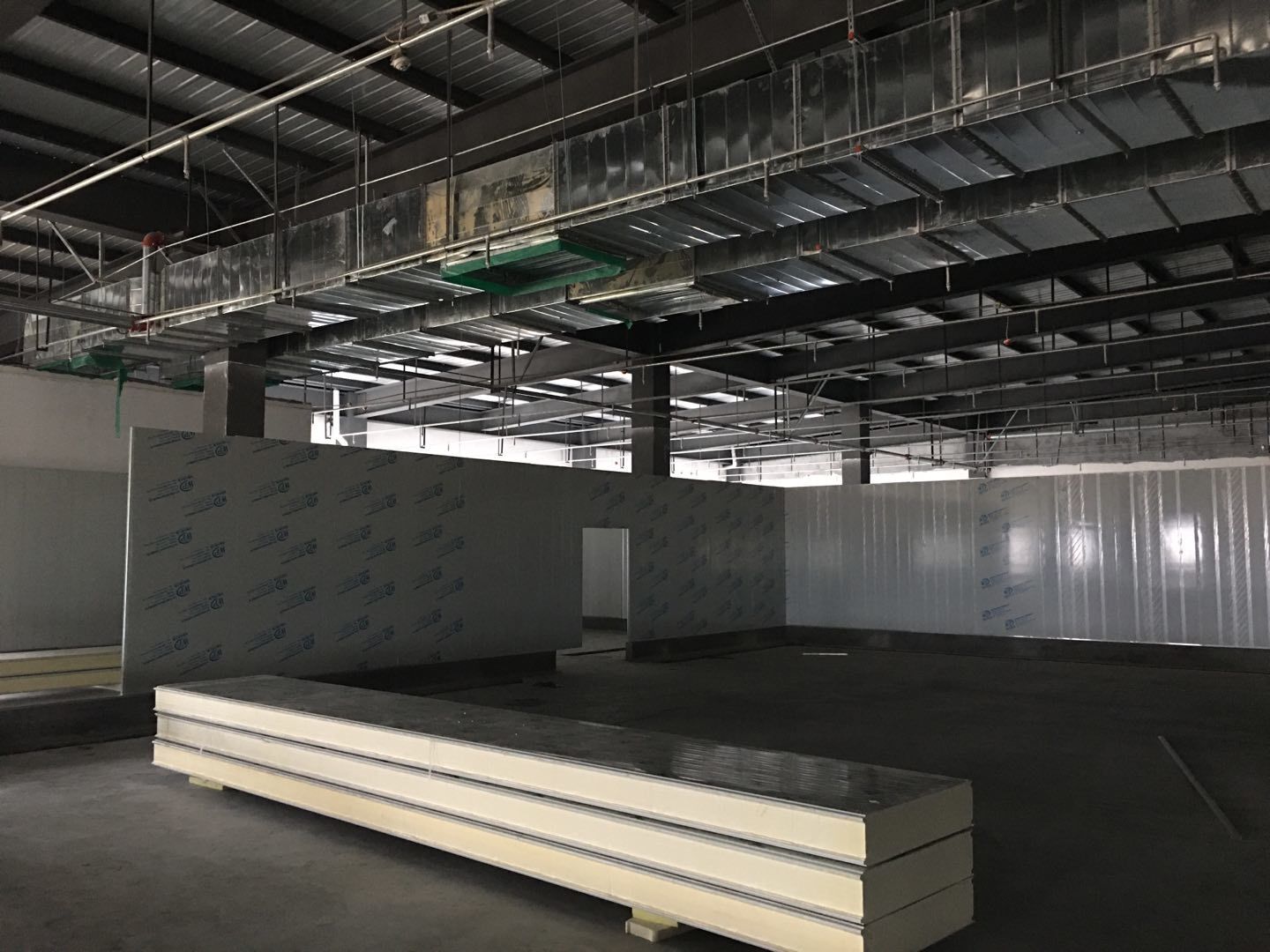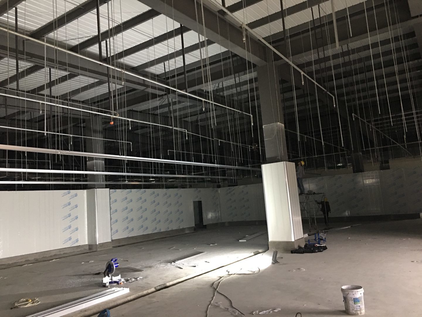 1.簽證彩板內包材庫未封頂,門窗已投合,明日開始全面開預留孔2.空調班組風盤絲桿支架固定,管道布置焊接。3.水電班組-燈具安裝,配線配管。全部燈具安裝完成。