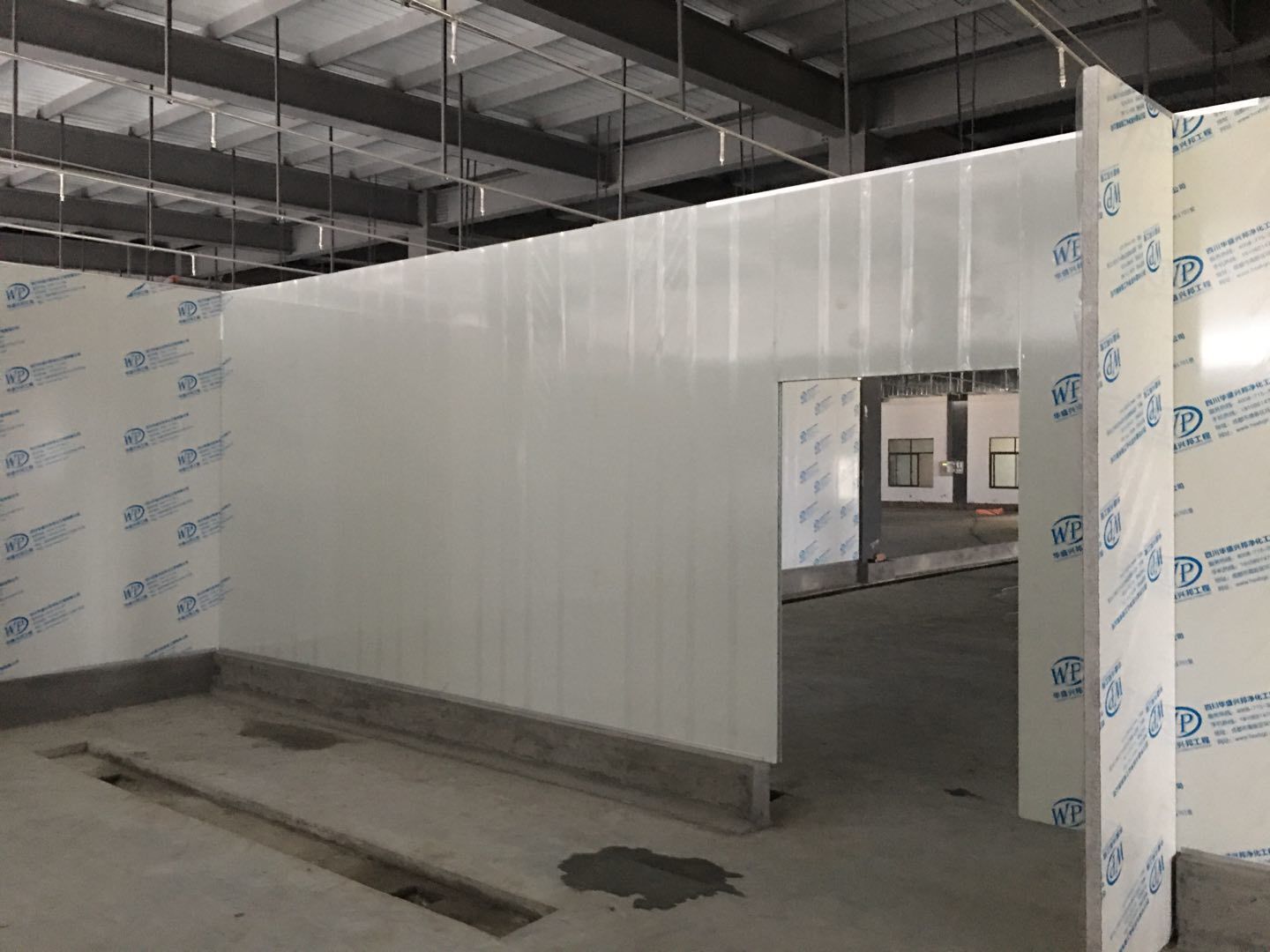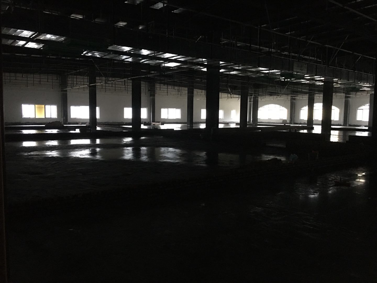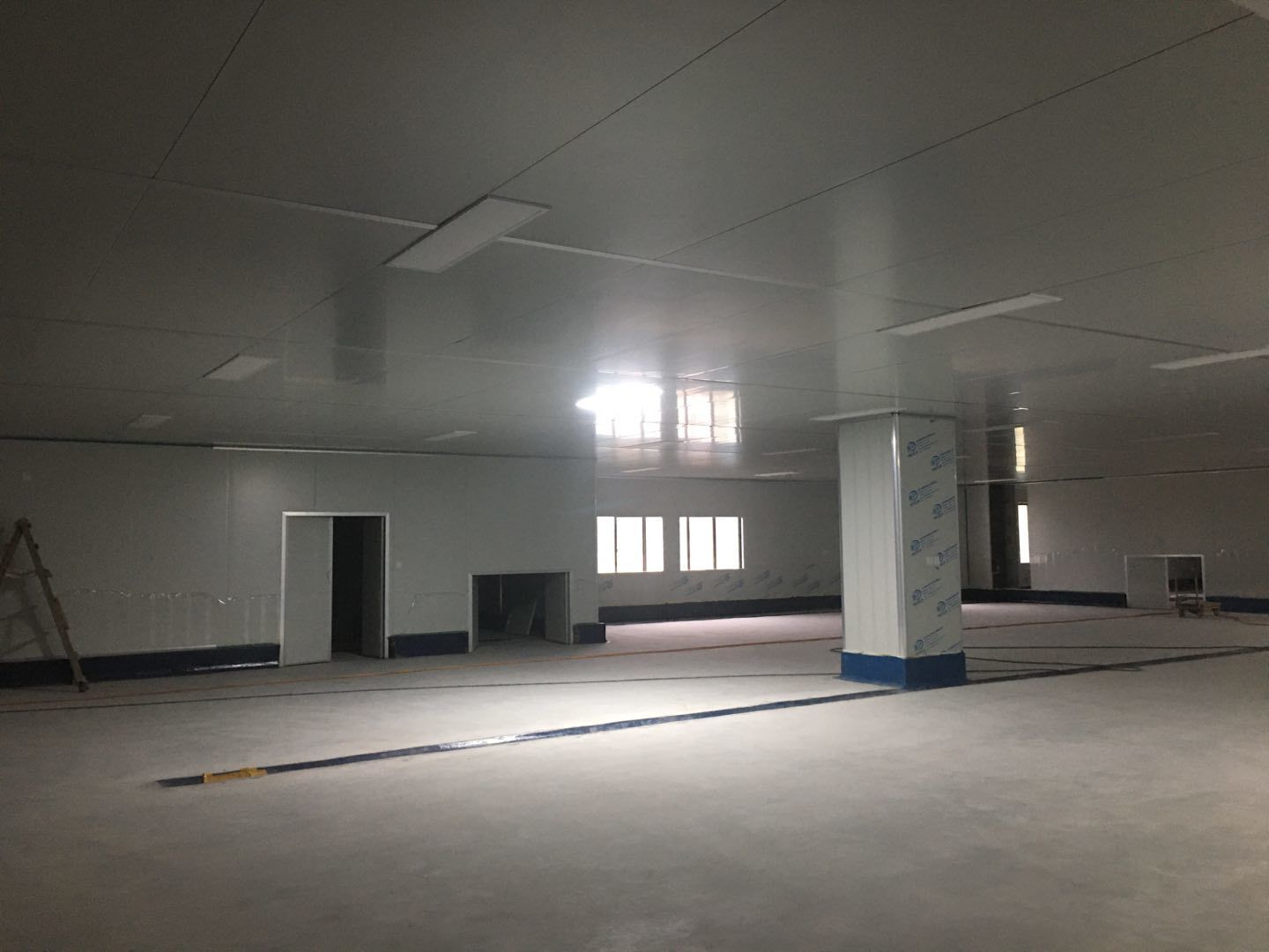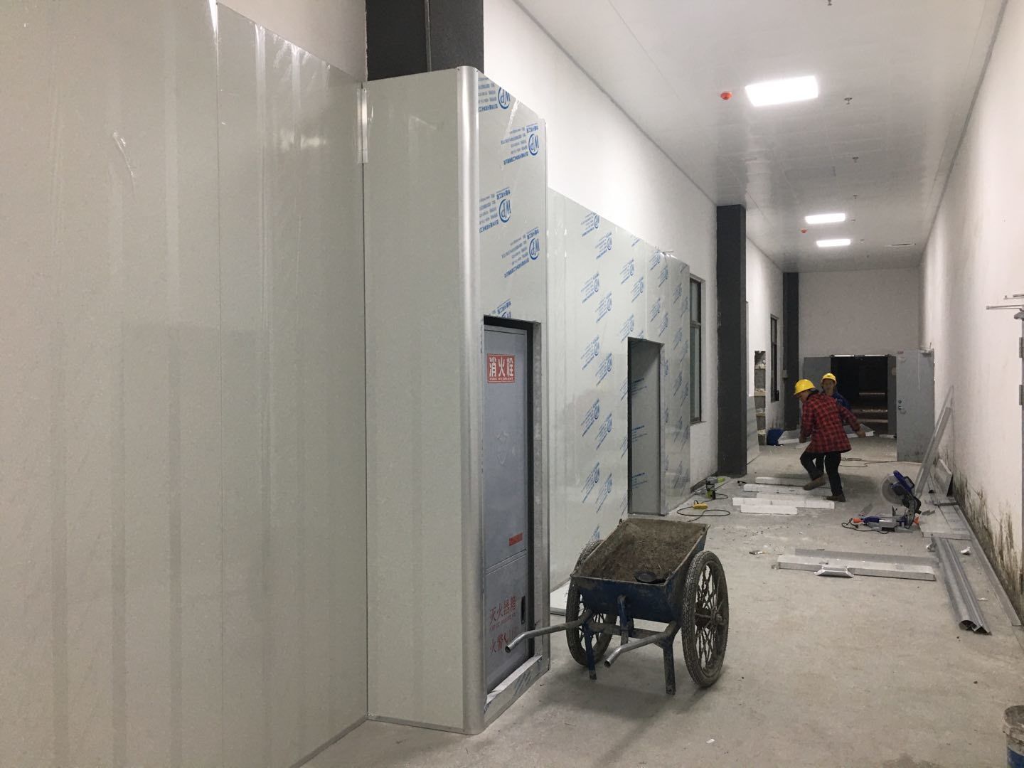 1.簽證彩板內包材庫未封頂,門窗已投合,明日開始全面開預留孔2.空調班組風盤絲桿支架固定,管道布置焊接。3.水電班組-燈具安裝,配線配管。全部燈具安裝完成。