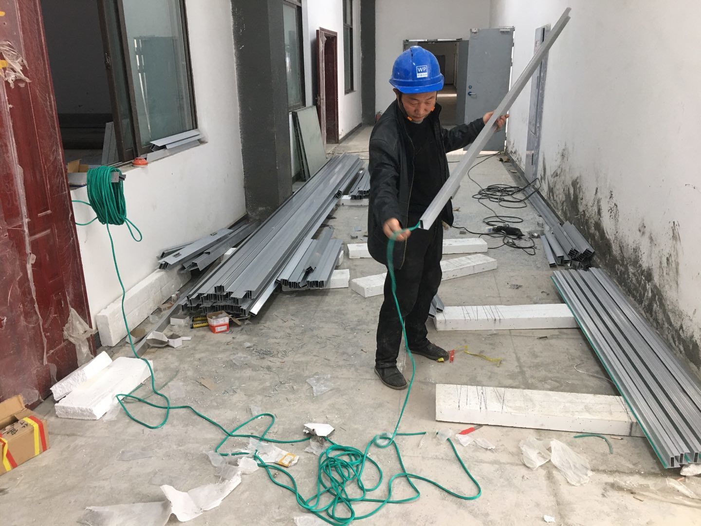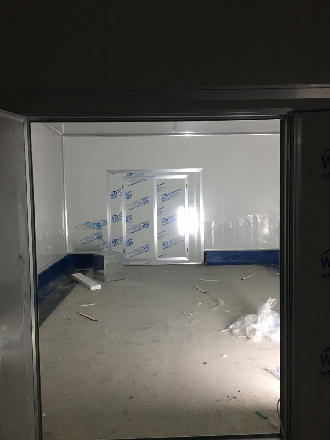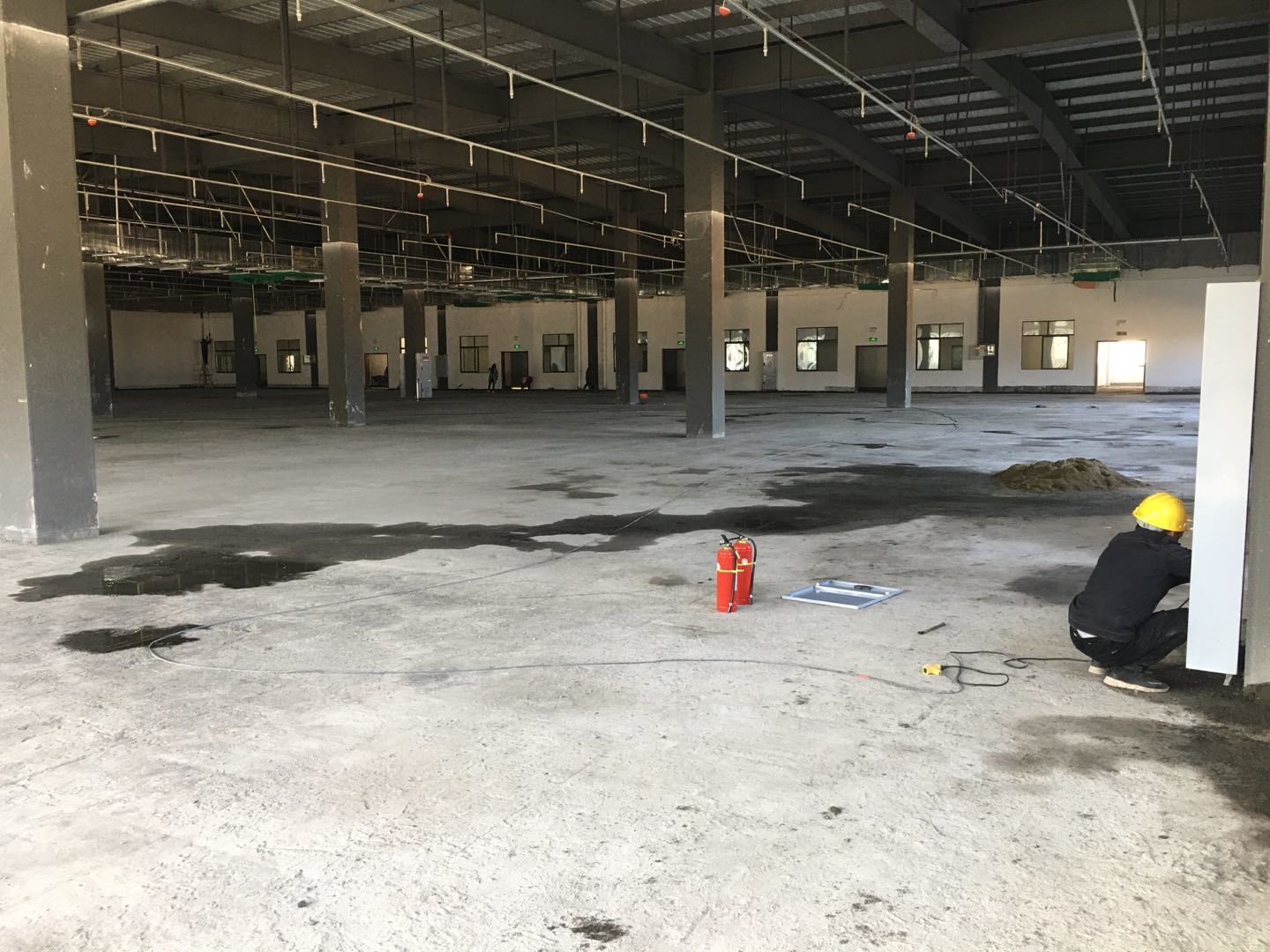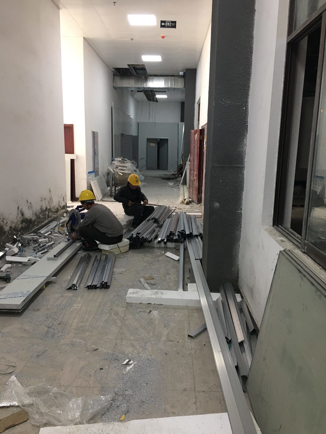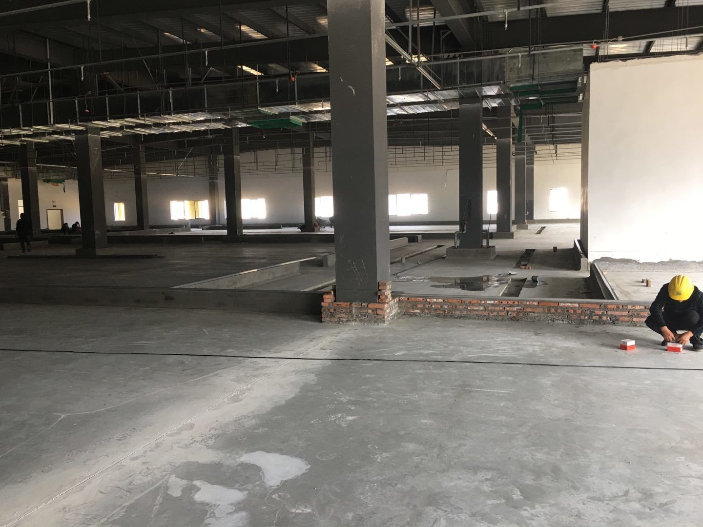 1.簽證彩板內包材庫未封頂,門窗已投合,明日開始全面開預留孔2.空調班組風盤絲桿支架固定,管道布置焊接。3.水電班組-燈具安裝,配線配管。全部燈具安裝完成。
