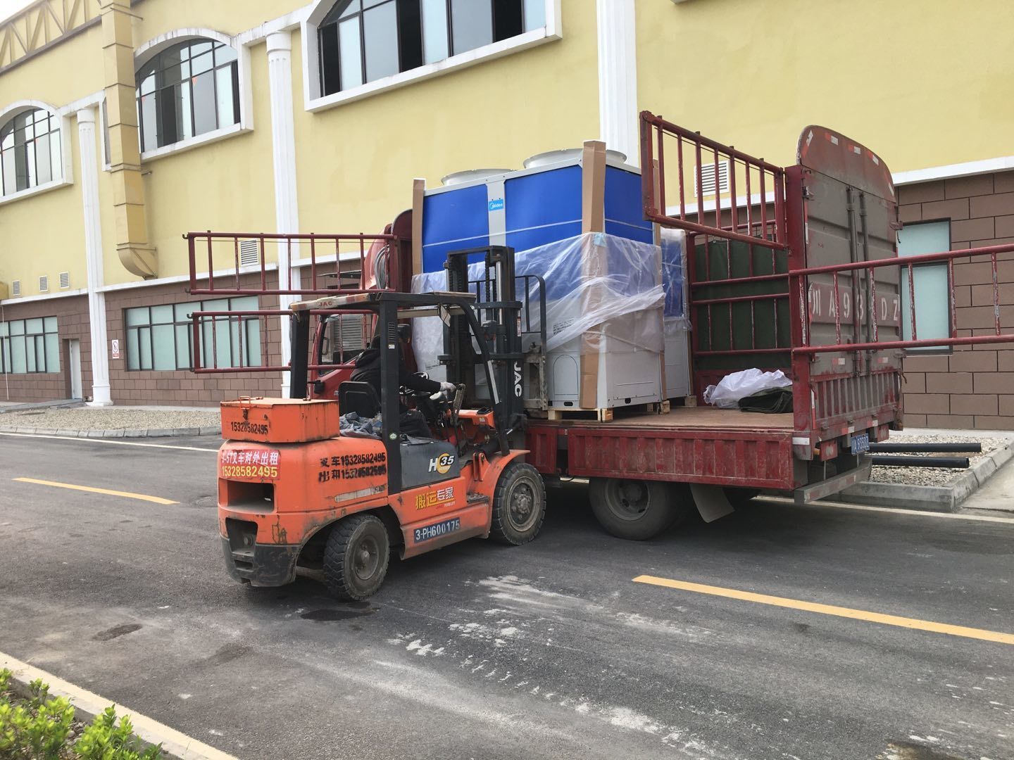 1彩板班組~收尾工作進度30%2:空調班組~管道安裝完成,風機已吊裝2臺,主機配管3:水電班組-布線配管。整體進度約80%