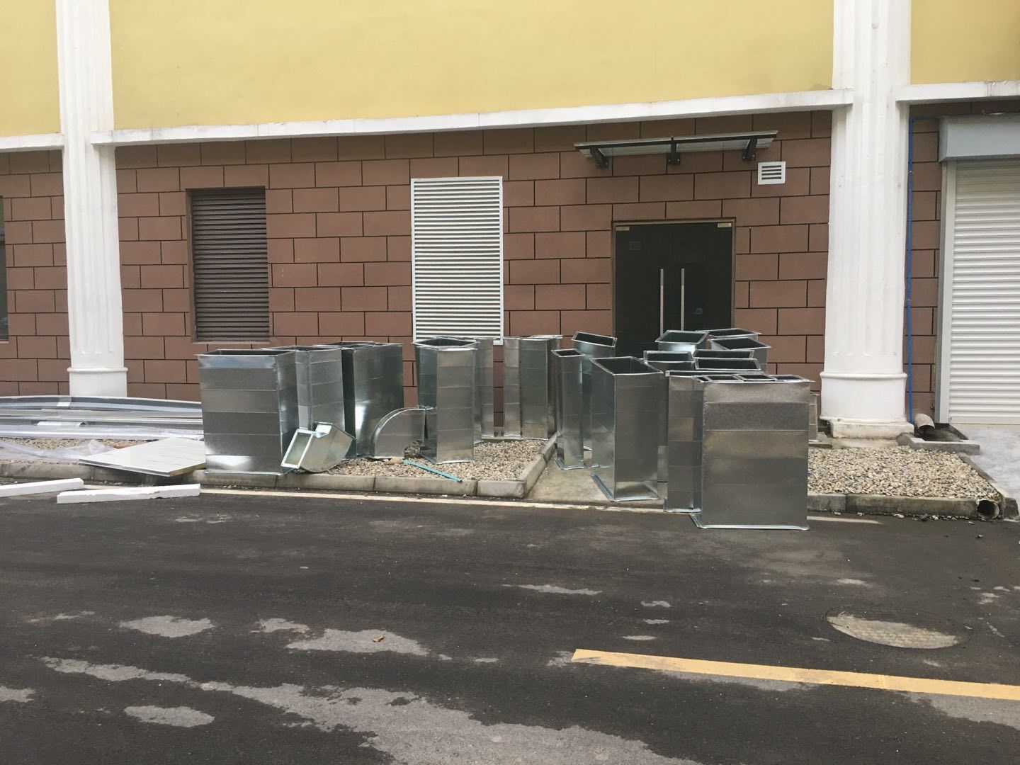 1:彩板班組~收尾工作進度50%左右。2:空調班組~主要設備及風道均已吊裝完成。剩余工作:主機配管,配線調試,安裝風口。3:水電班組-空調電源配線完成約35%,剩余工作:動力電施工,吊頂到給水點位的不銹鋼管施工,配電箱安裝調試。
