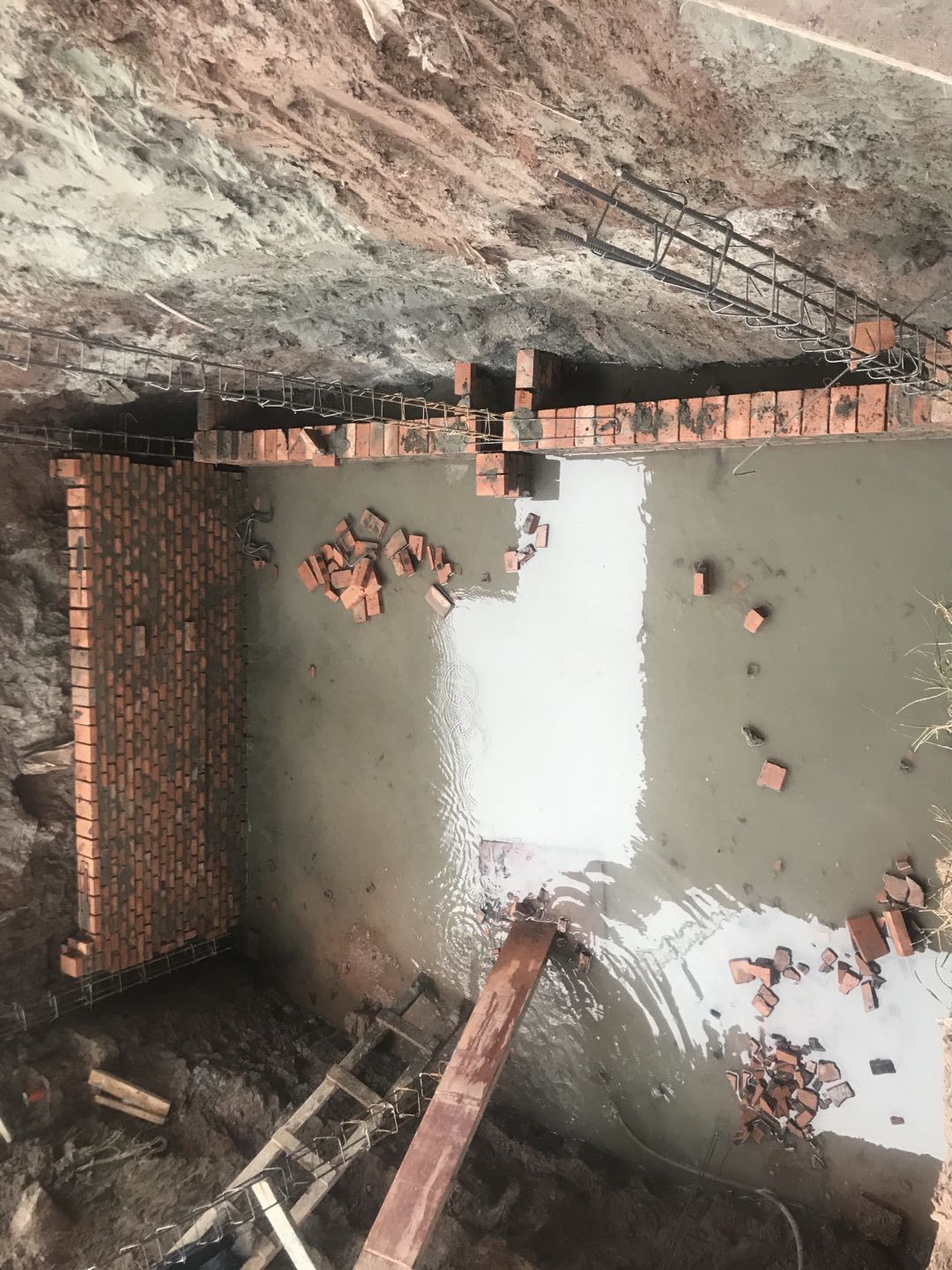 1. 擋水墻防水涂抹。2.水磨石墊層完成。3.凍庫金剛砂地坪完成
