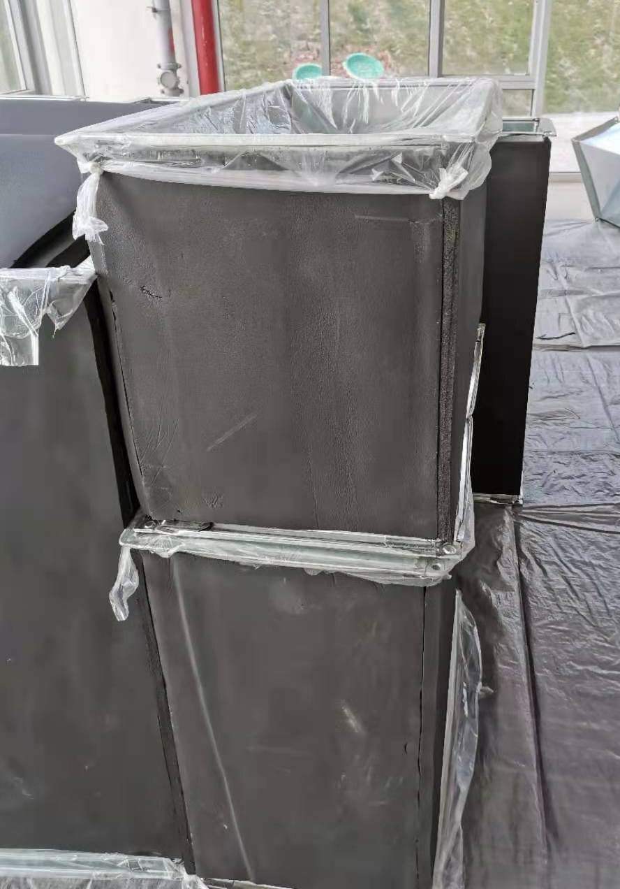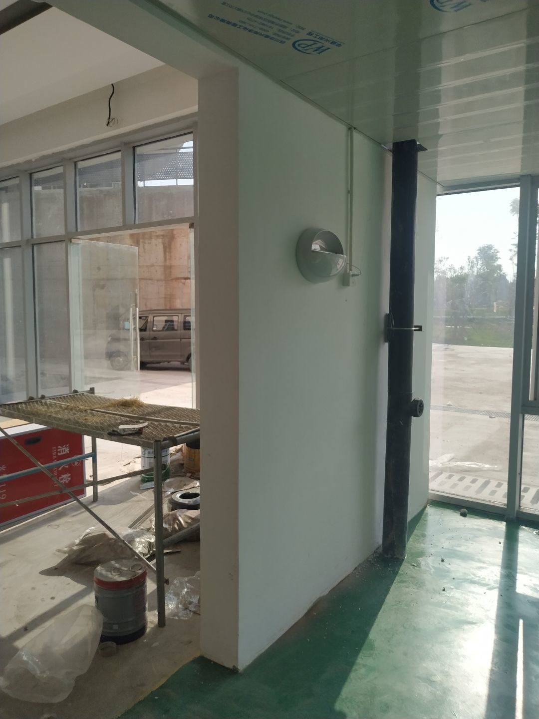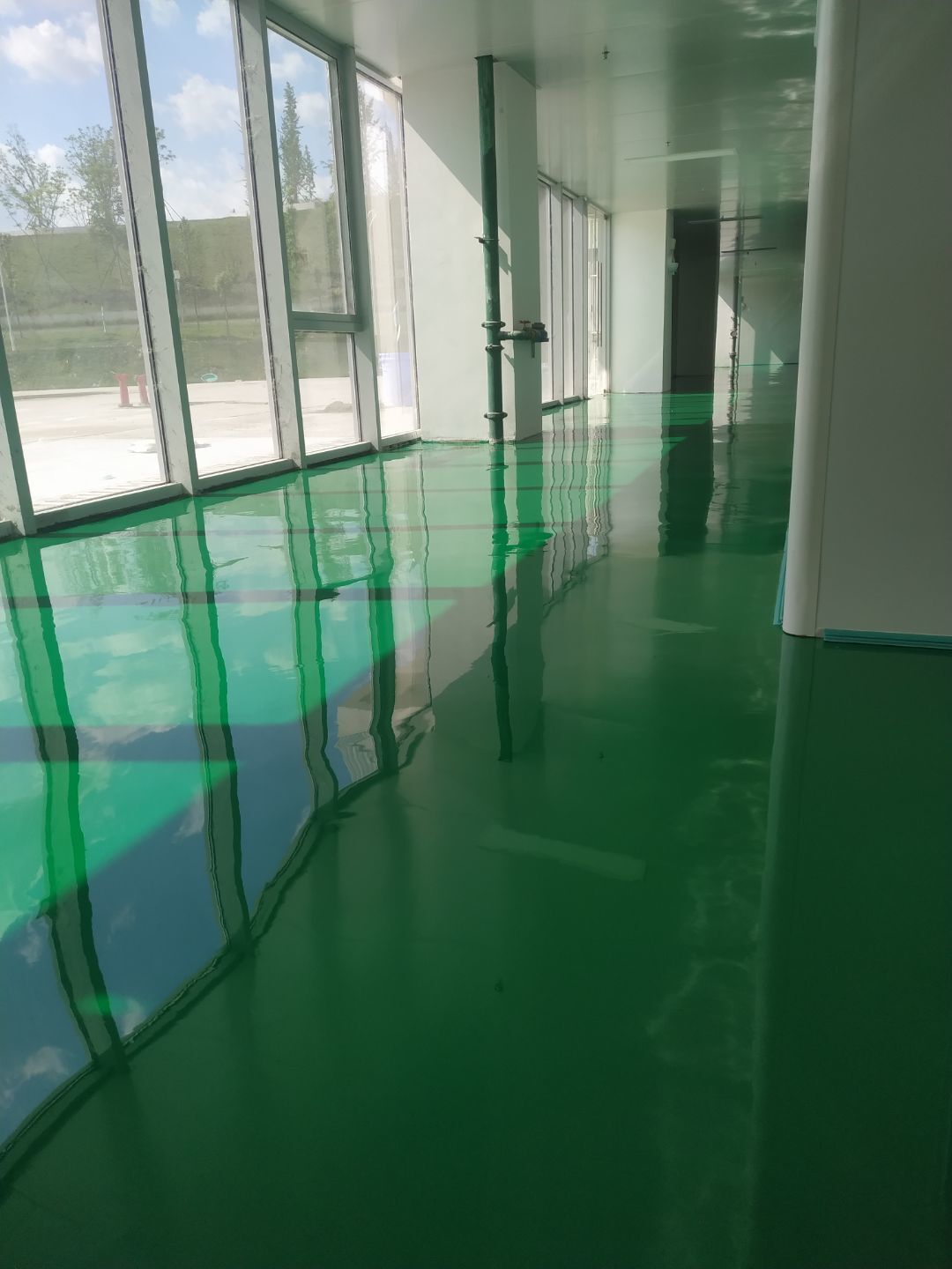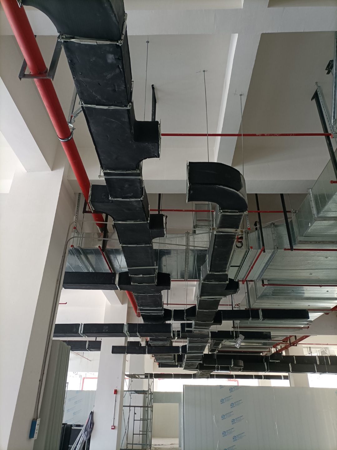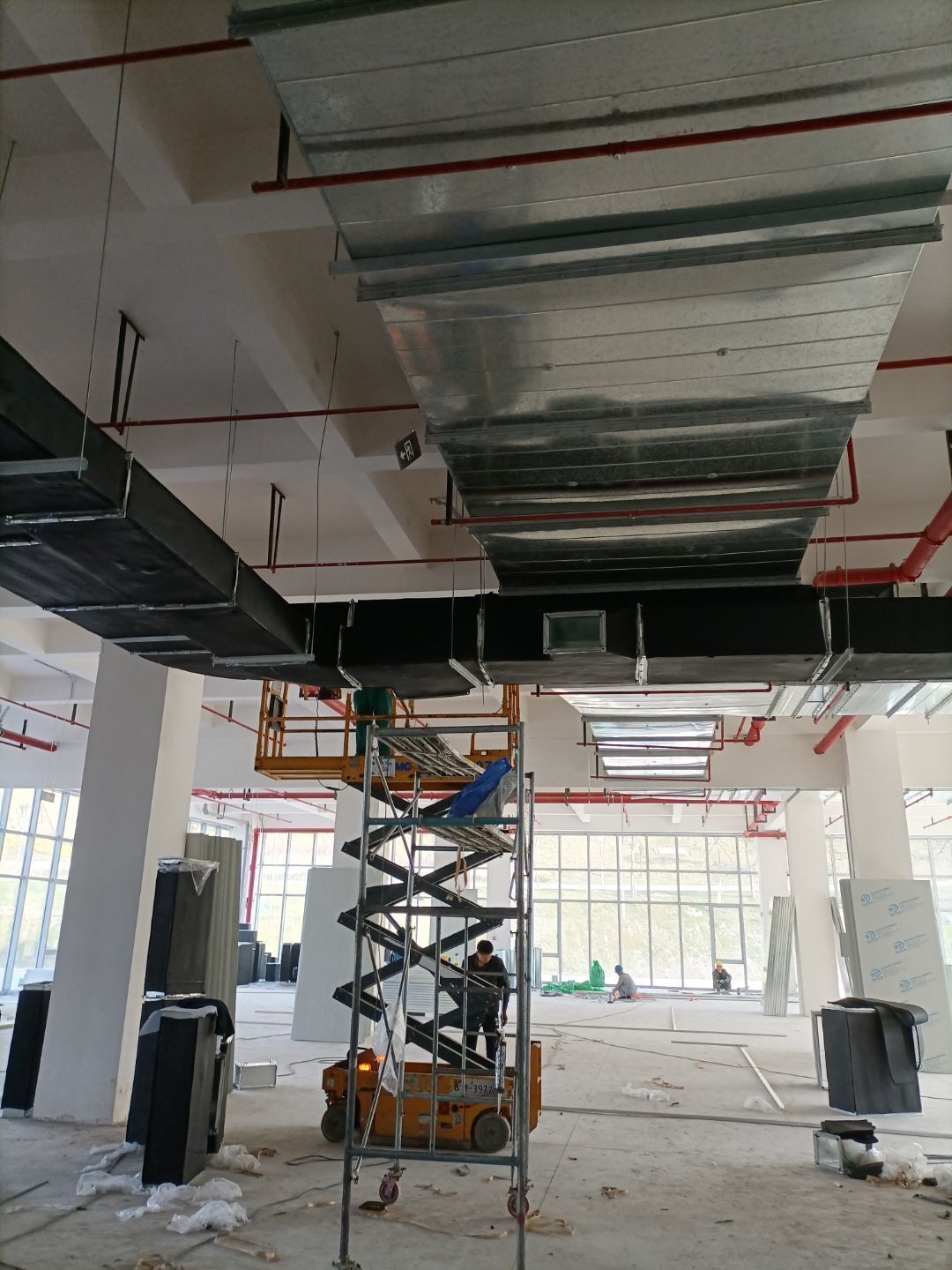 風(fēng)管安裝完成,銅管焊接完成,銅管保溫完成,環(huán)氧自流平地坪施工完成。