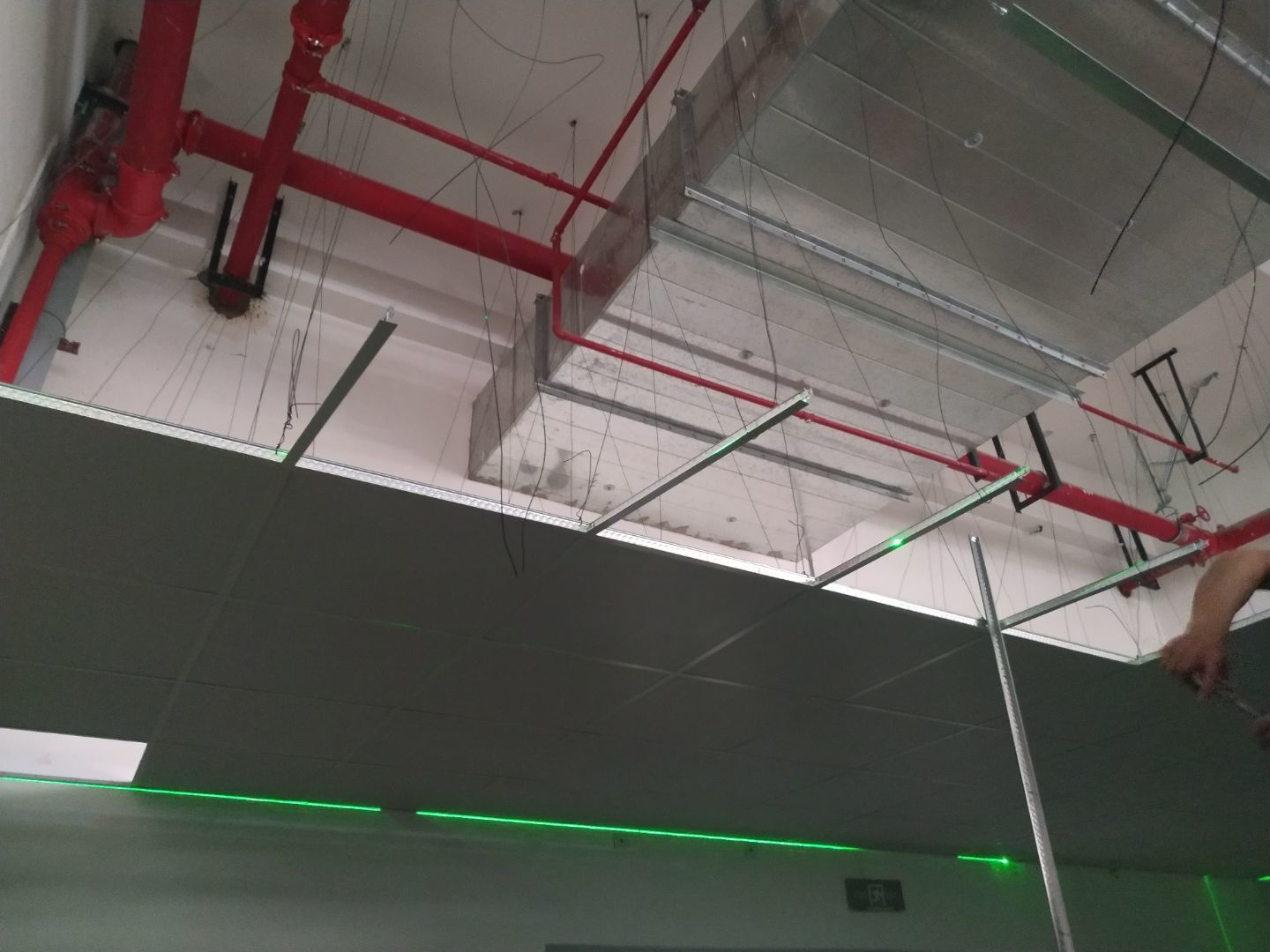 1:撕膜完成60%,打膠完成50%,靜壓箱送風(fēng)口開孔完成,回風(fēng)柱閥門開孔完成;2:開關(guān)插座配管穿線完成90%,滅蠅燈安裝完成,空調(diào)基礎(chǔ)焊接完成。