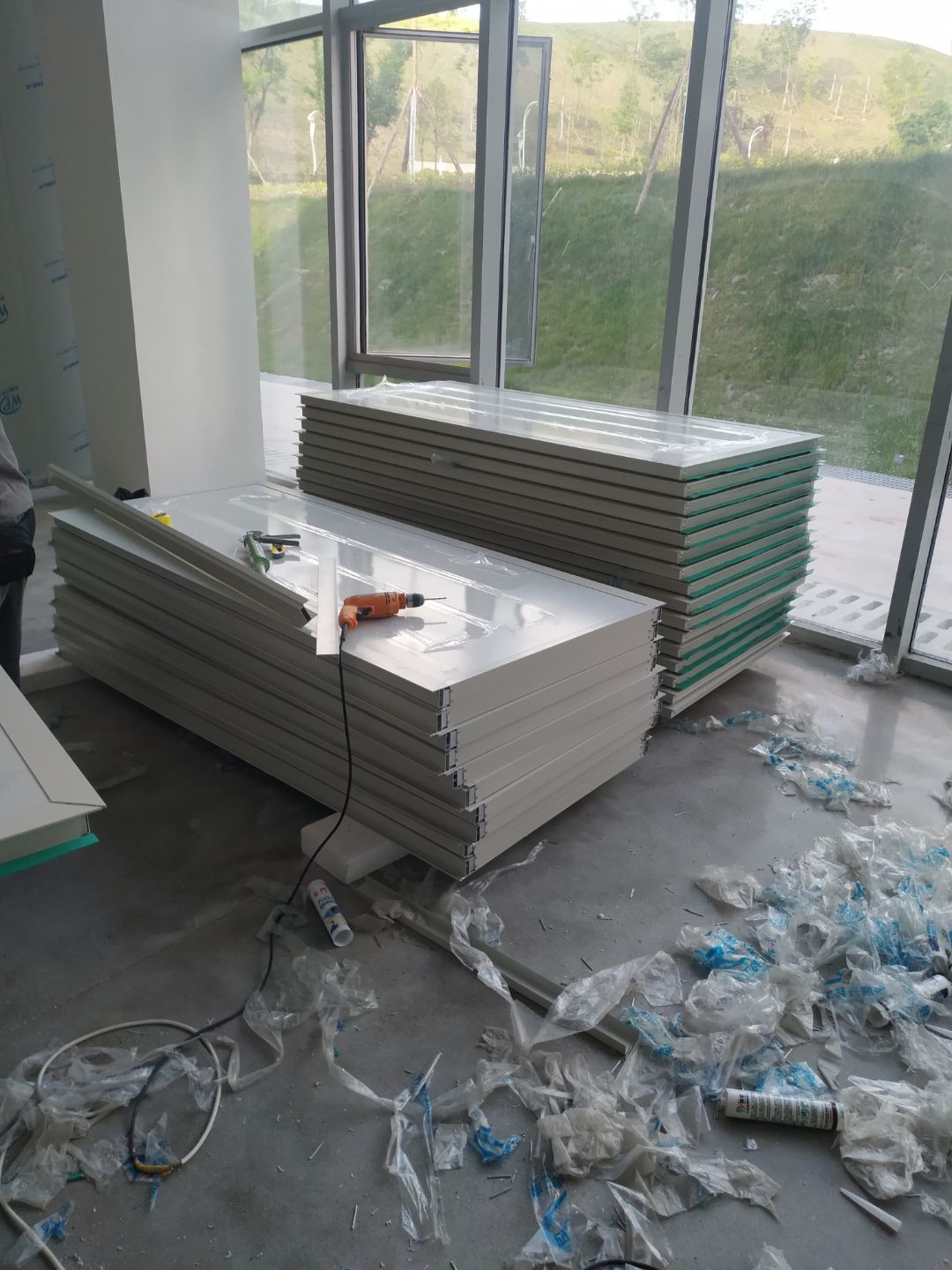 燈具安裝完成60%,窗戶和安全窗開洞完成,窗料預(yù)制完成。