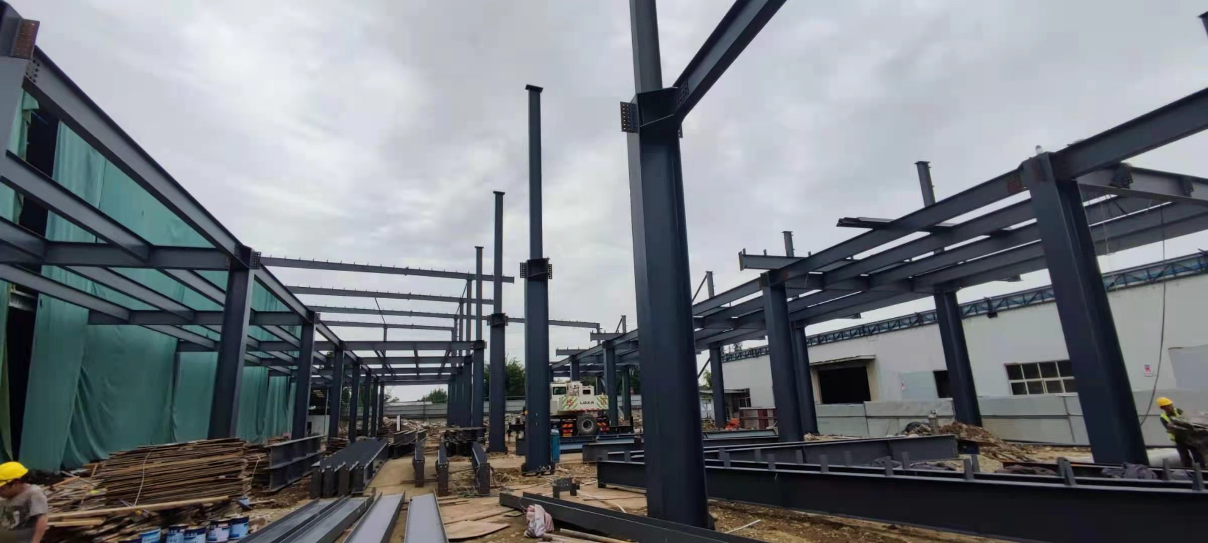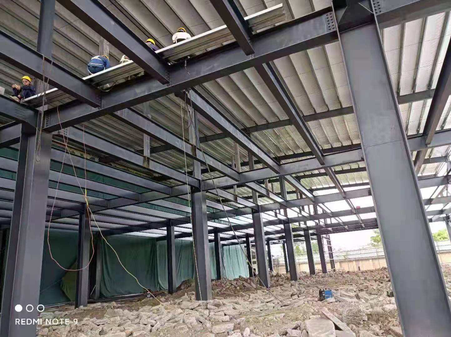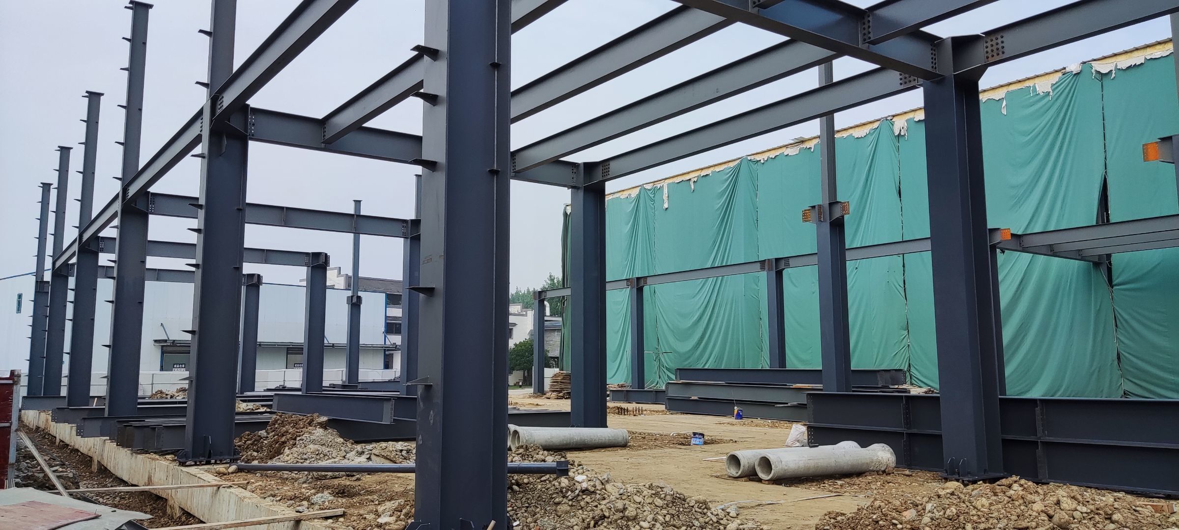 1、鋼結構主體框架完成90%;2、檁條安裝完成10%