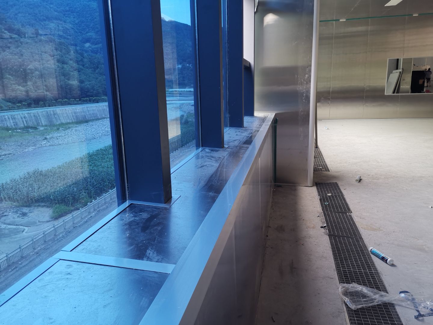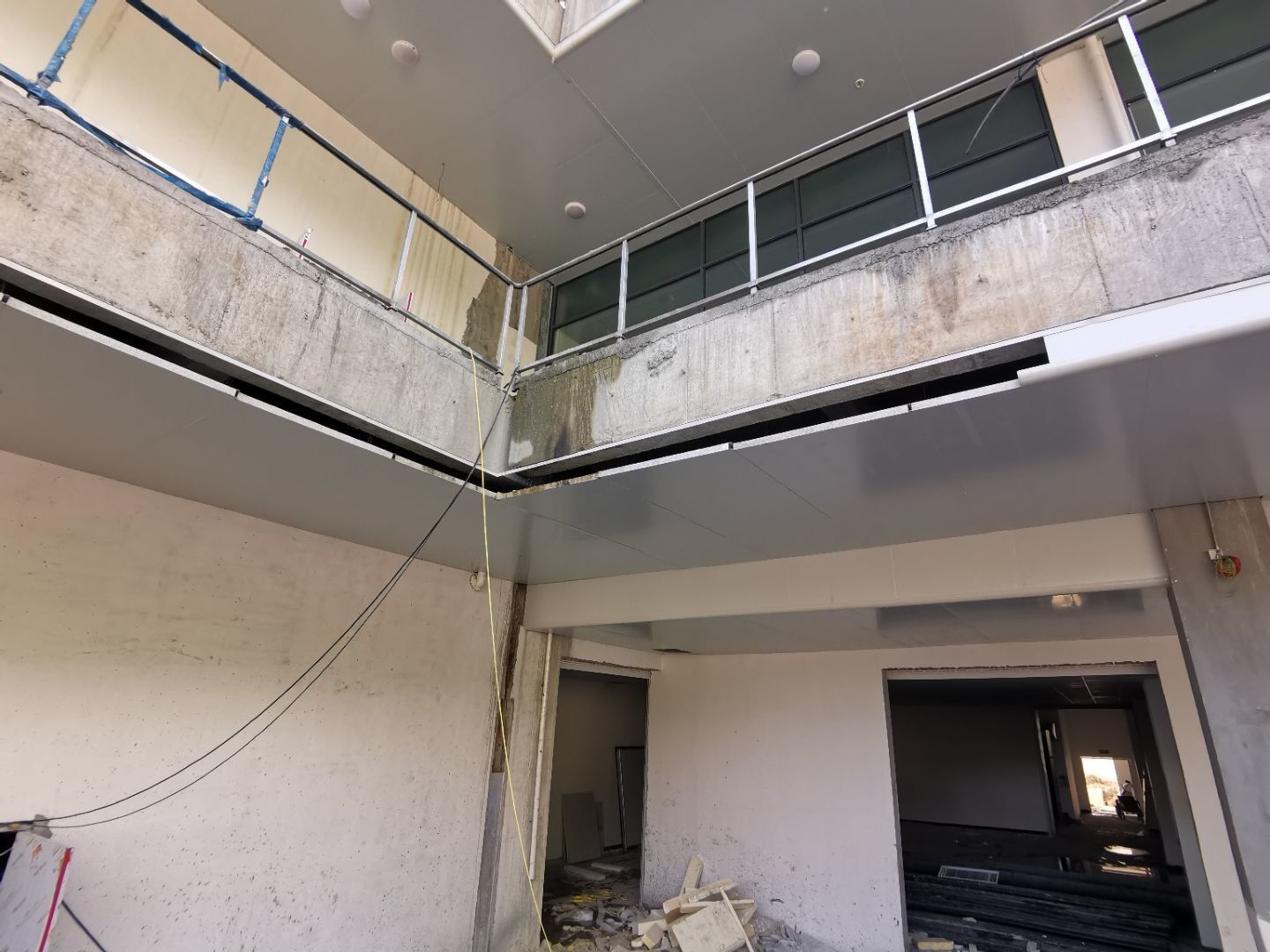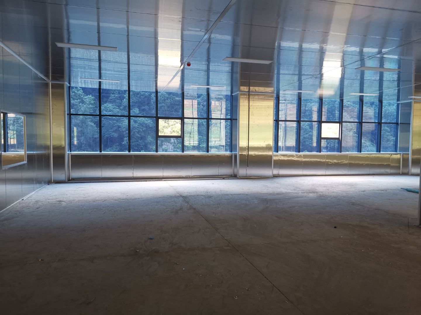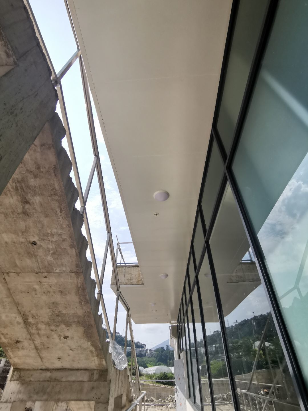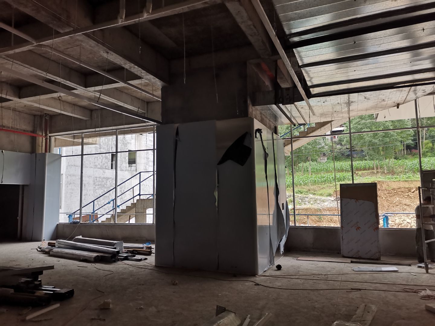 1、四樓線條內圓弧收口安裝完成80%。 2、三樓圓弧安裝完成完成50%。 3、二樓線管、插座、LED燈安裝各完成85%、40%、100%。 4、三樓觀察窗包邊安裝完成50%。