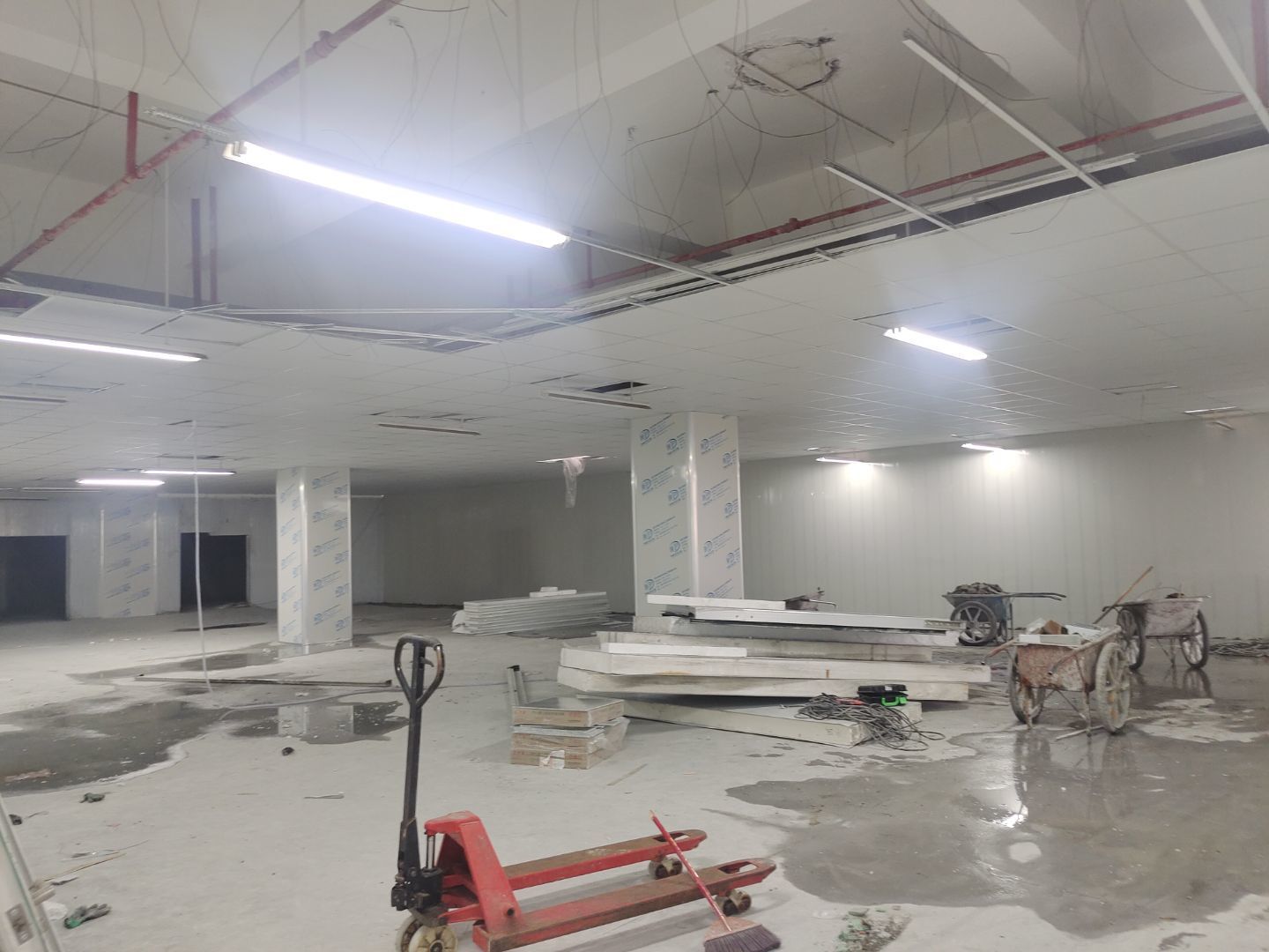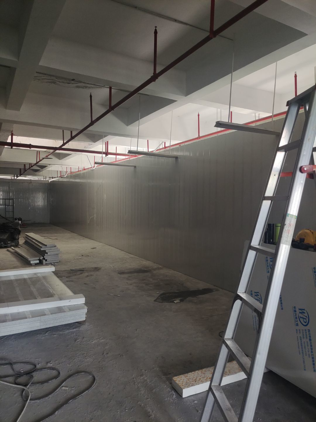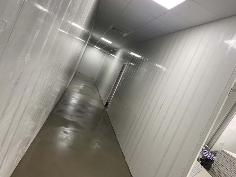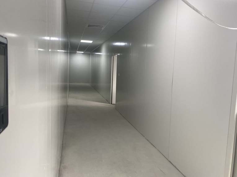 1、辦公司隔墻安裝完成,開門洞及門制作安裝完成 2、外包間墻面板安裝完成90%,剩余部分甲方要求設(shè)備搬運(yùn)后安裝
