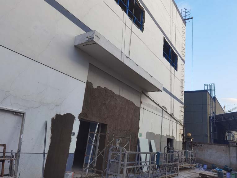 今日施工內容: 1,彩板頂板安裝 2,室外門衛處拆模 3,室外關模開始 4,室外外墻噴漆