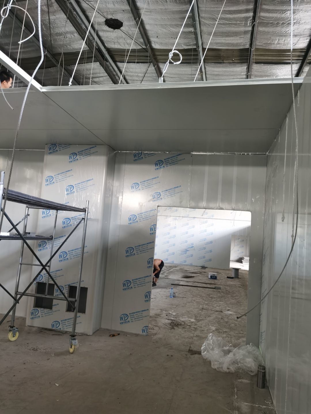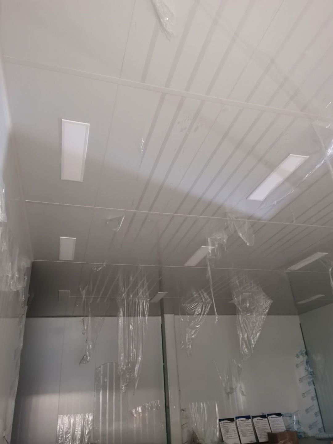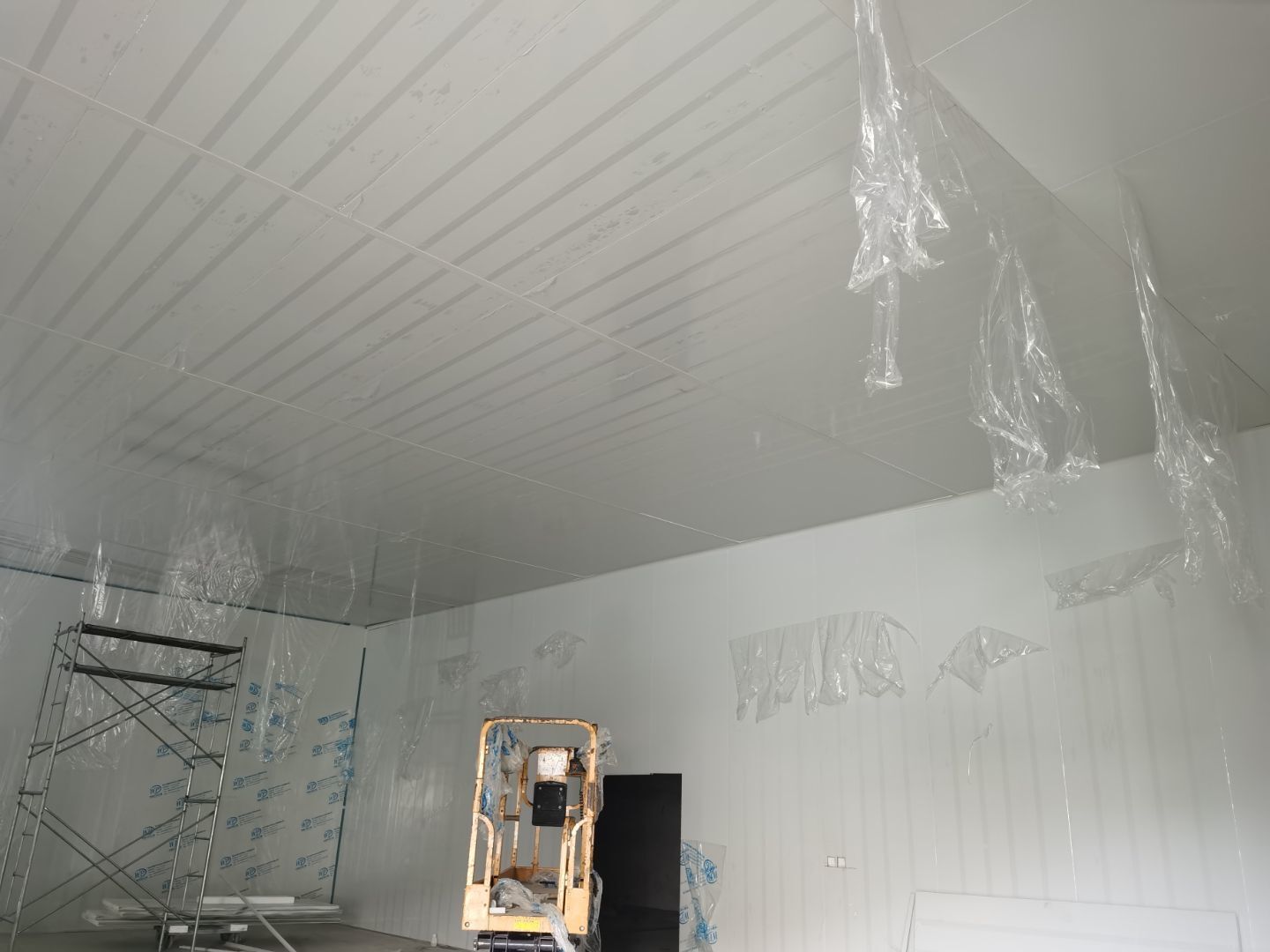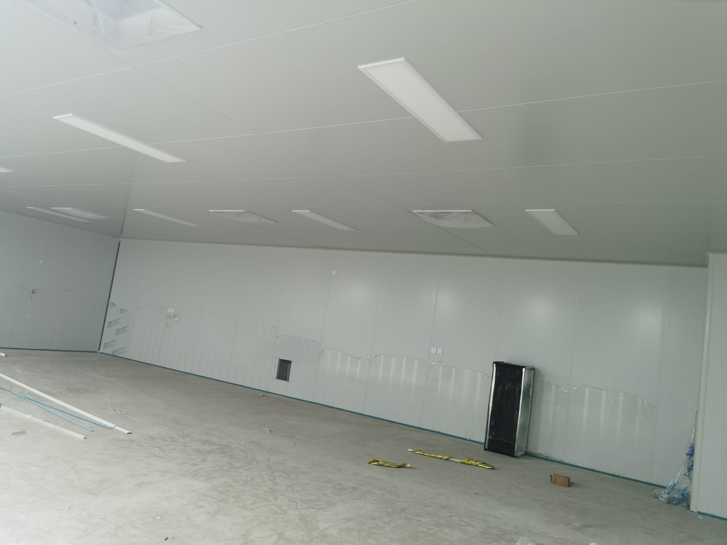 1,彩鋼墻板立板除預(yù)留設(shè)備外完成100% 2,彩鋼板吊頂除預(yù)留外,完成95% 3,三防板吊頂完成100% 4,水電安裝完成60% 5,彩鋼板收尾工作完成50%