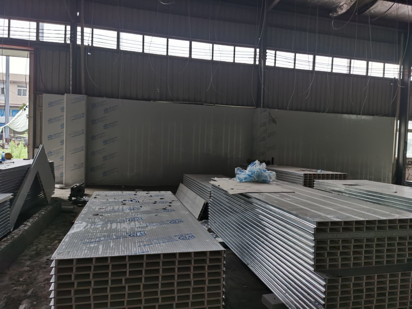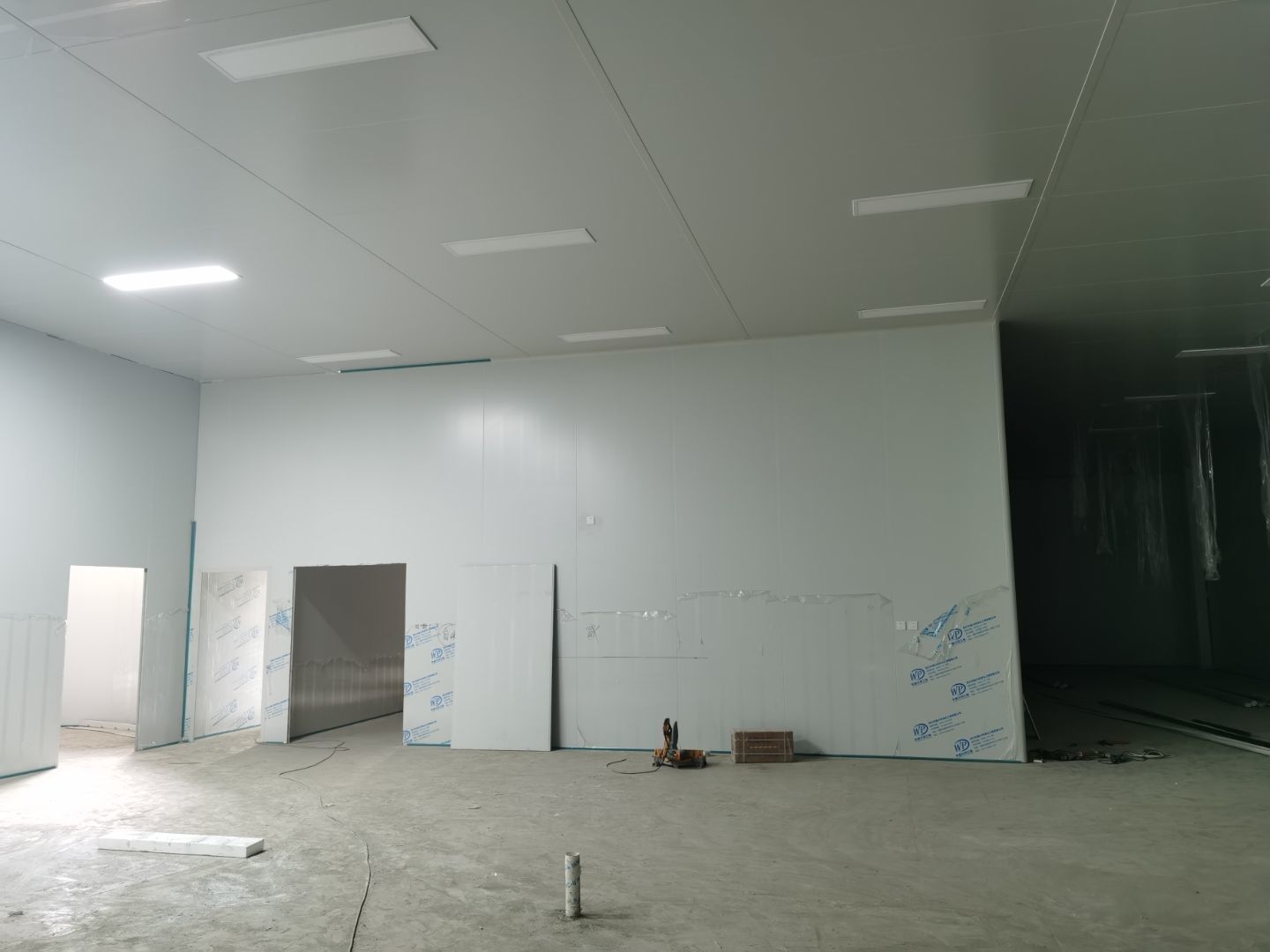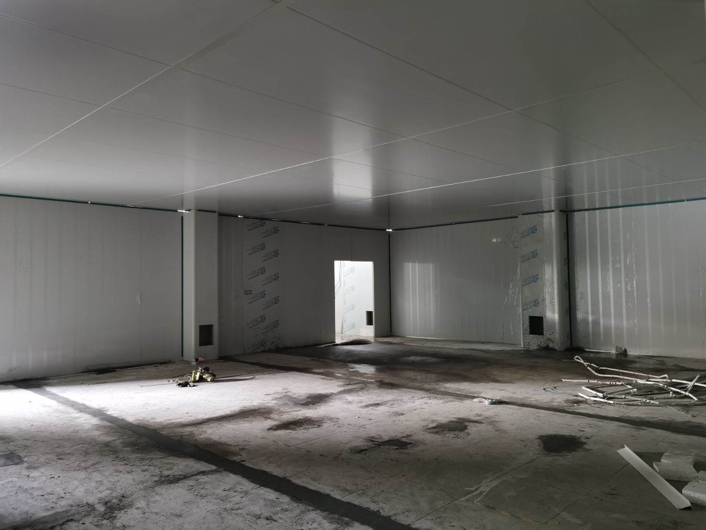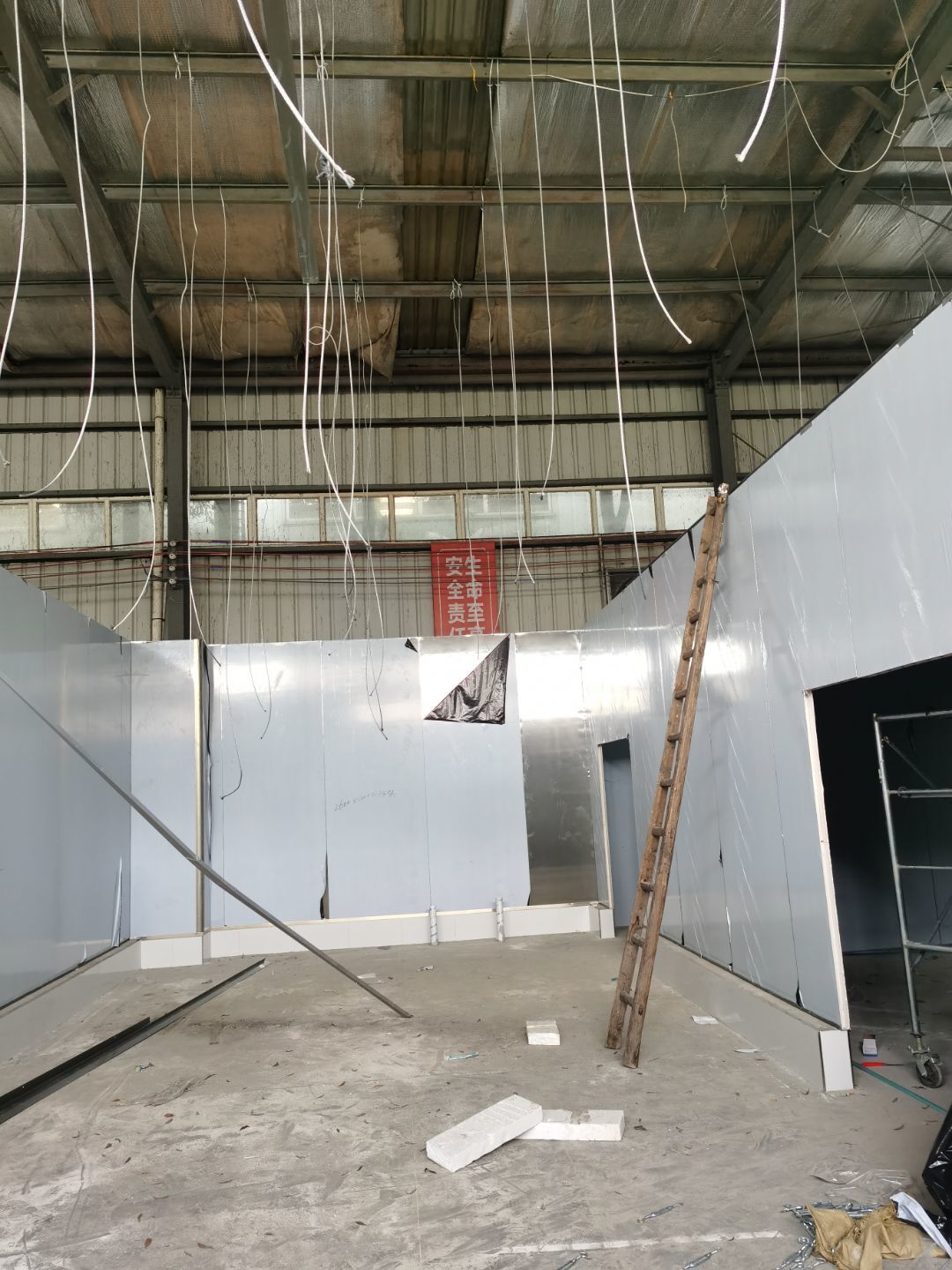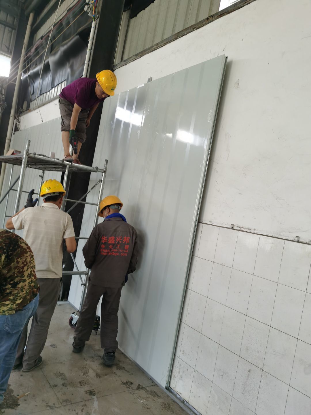 1,彩鋼墻板立板除預(yù)留設(shè)備外完成100% 2,彩鋼板吊頂除預(yù)留外,完成95% 3,三防板吊頂完成100% 4,水電安裝完成60% 5,彩鋼板收尾工作完成50%