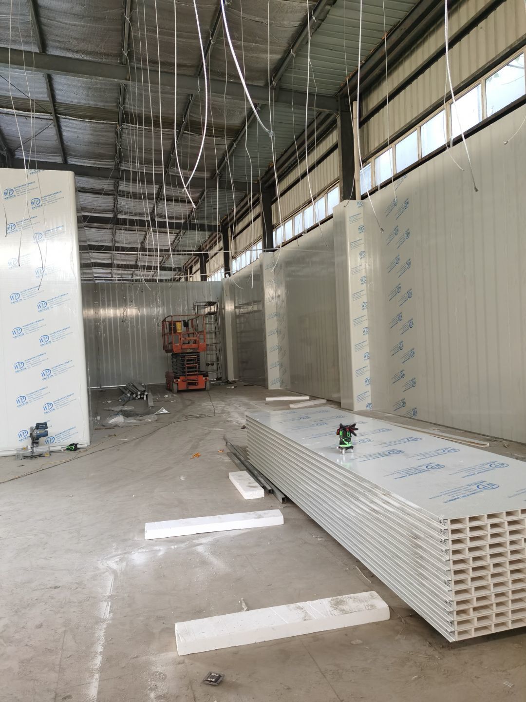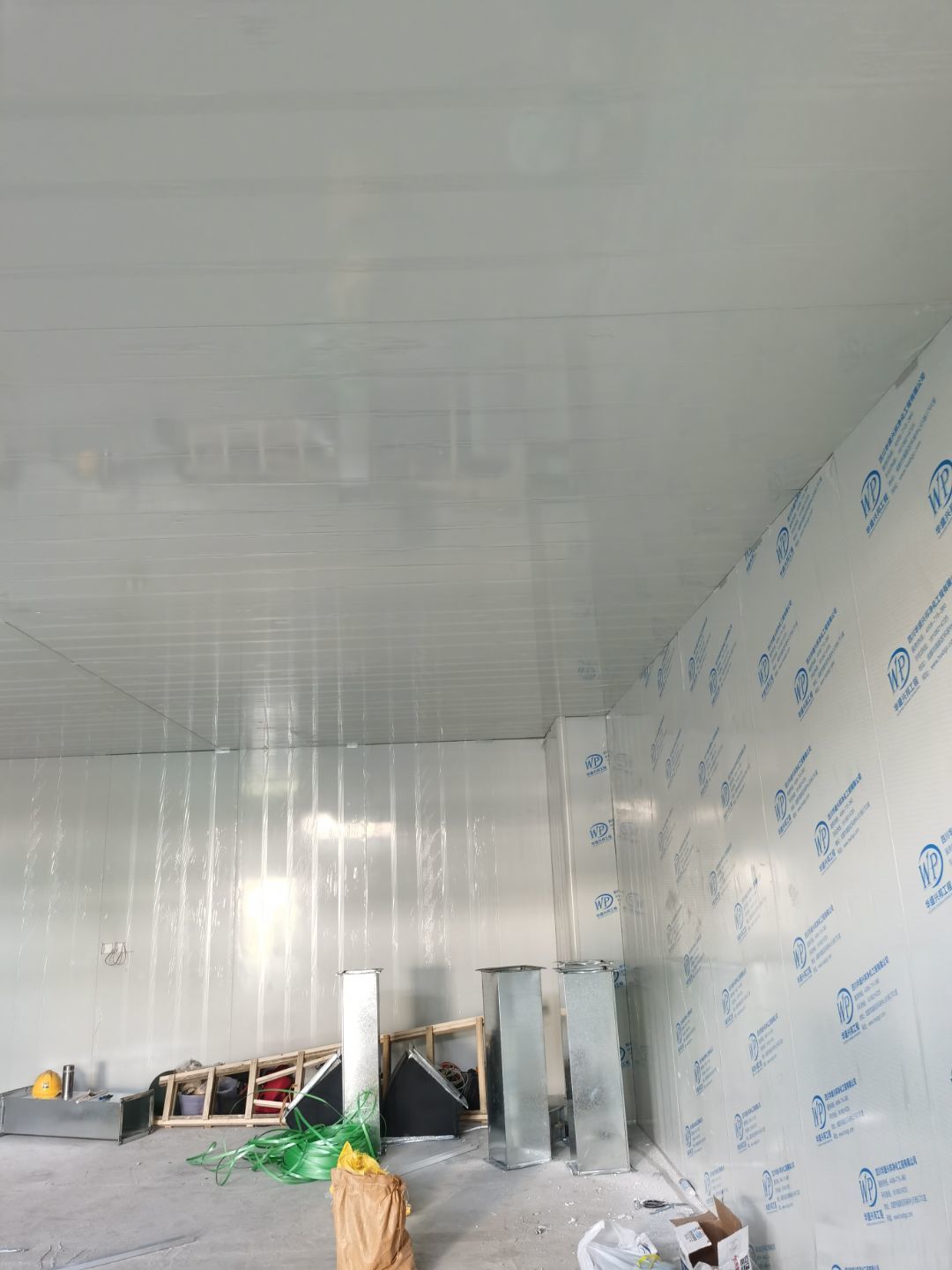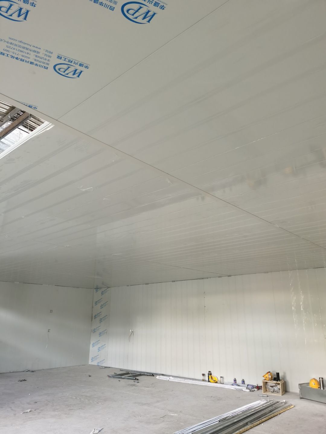 1,彩鋼墻板立板除預(yù)留設(shè)備外完成100% 2,彩鋼板吊頂除預(yù)留外,完成95% 3,三防板吊頂完成100% 4,水電安裝完成60% 5,彩鋼板收尾工作完成30%